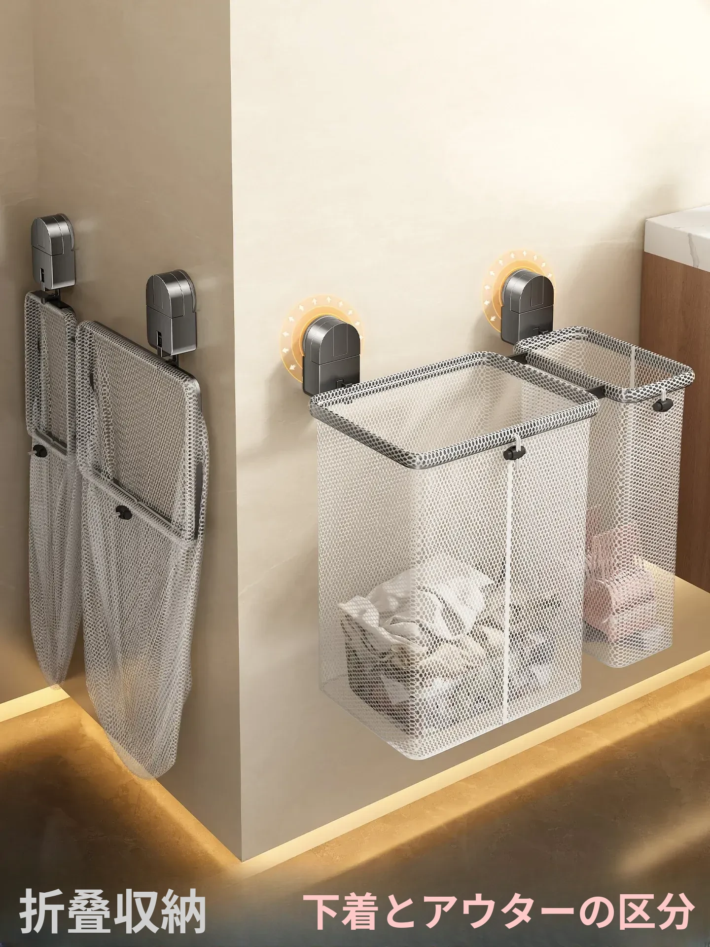 吸盤式折りたたみ式衣類収納バスケット - 家庭用の便利な洗濯かご!壁掛け可能で、スペースを有効活用できるおしゃれなデザイン。洗濯物をスッキリ整理して、毎日の家事を楽にしましょう!