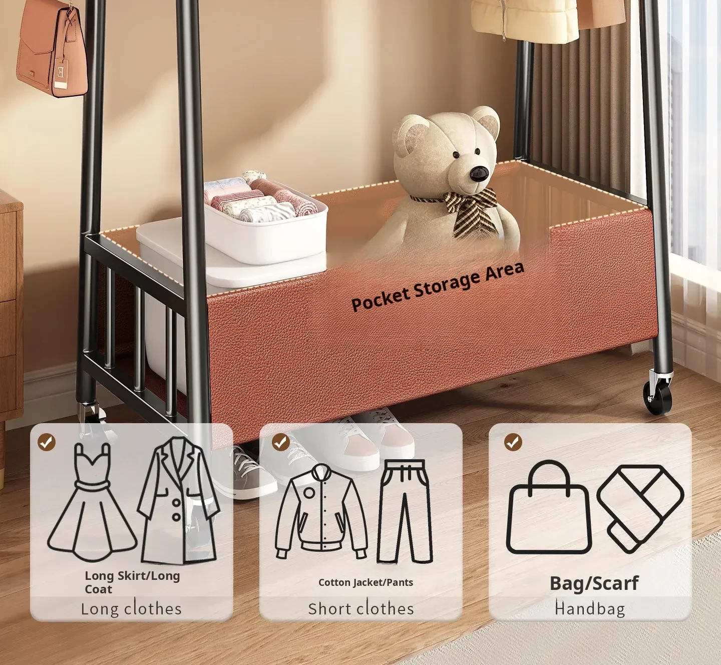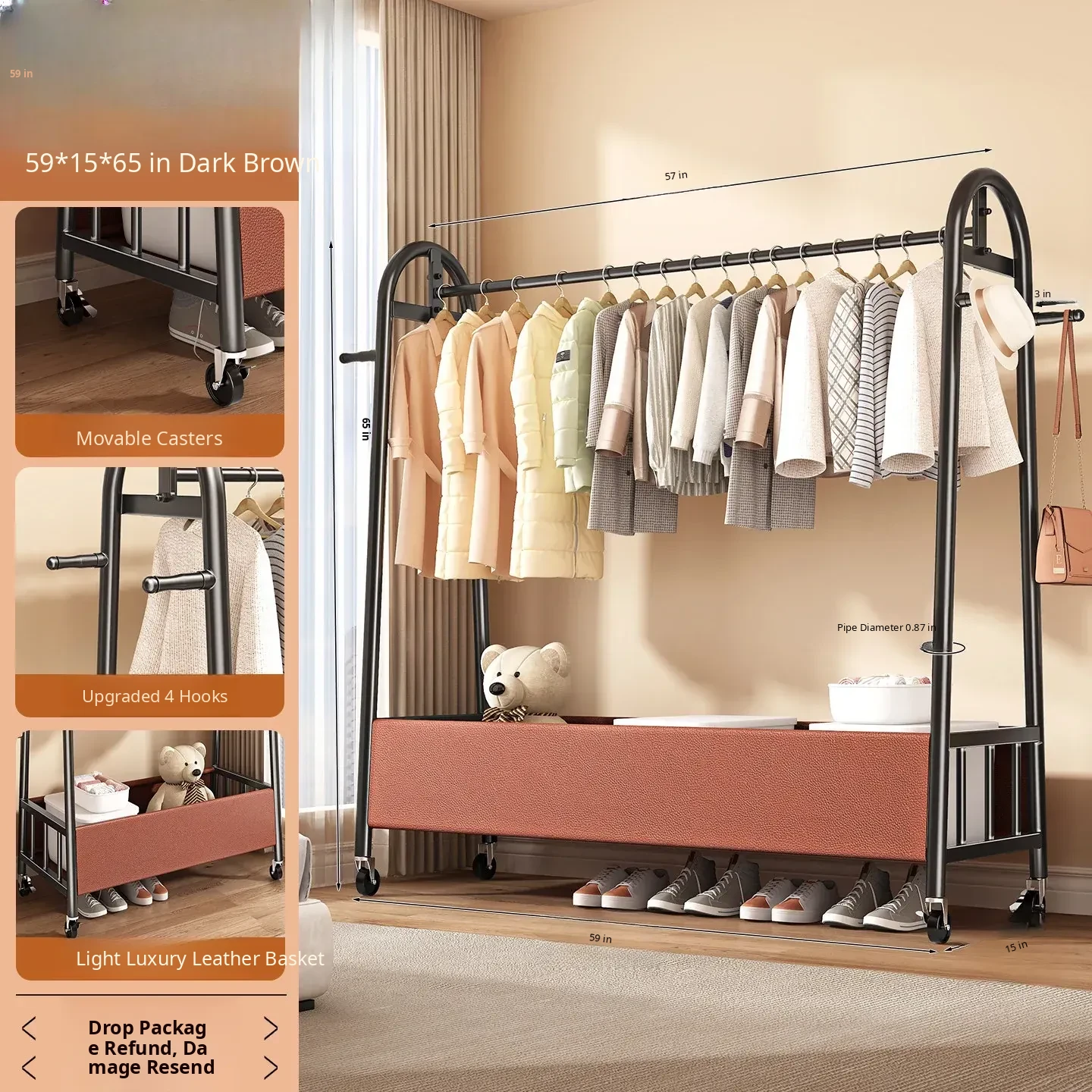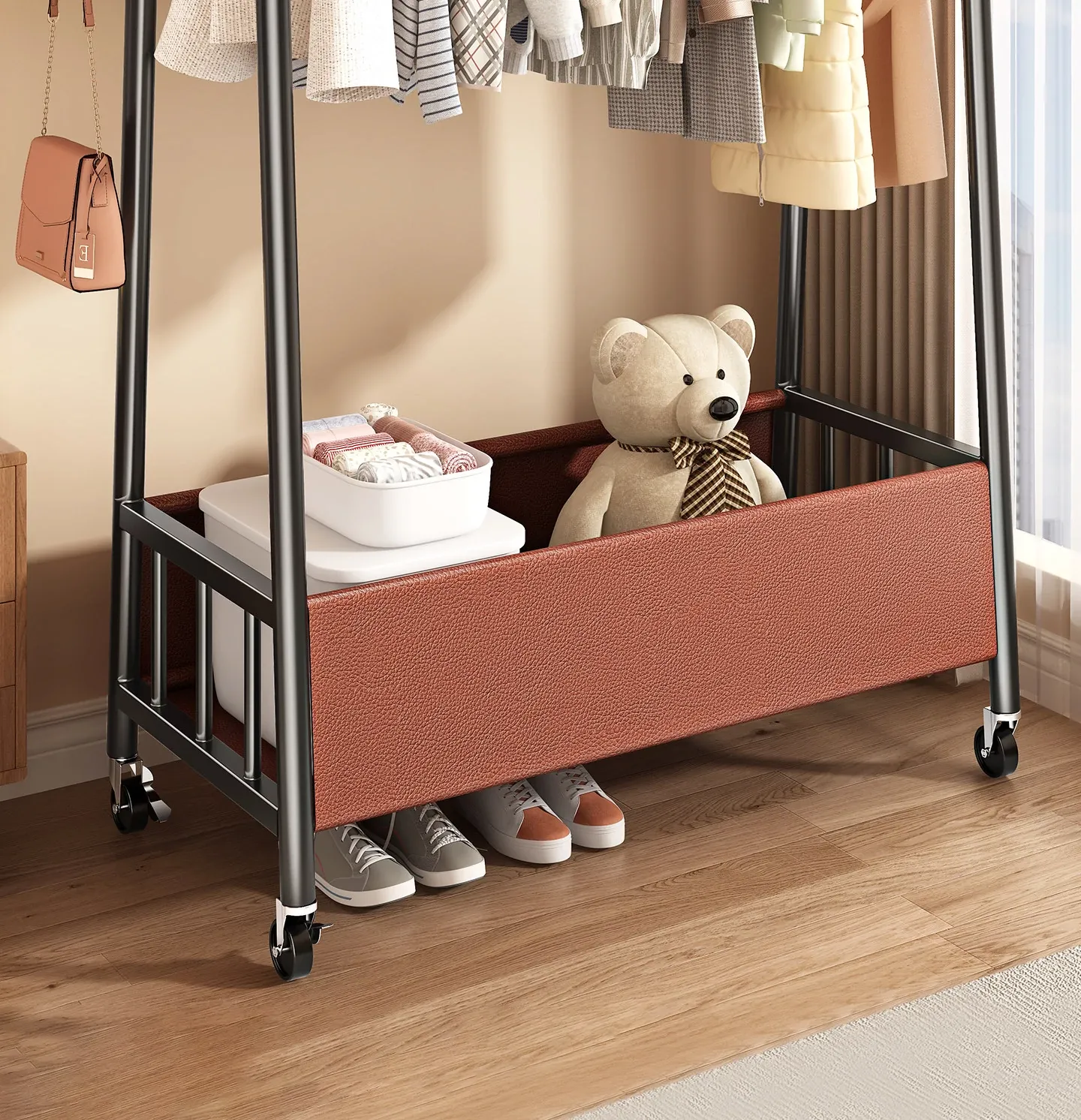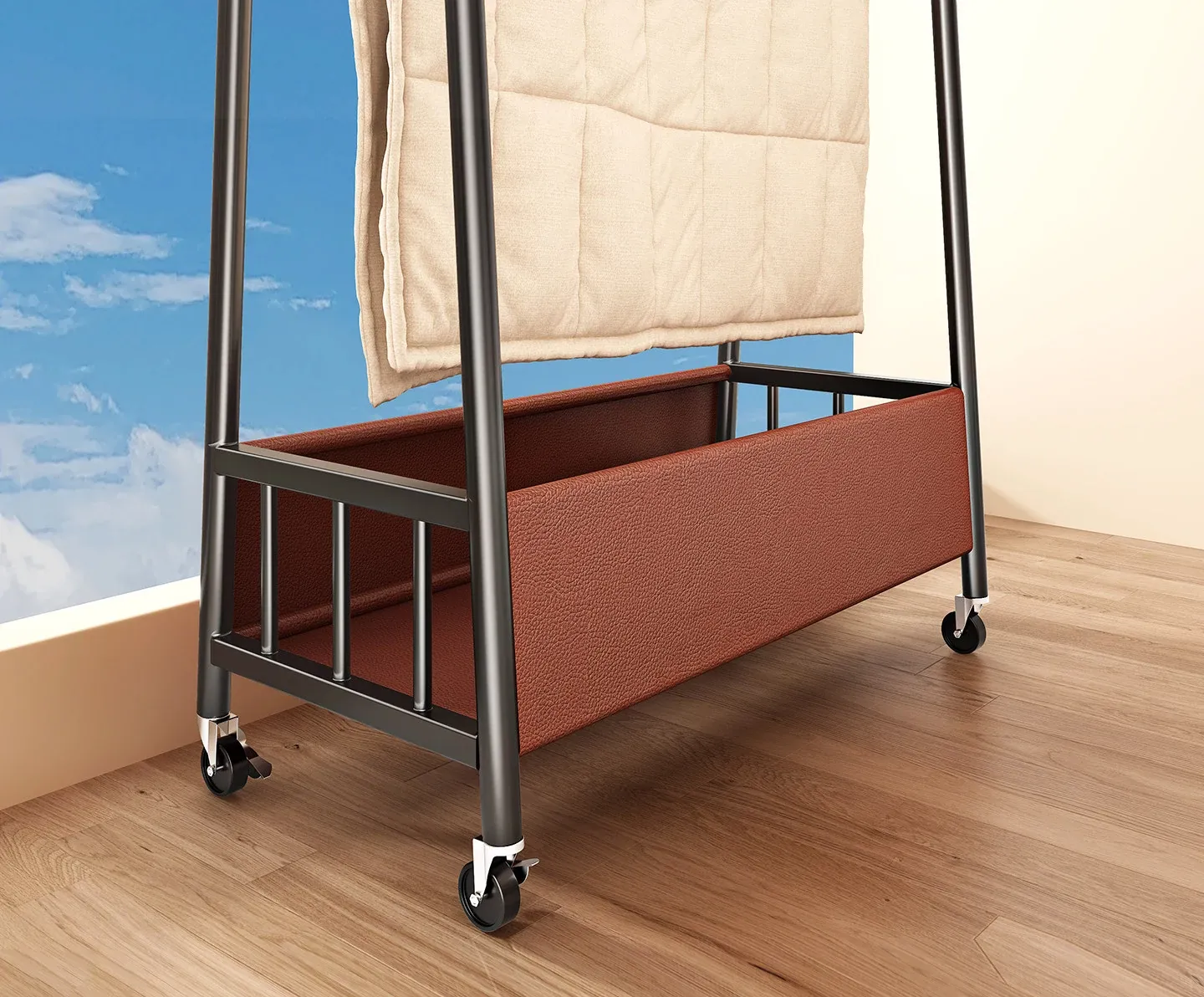 [Thick Steel Pipe] Black Brown 59.06in❤Leather Pocket Storage + Hook + Free Universal Wheels "2026 High-Quality Products"