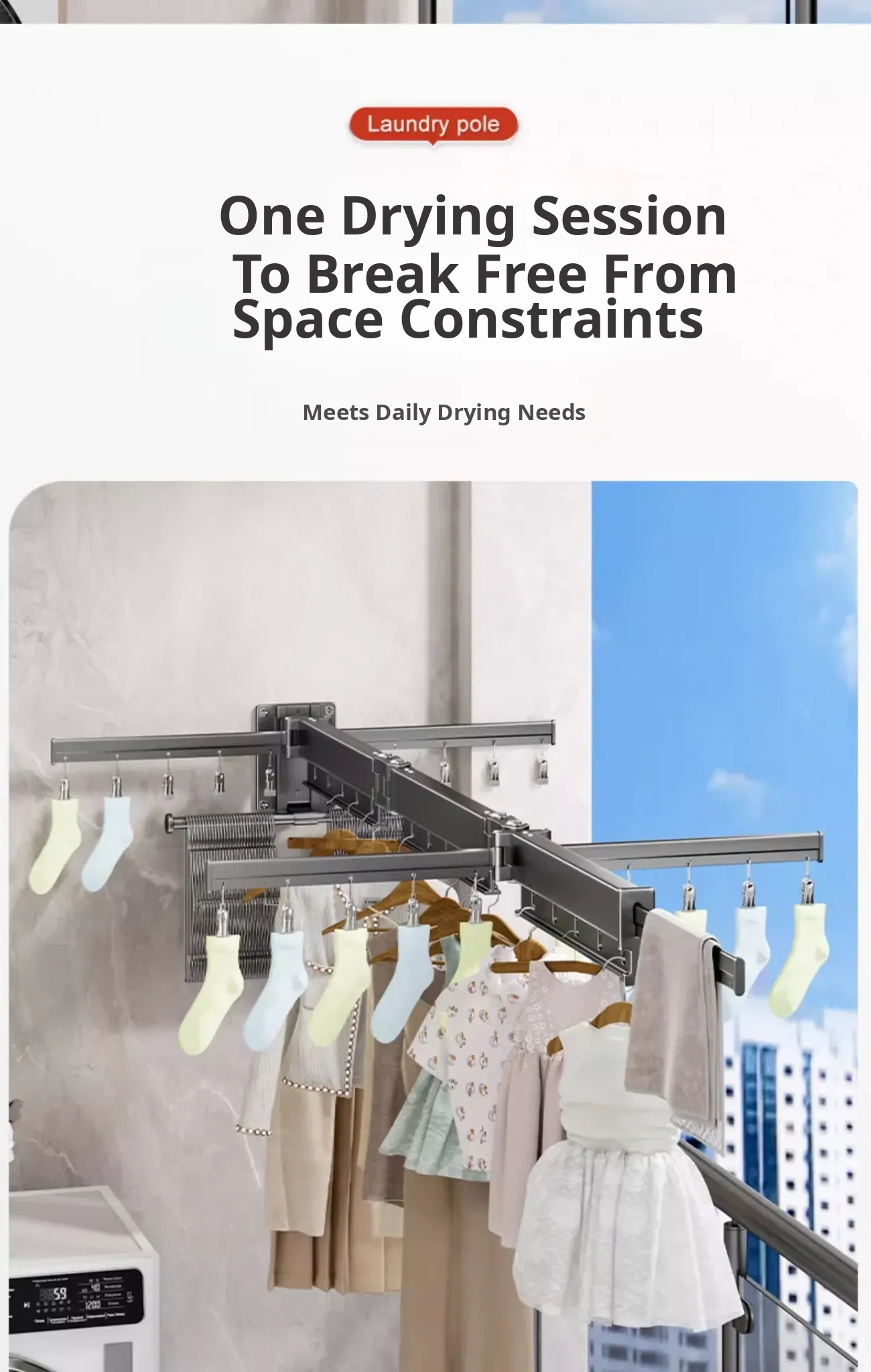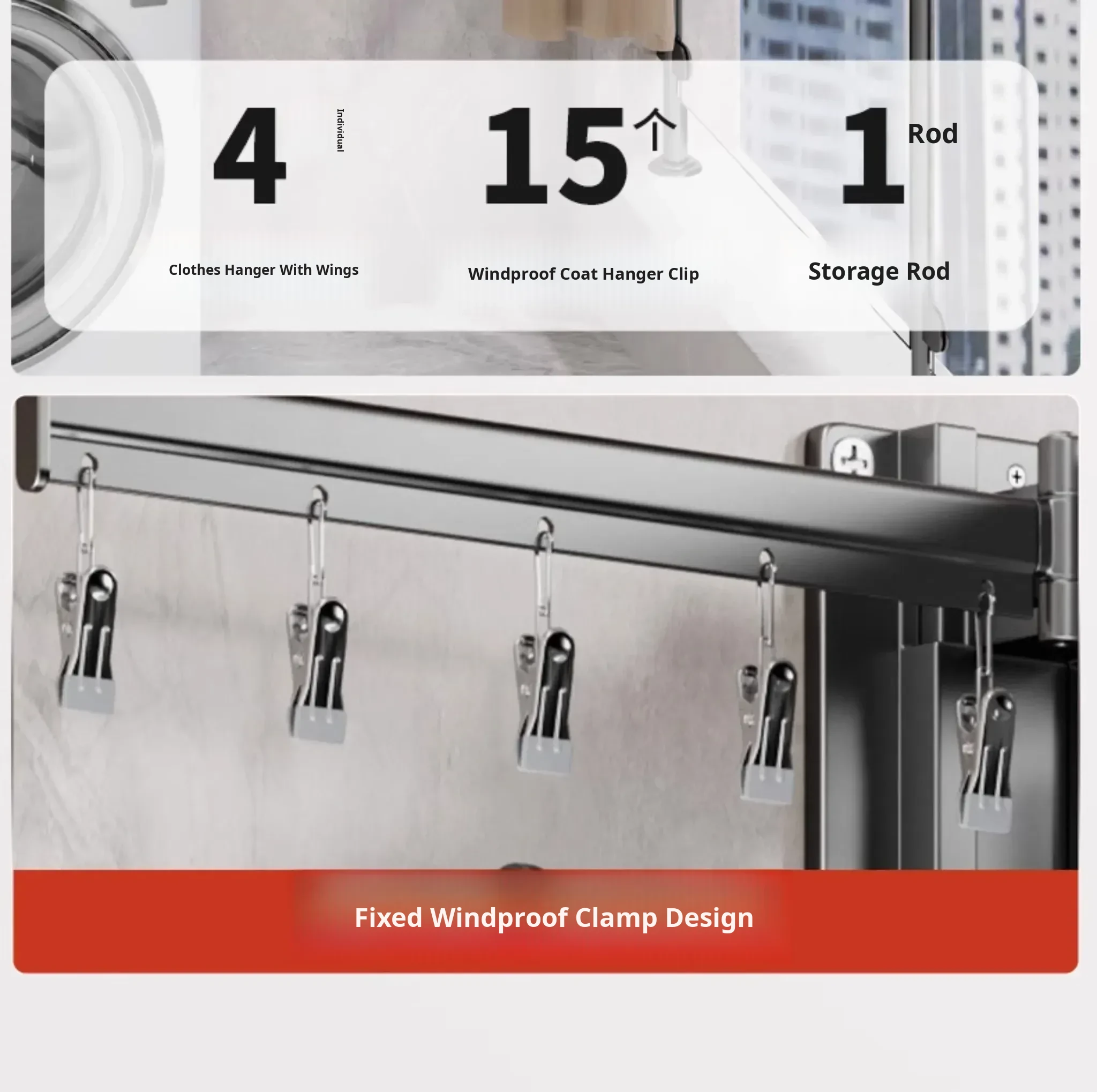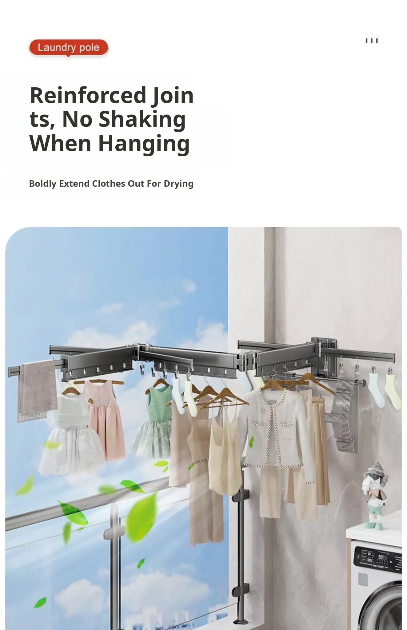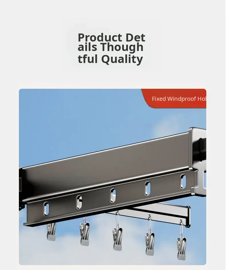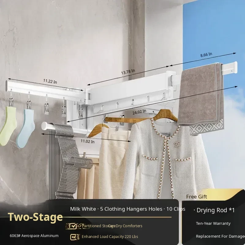 Milk White 2 Sections [No Installation] 5 Windproof Holes + Clothes and Socks Rod + Clothes Hanger Storage Rod