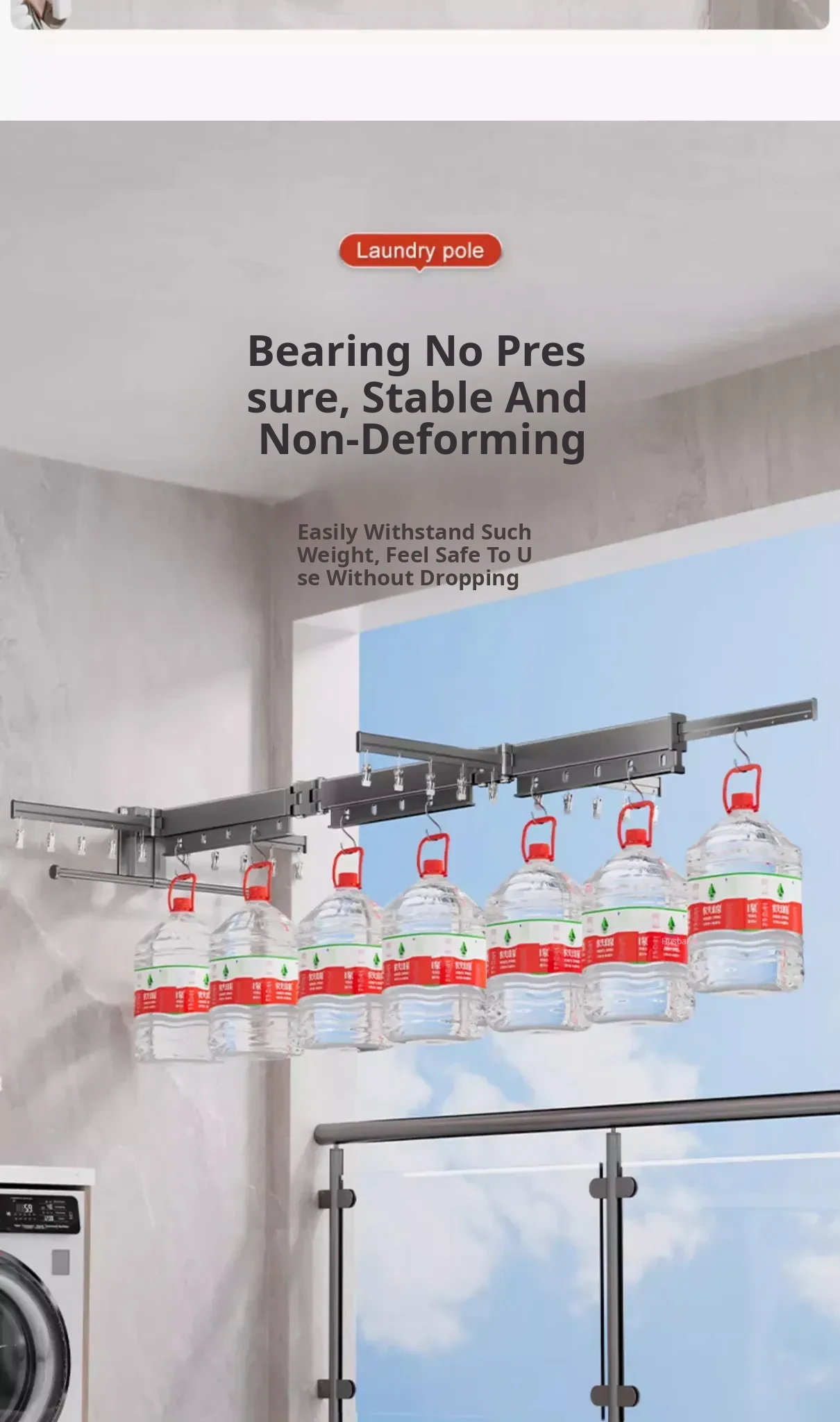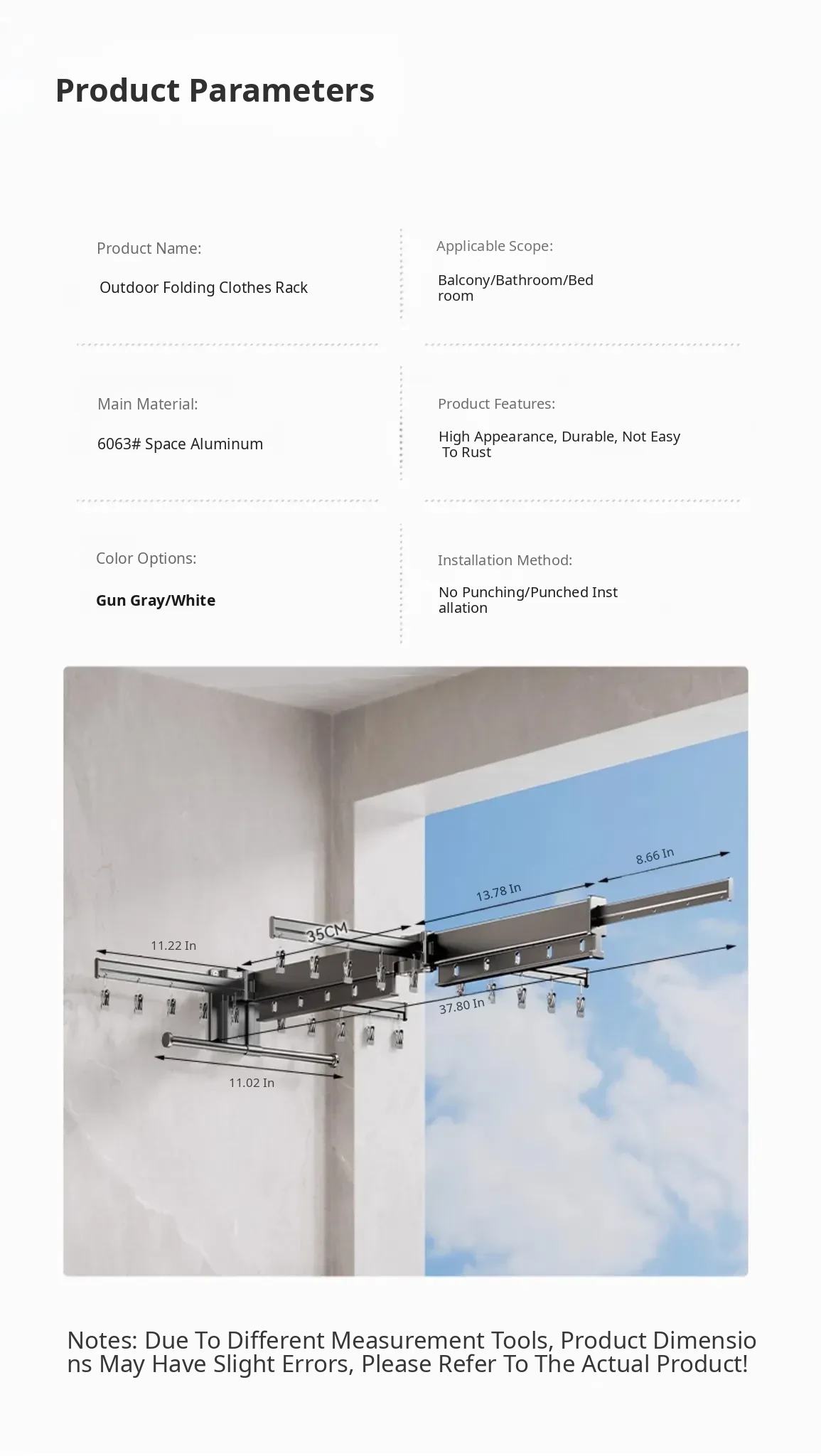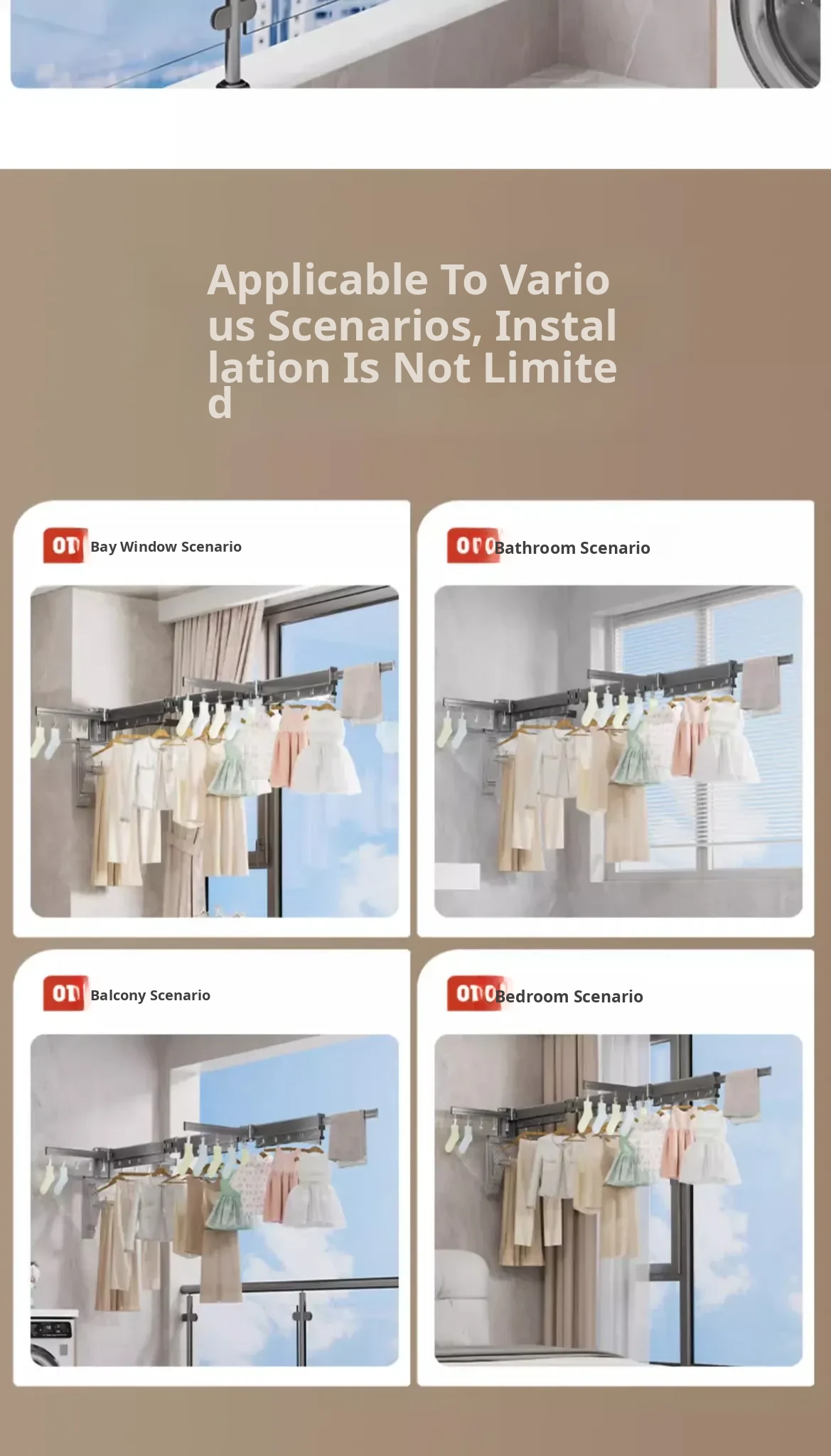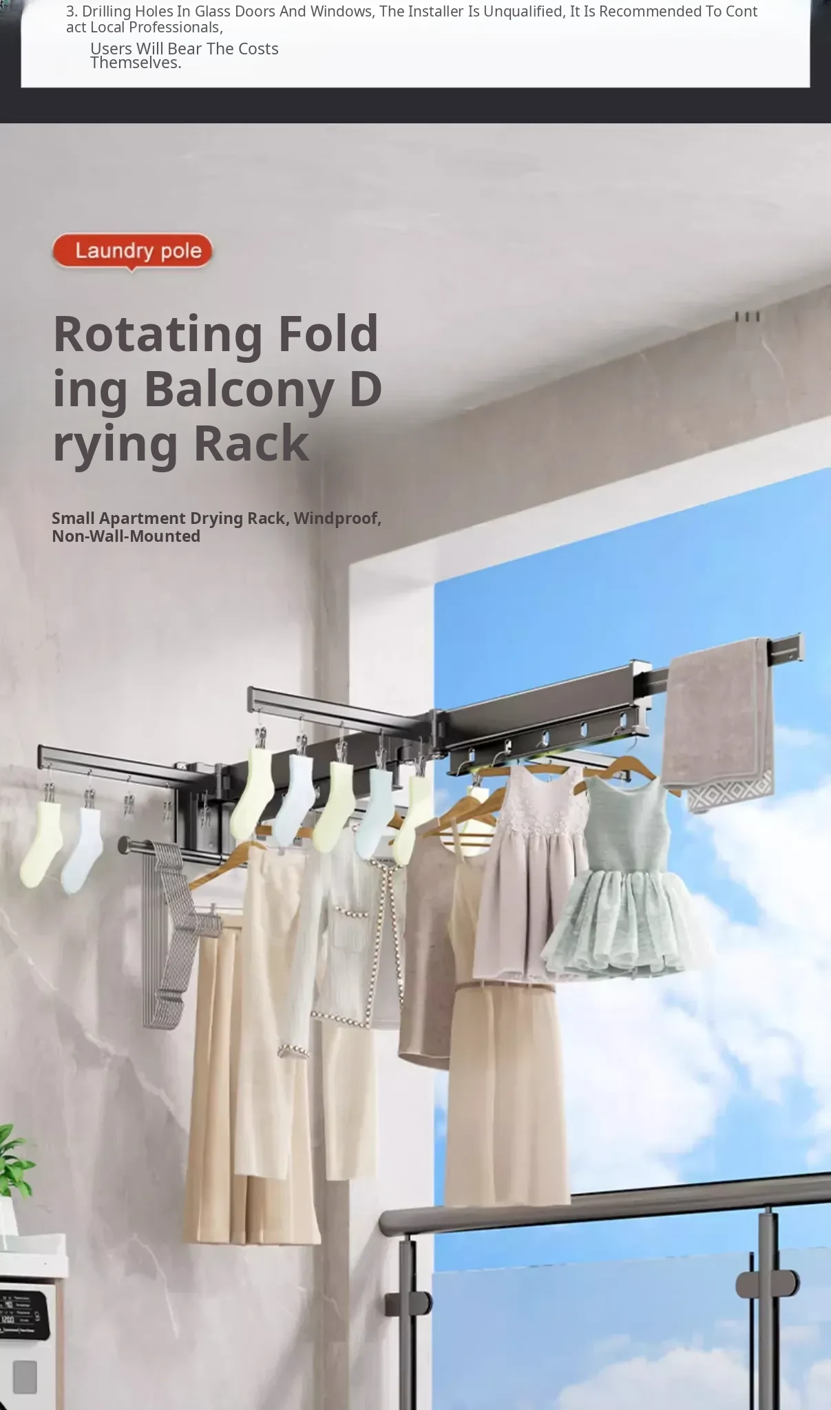 Milk White 2 Sections [No Installation] 5 Windproof Holes + Clothes and Socks Rod + Clothes Hanger Storage Rod