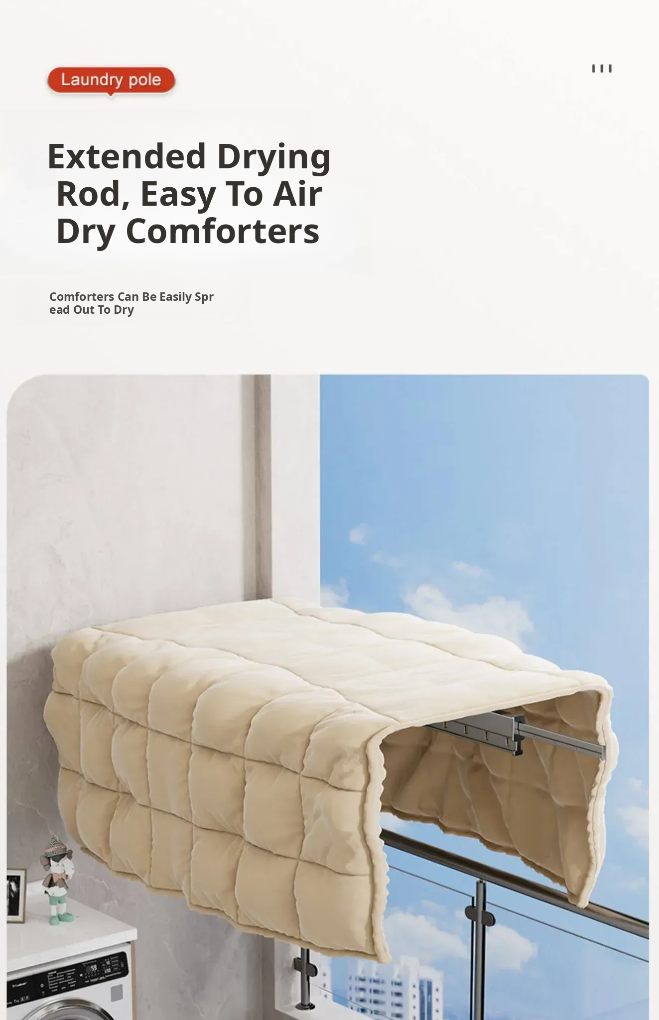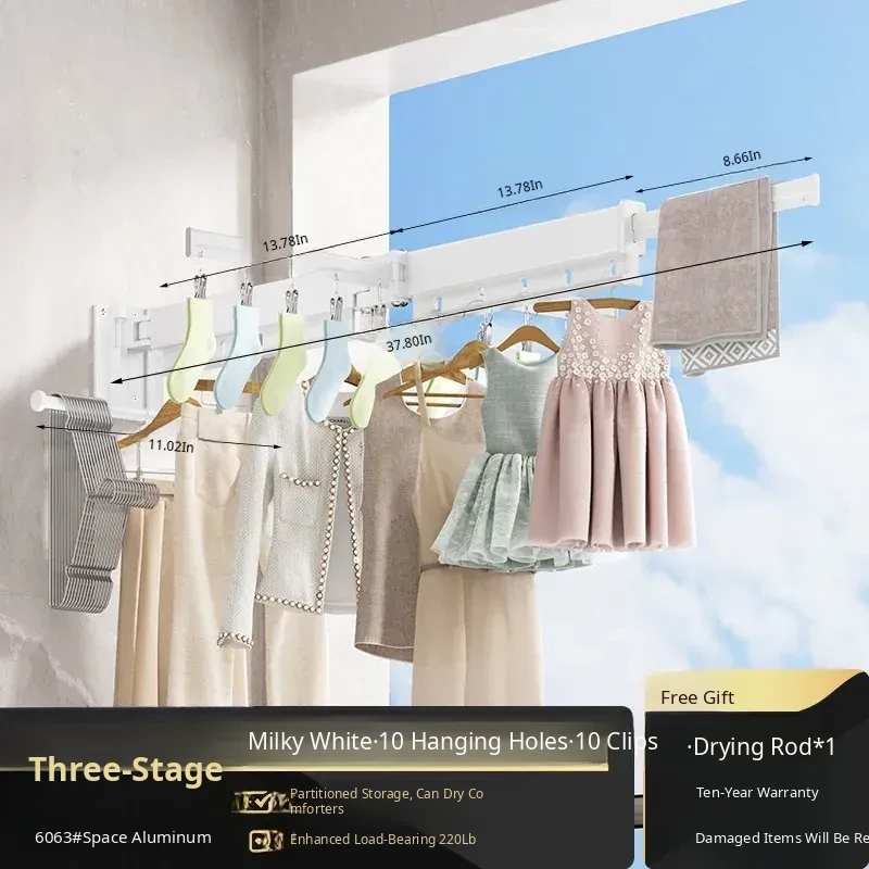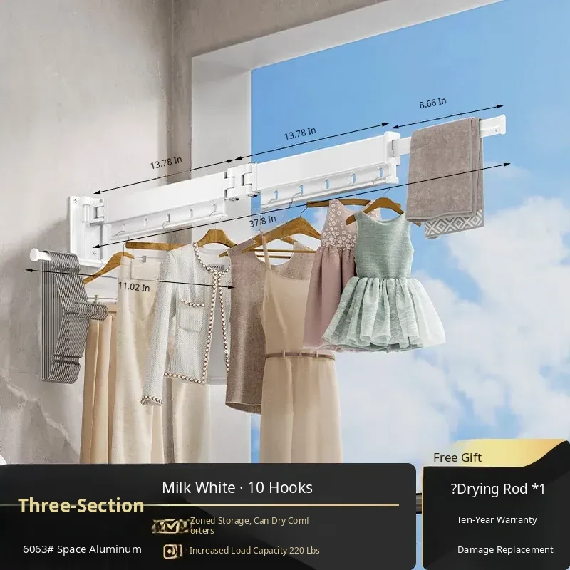 Milk White 3 Sections [No Installation] 10 Windproof Holes + Clothes and Socks Rod + Clothes Hanger Storage Rod