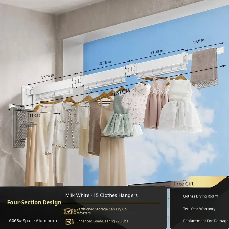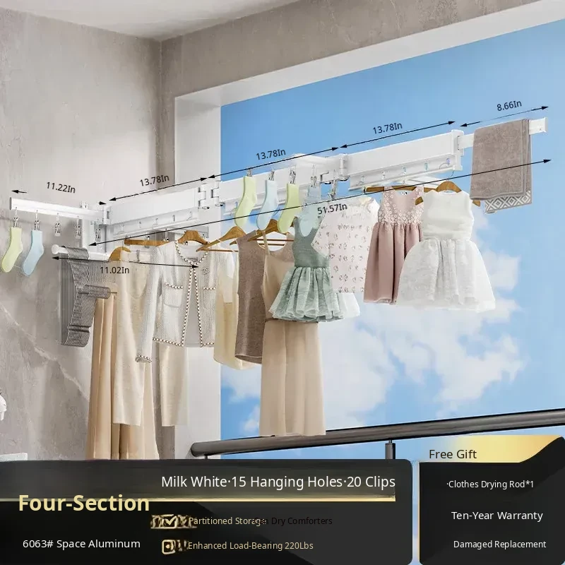 Milk White 4 Sections [No Installation] 15 Windproof Holes + Clothes and Socks Rod + Clothes Hanger Storage Rod