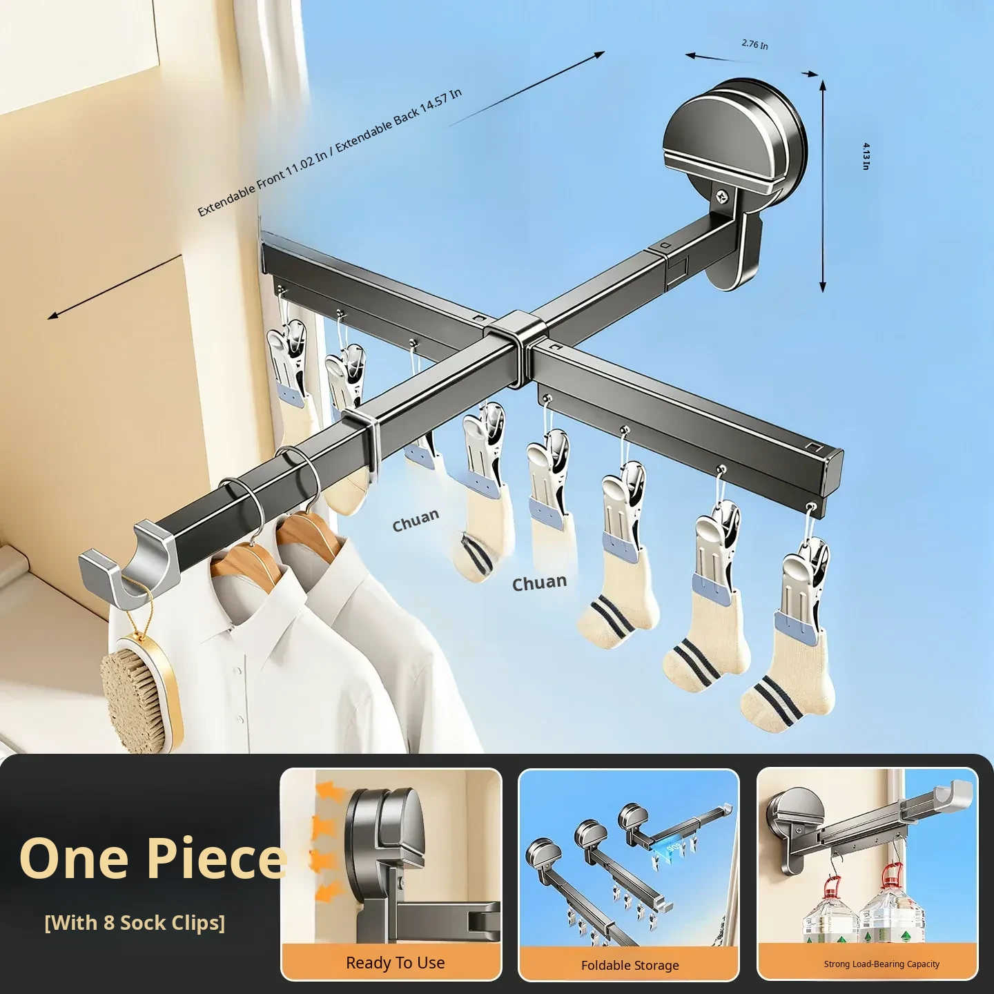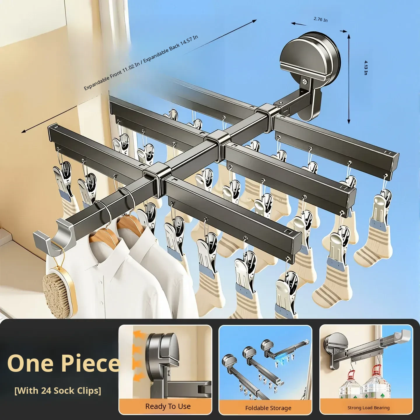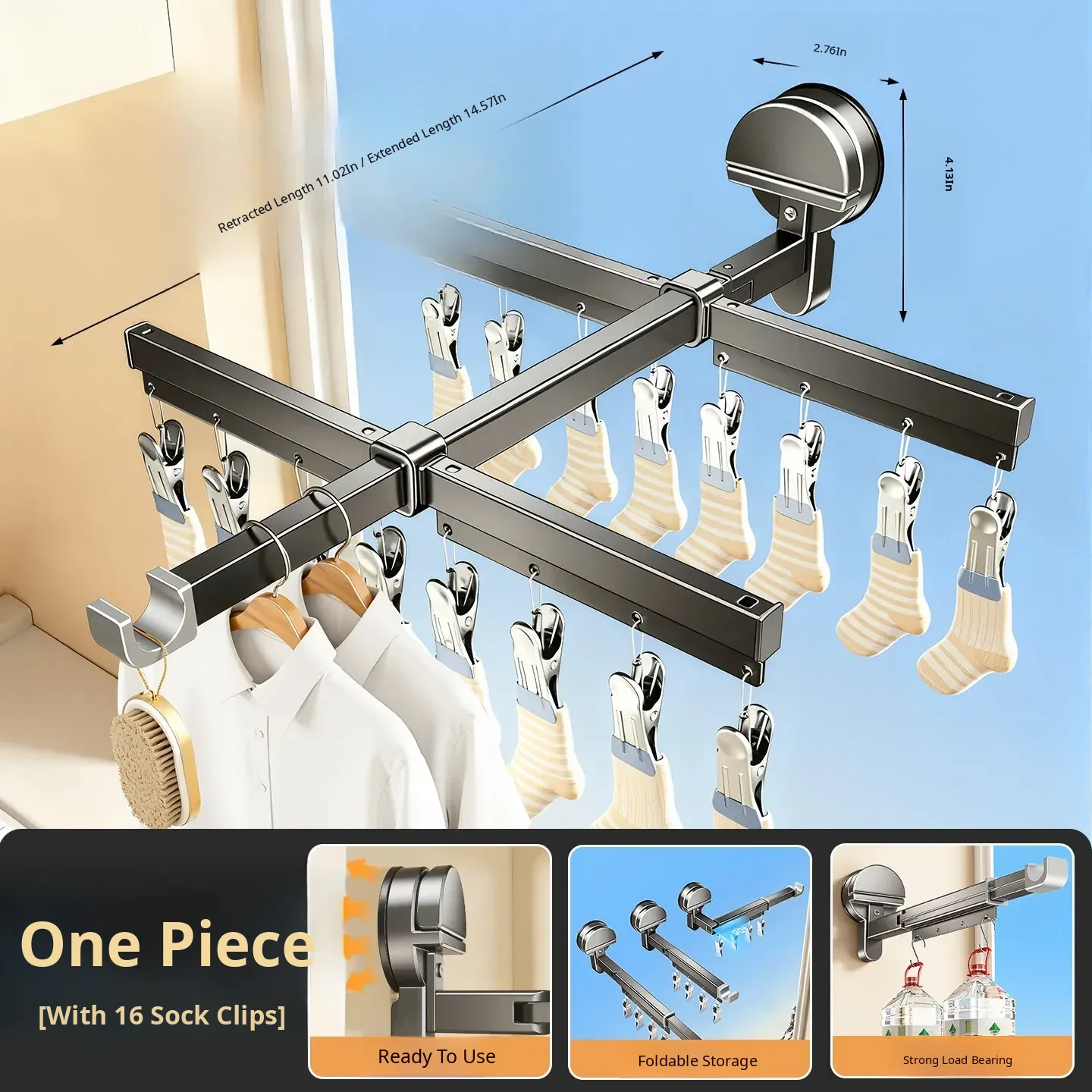 [Gun Ash] Powerful Suction Cup Clothes Drying Rack [Rod Length 11.02in-14.57in]