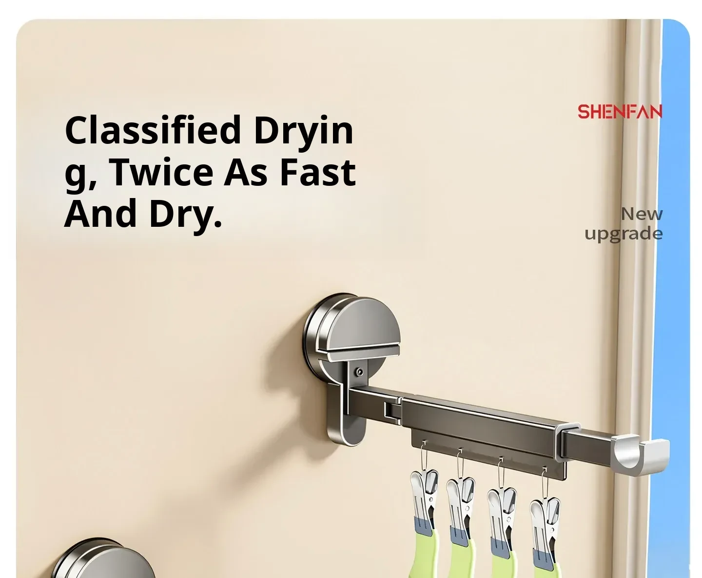 [Gun Ash] Powerful Suction Cup Clothes Drying Rack with 16 Clips - Double Pole