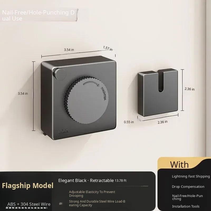 [Black Flagship Model] Indoor and Outdoor Universal Punch-Free Retractable 165.35in Stainless Steel Rope