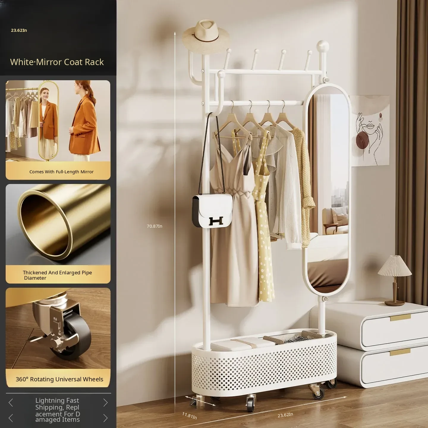 Small, Stylish White 23.62in [Rotating Mirror - Large Storage Basket - Universal Wheels]
