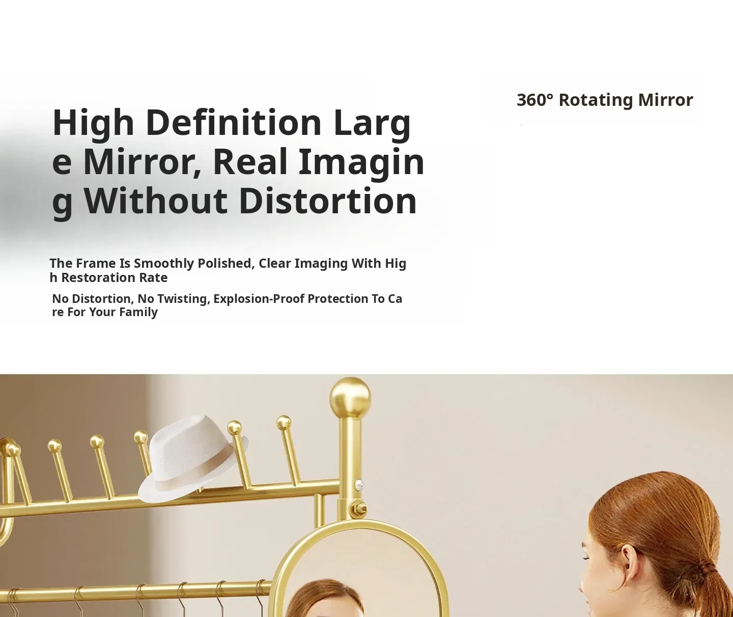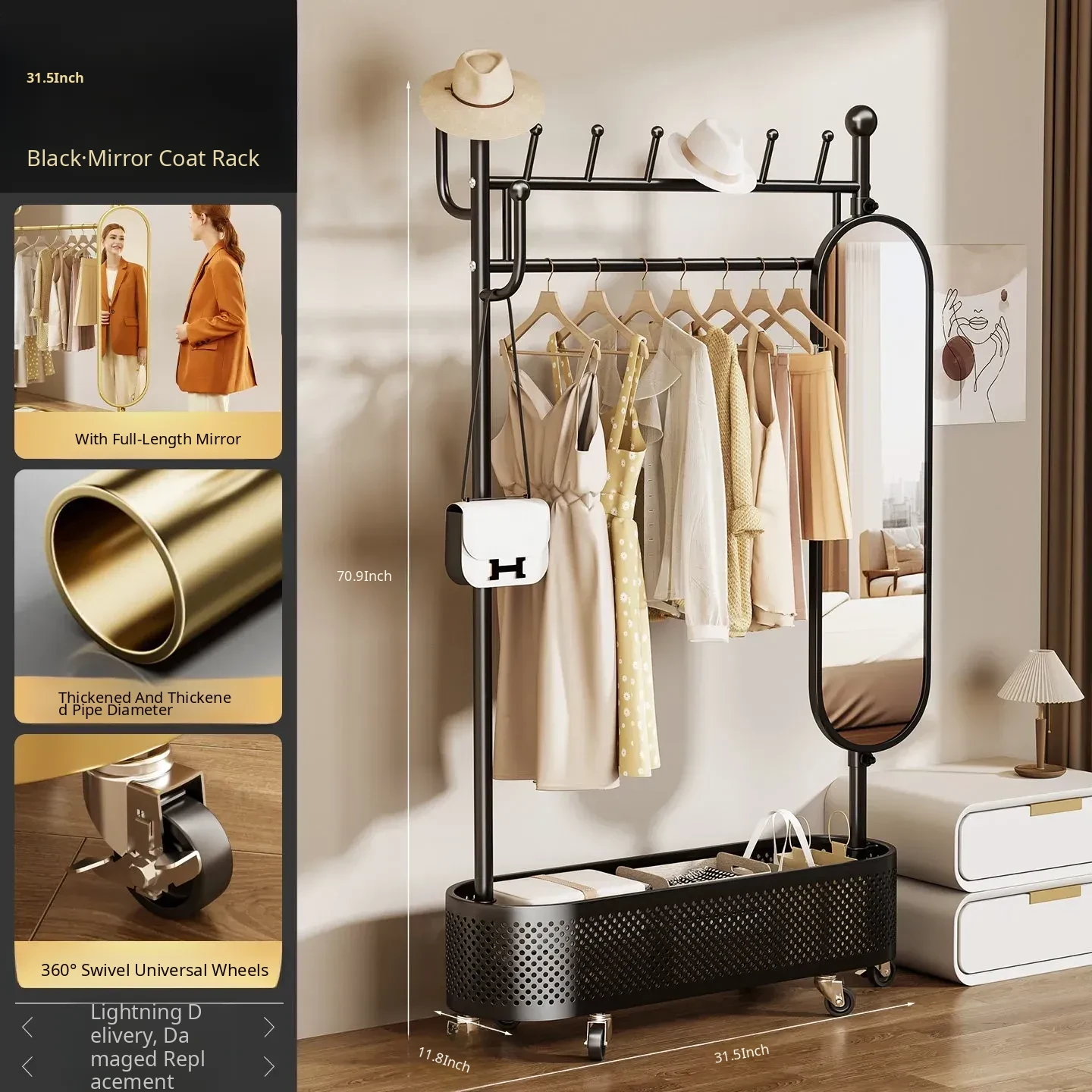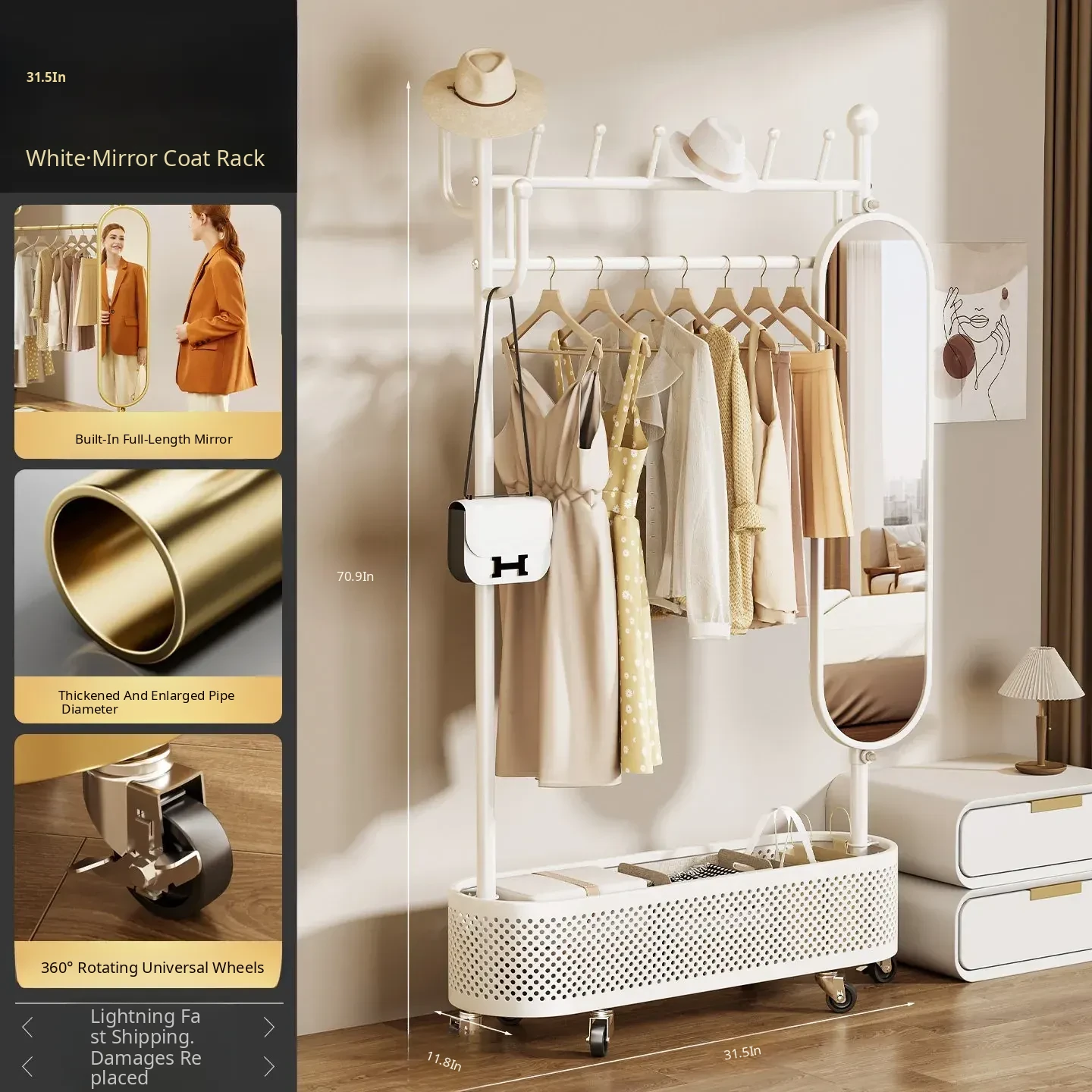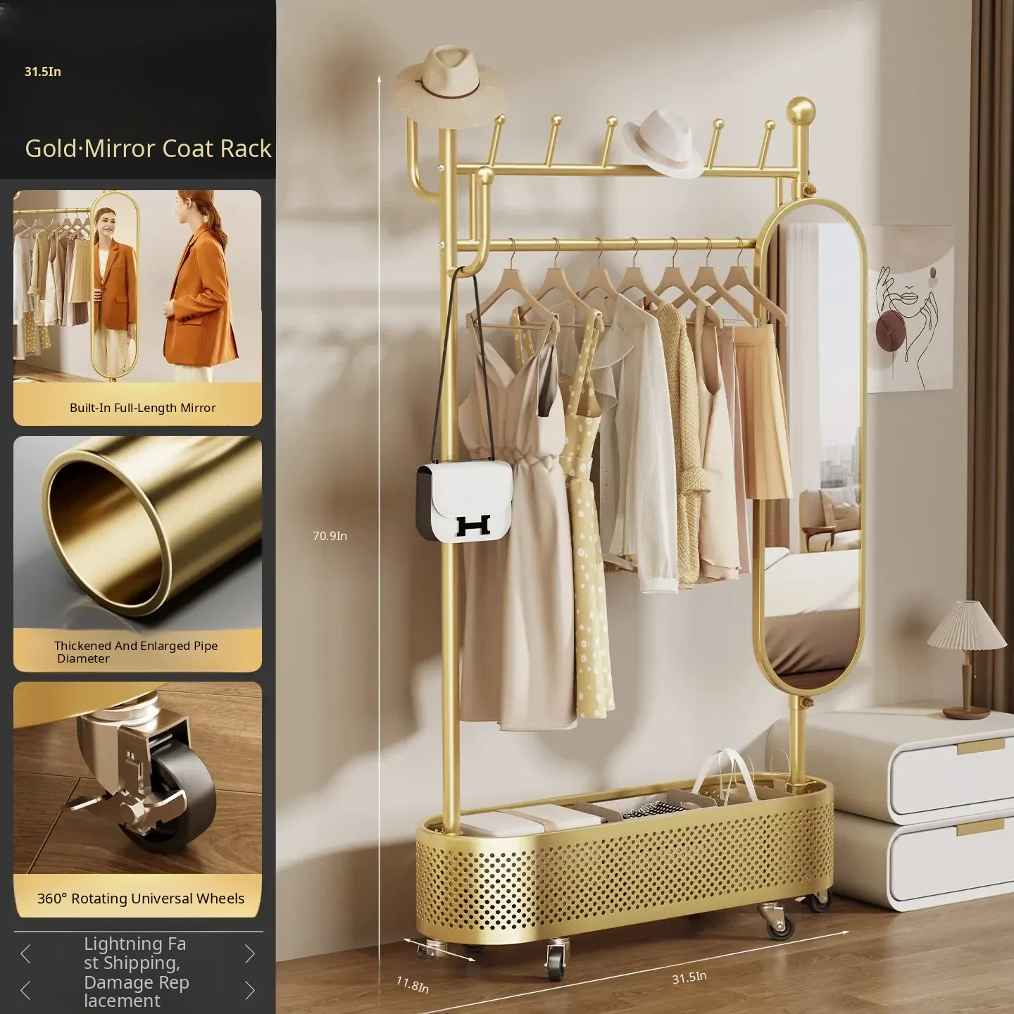Medium-Sized, Light Luxury Gold 31.50in [Rotating Mirror - Large Storage Basket - Universal Wheels]