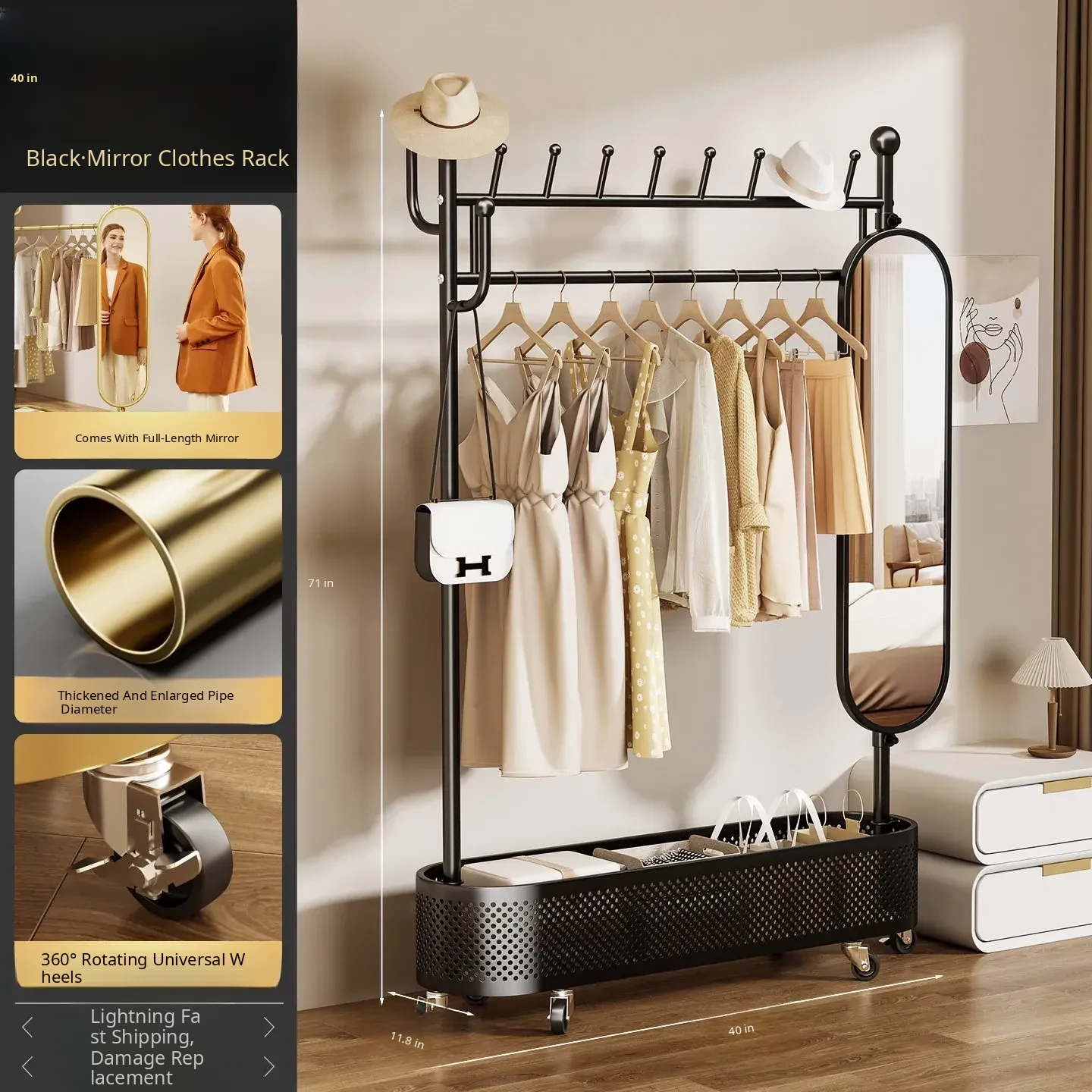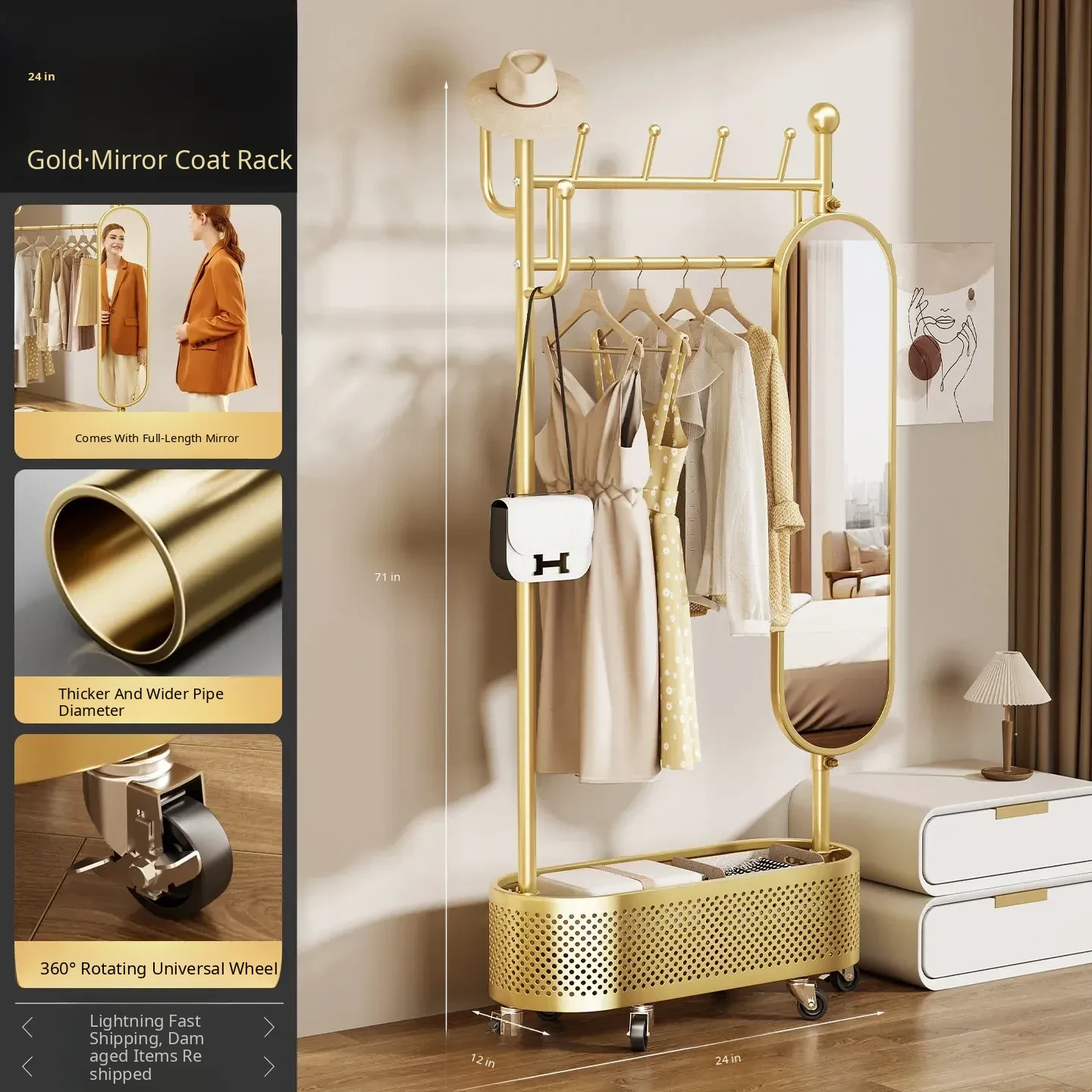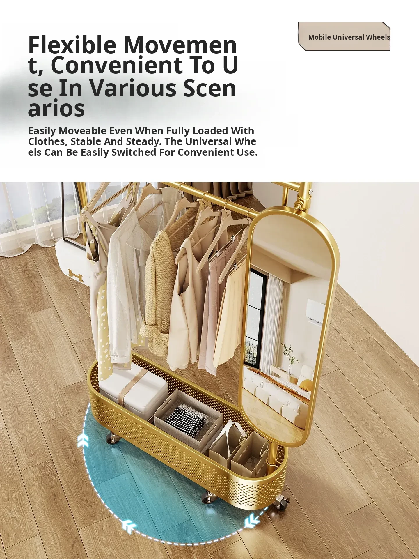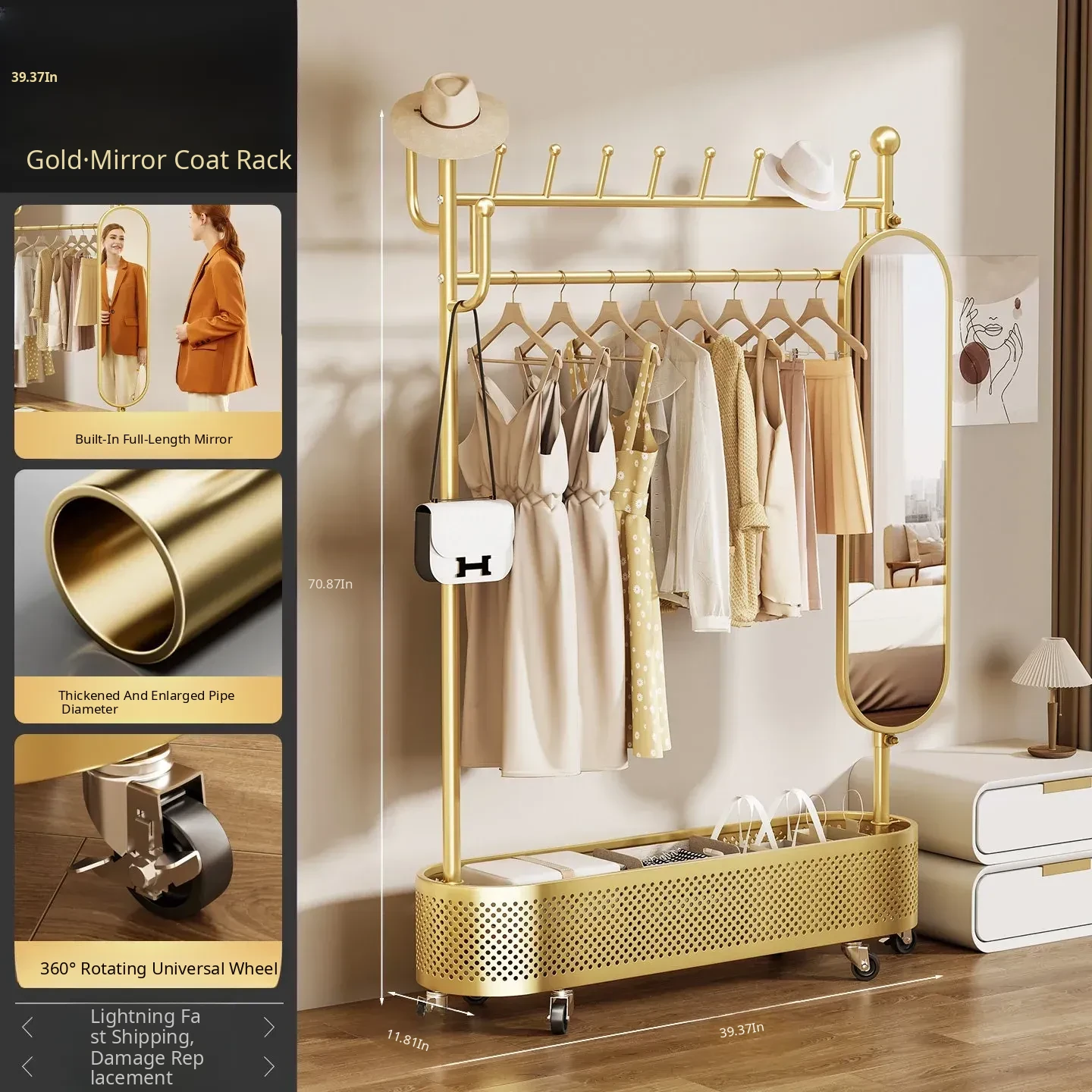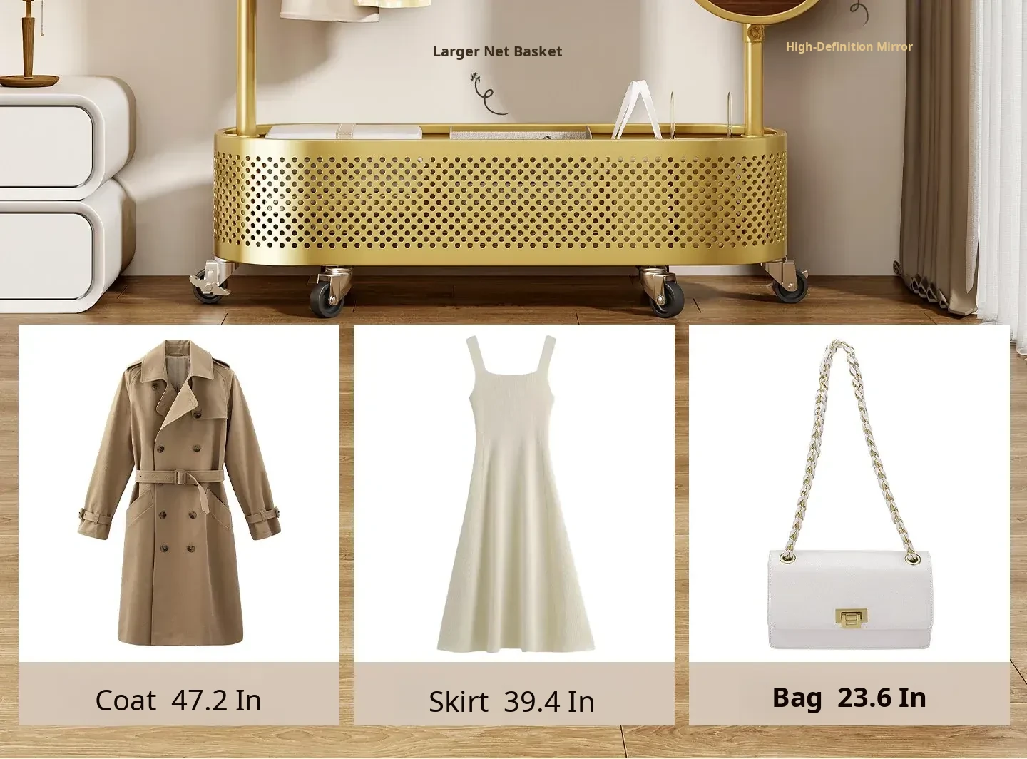 Large Light Luxury Gold 39.37in [Rotatable Mirror-Large Storage Basket-Swivel Wheels]