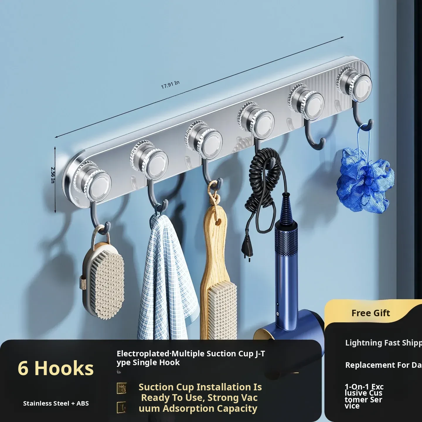 Mirror Stainless Steel Gray Drain 6 Hooks (6 Suction Cups)