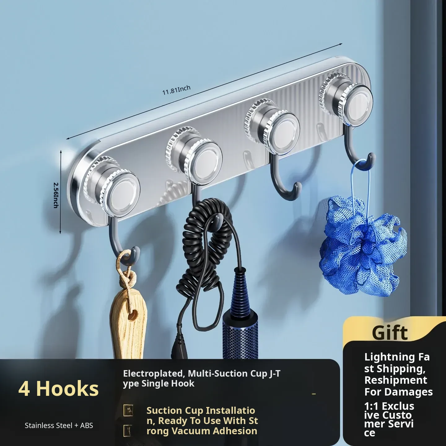 Mirror Stainless Steel Gray Drain 4 Hooks (4 Suction Cups)