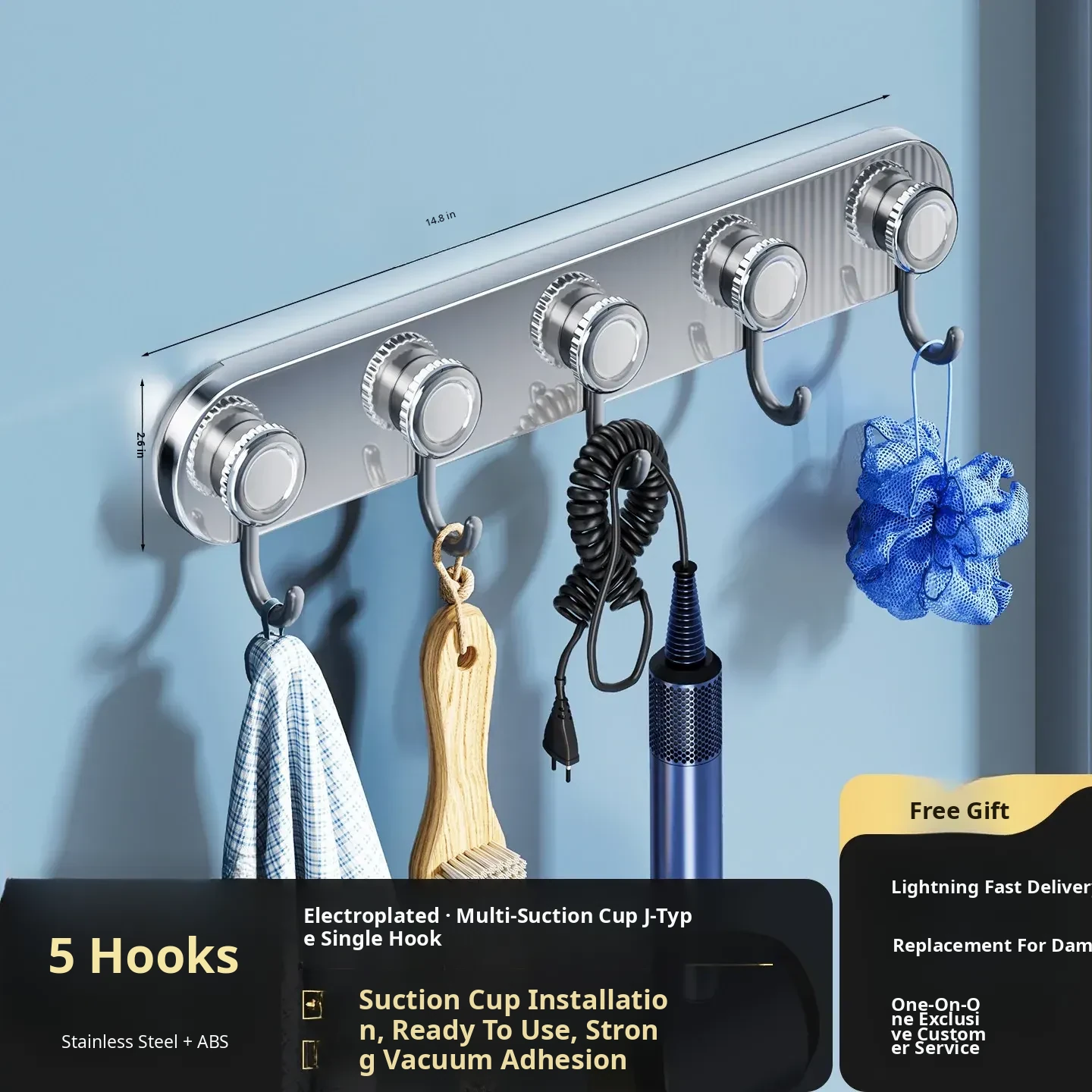Mirror Stainless Steel Gray Drain with 5 Hooks (5 Suction Cups)
