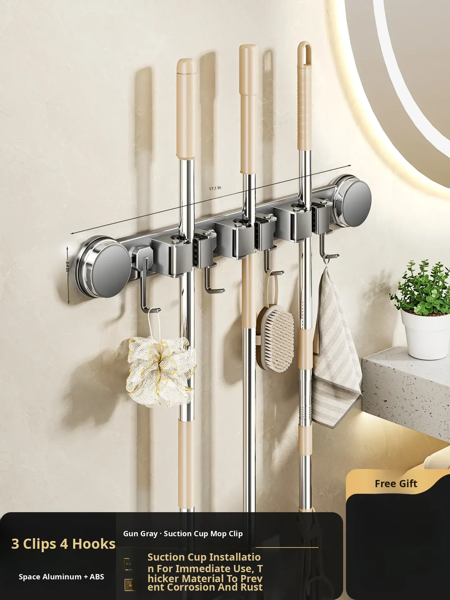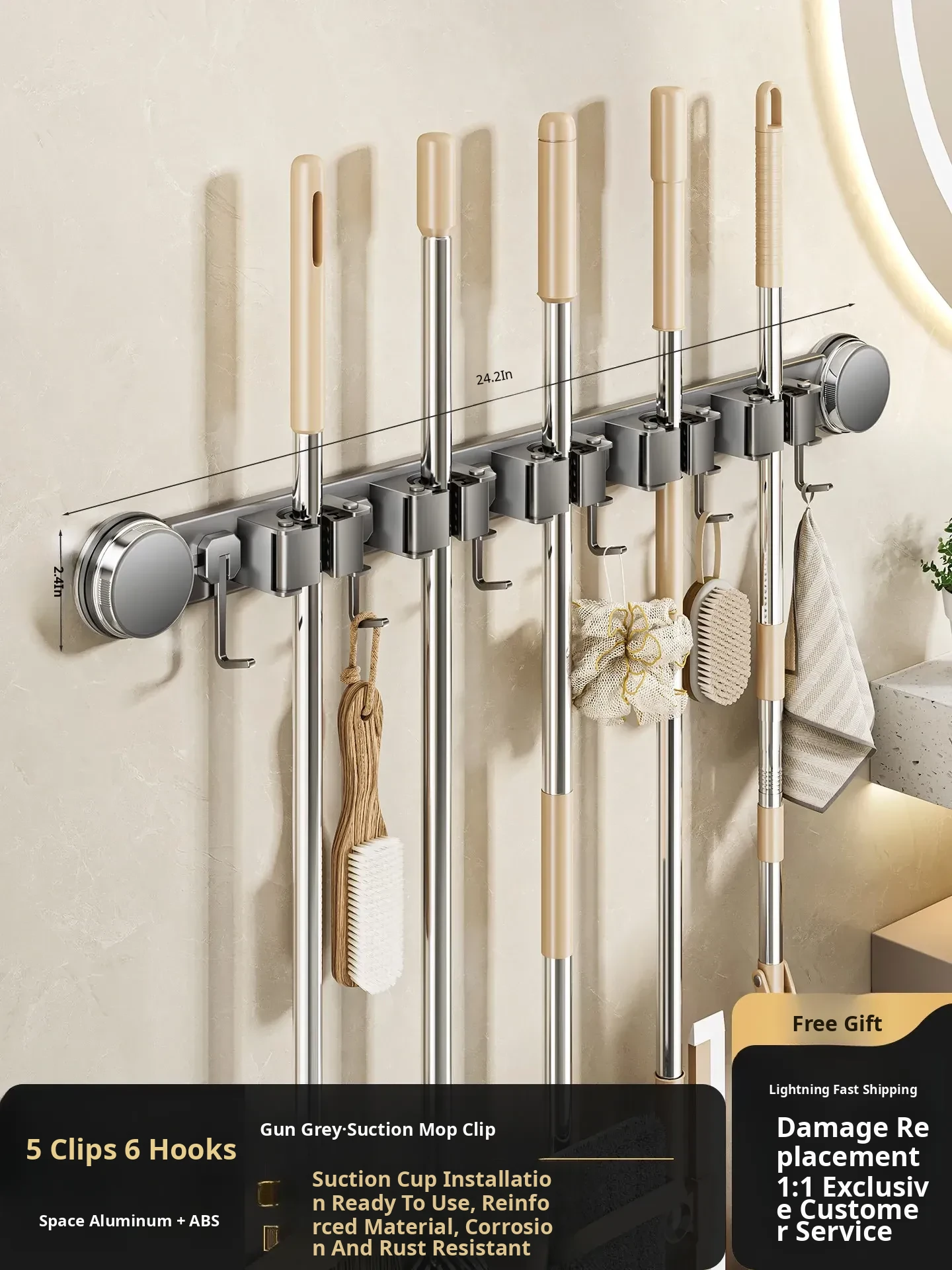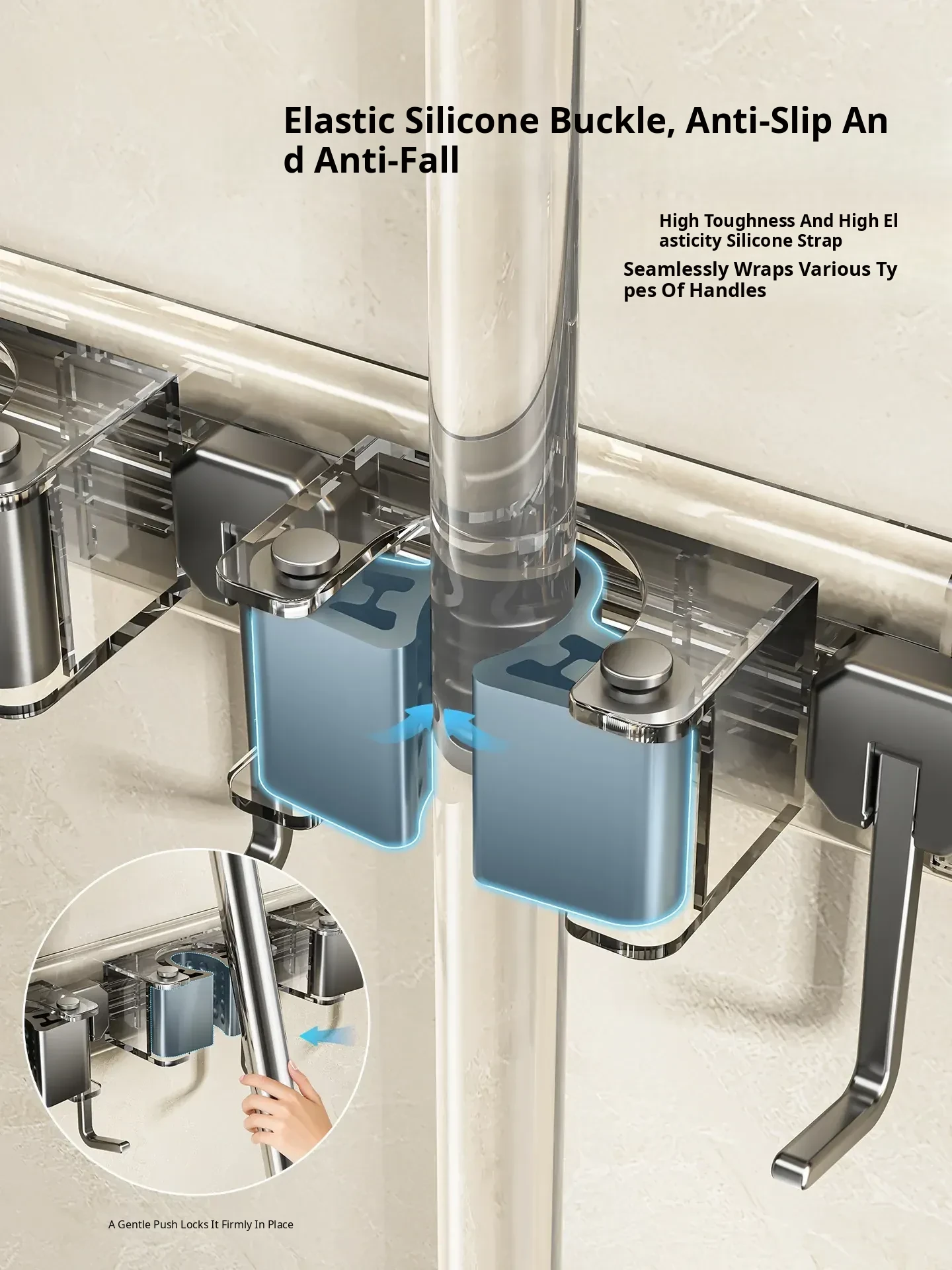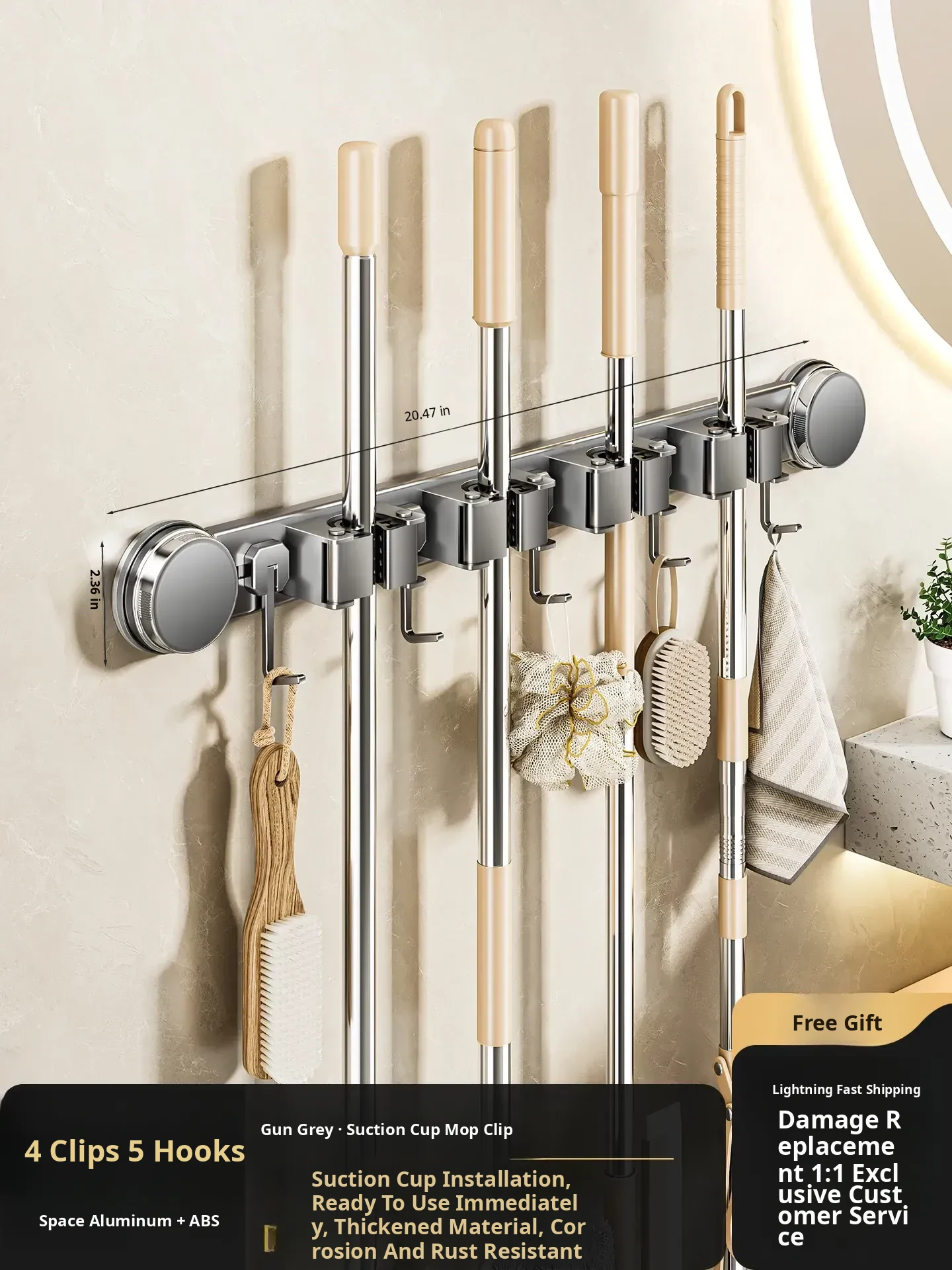 Suction Mop Wall Mount Holder - No Drill Mop and Broom Organizer Hook for Bathroom - Space-Saving Storage Solution for Mops, Brooms, and Cloths