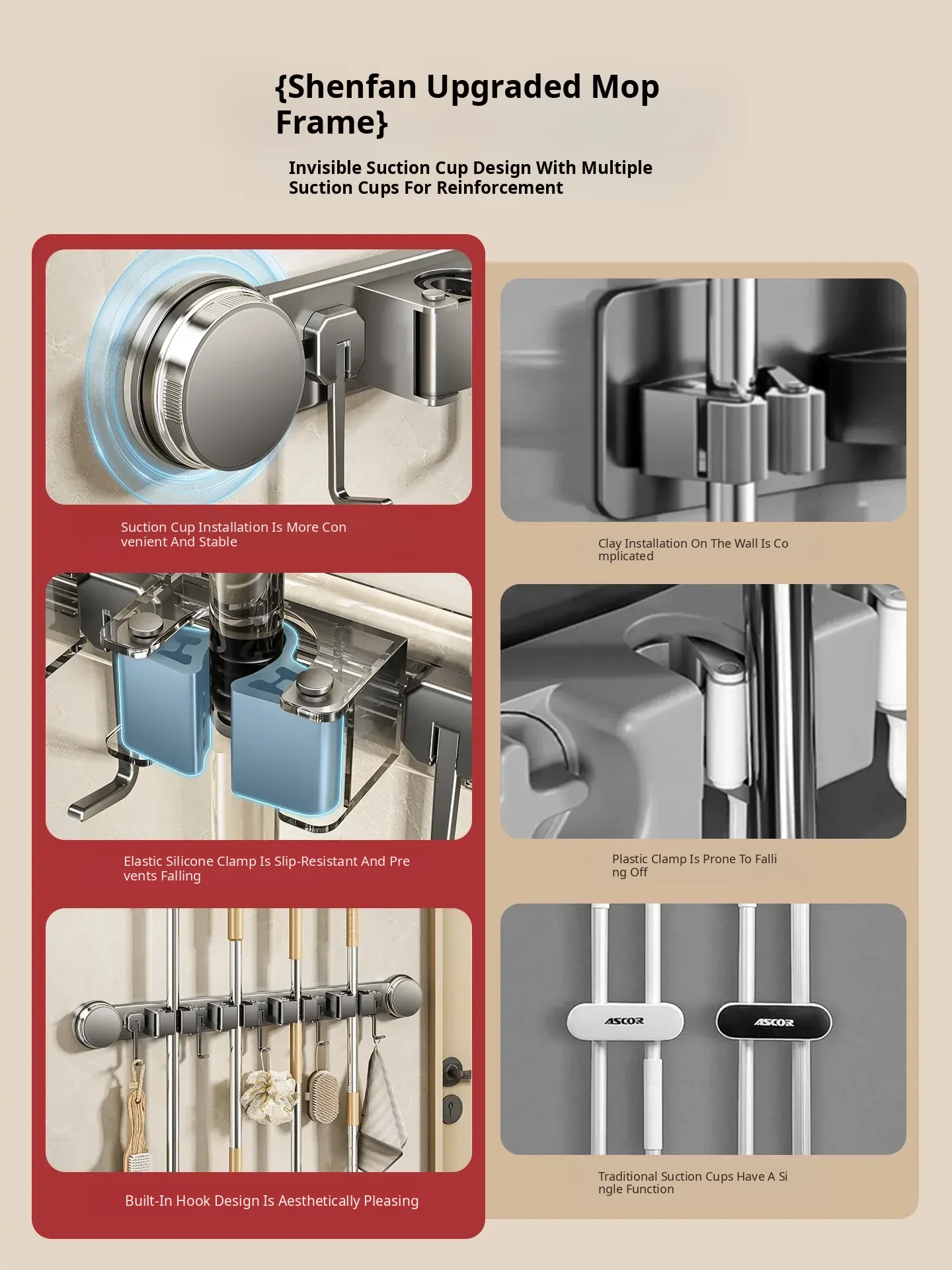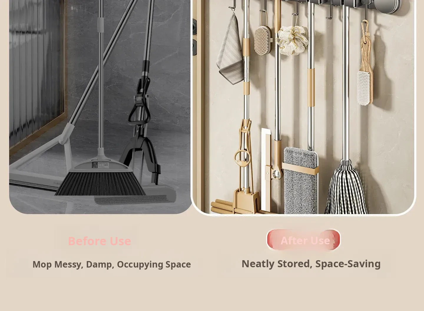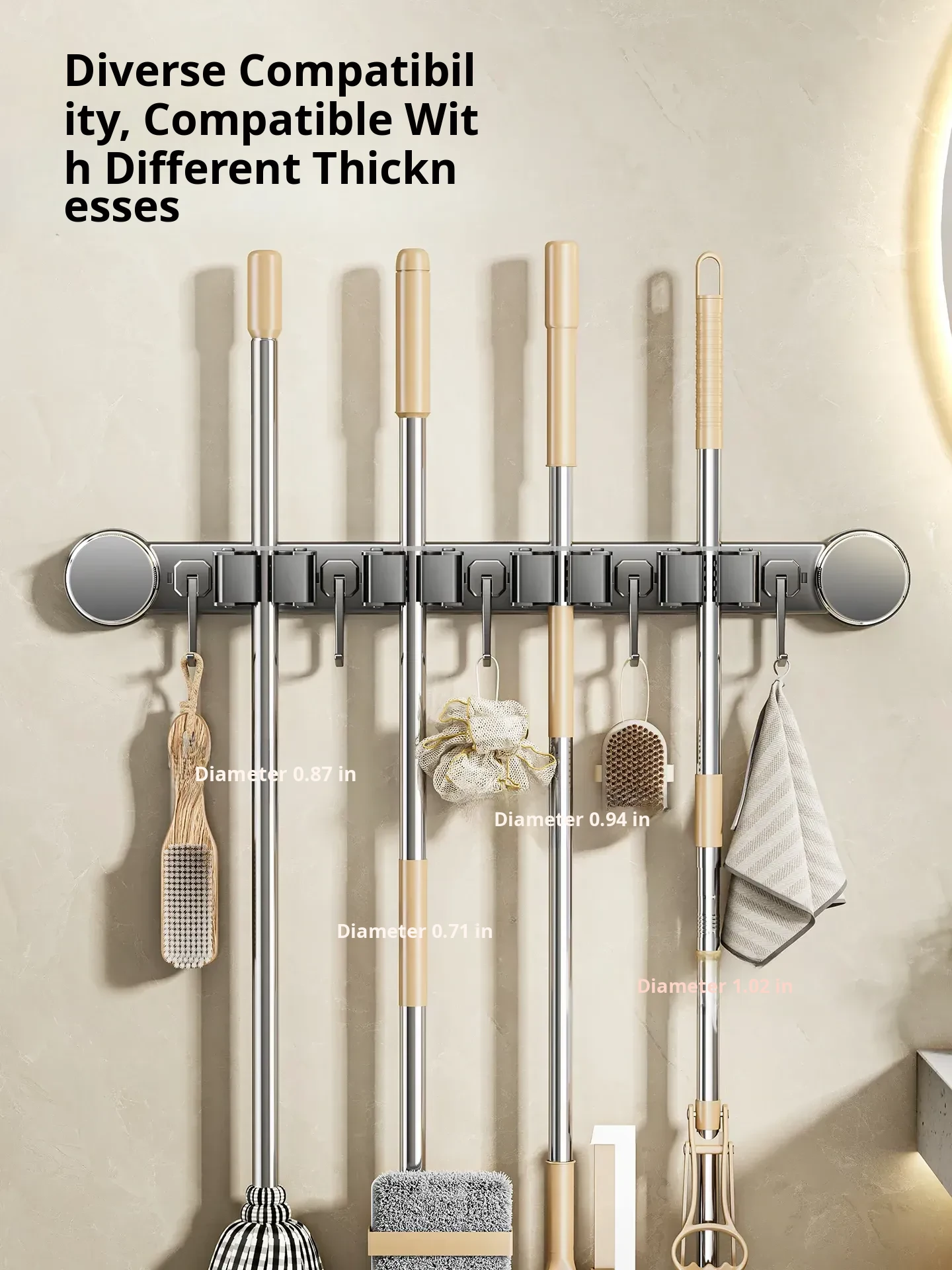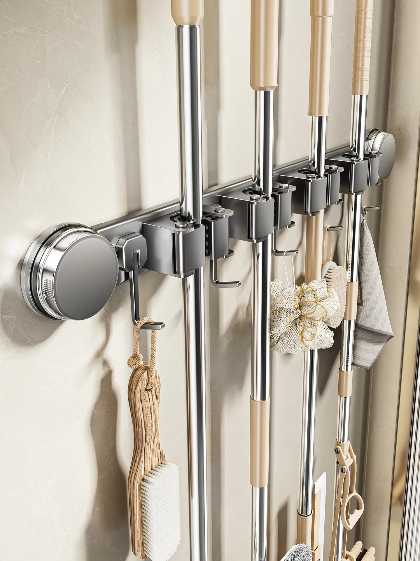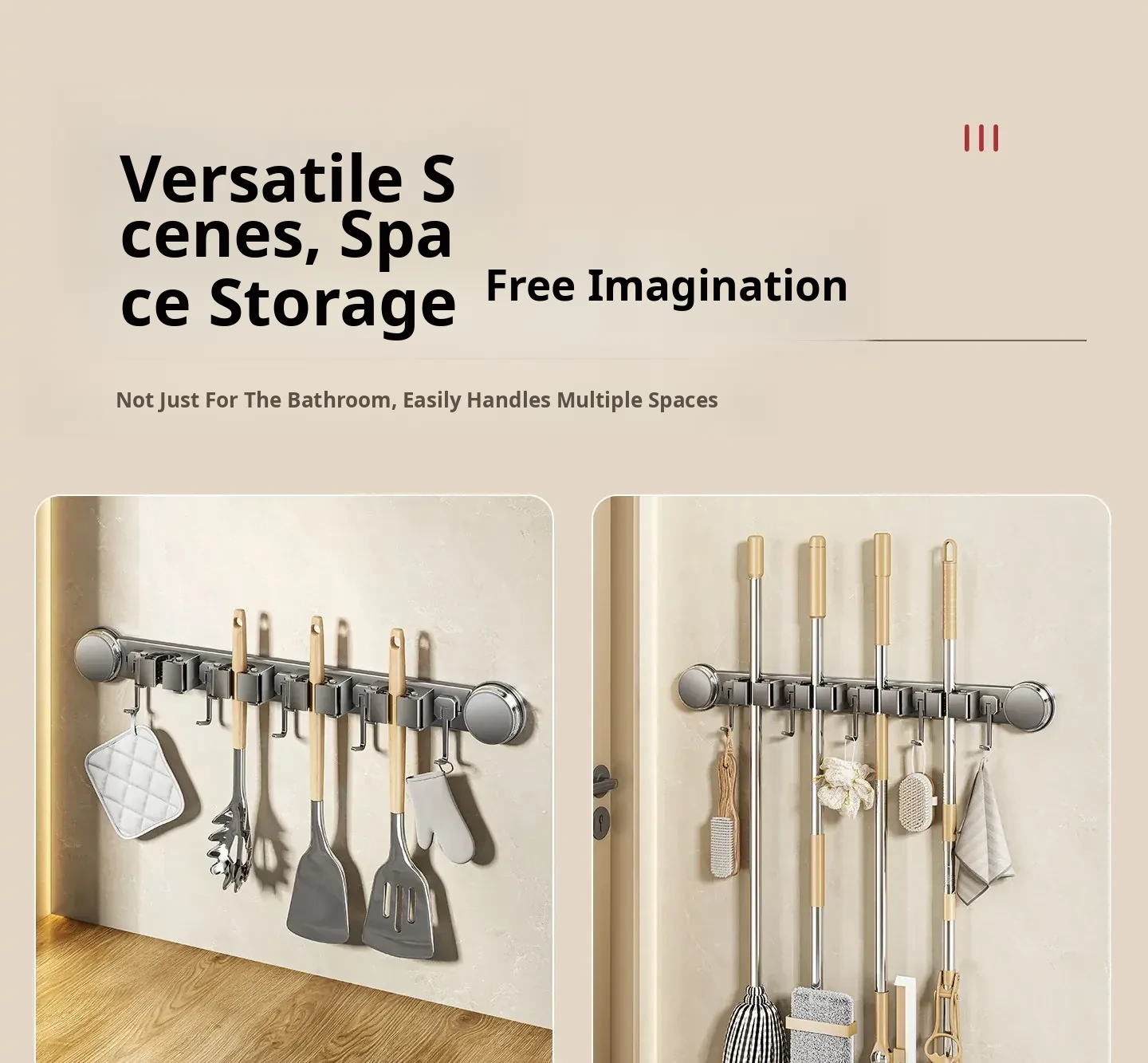 Suction Mop Wall Mount Holder - No Drill Mop and Broom Organizer Hook for Bathroom - Space-Saving Storage Solution for Mops, Brooms, and Cloths