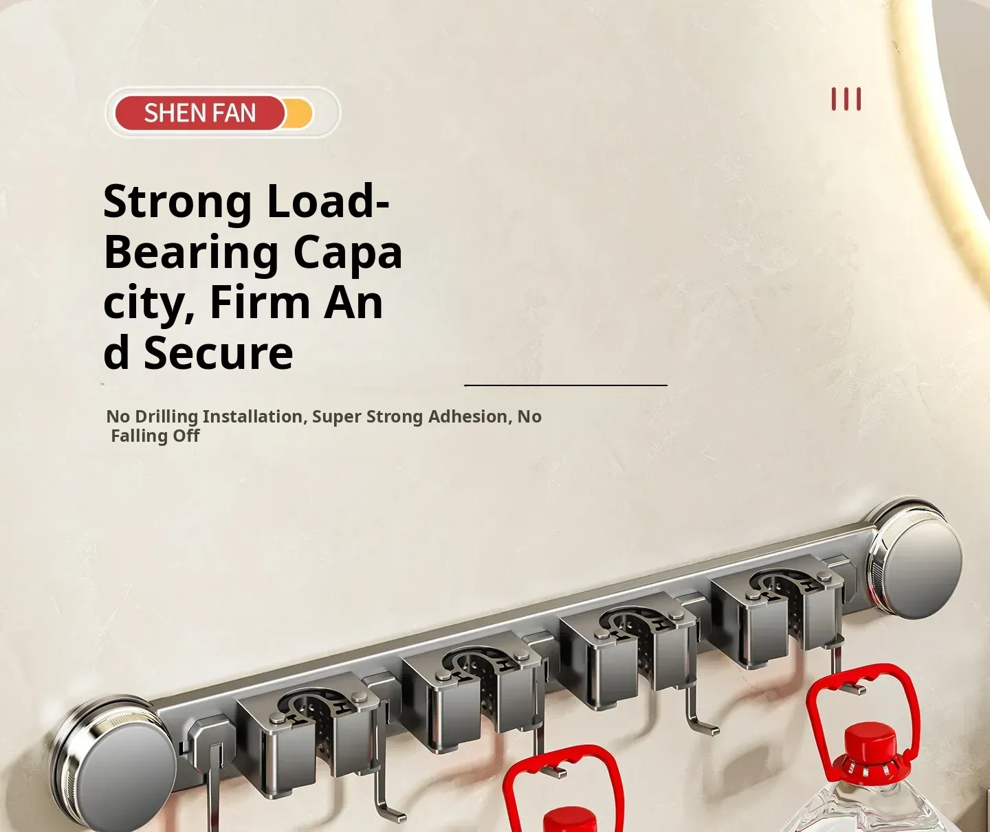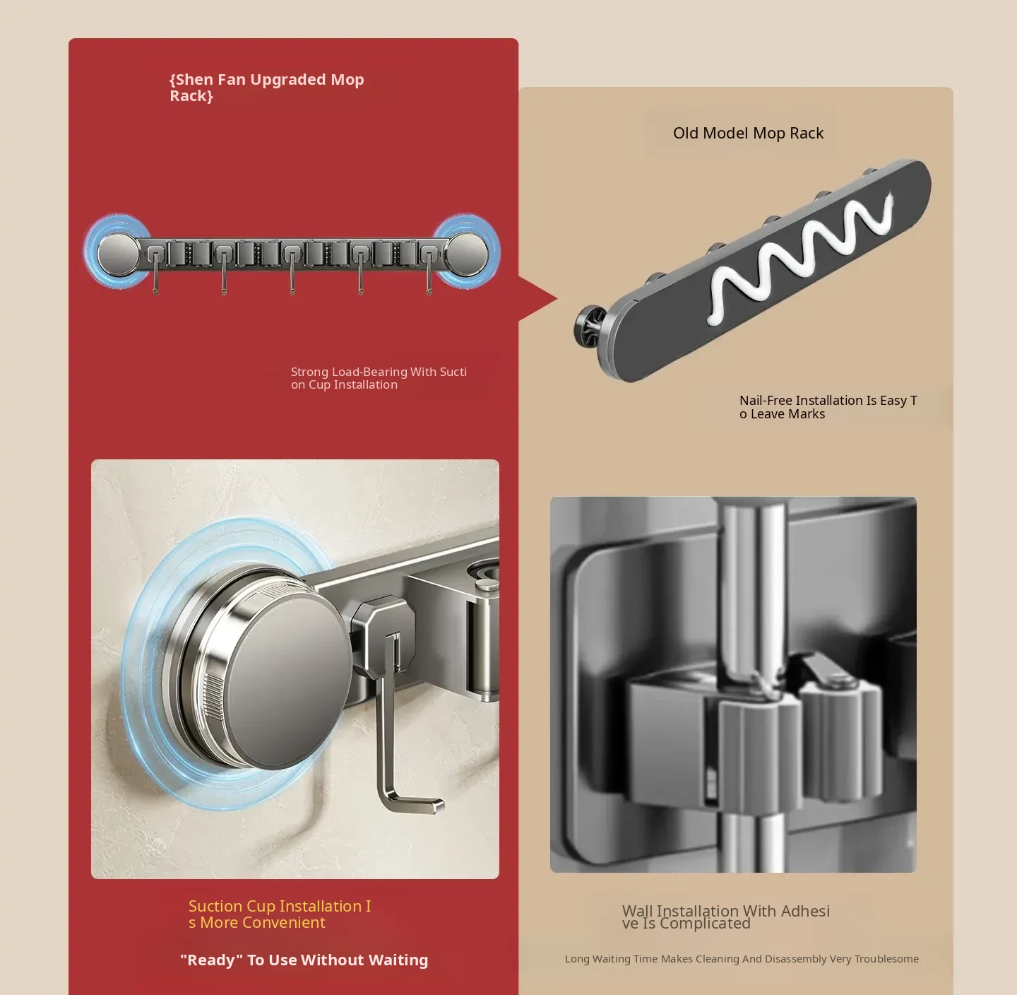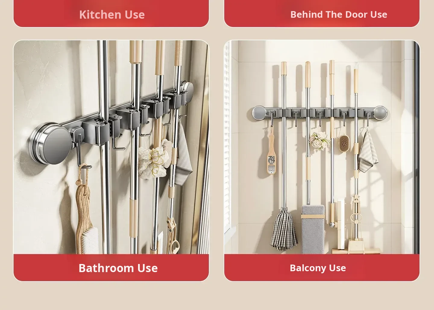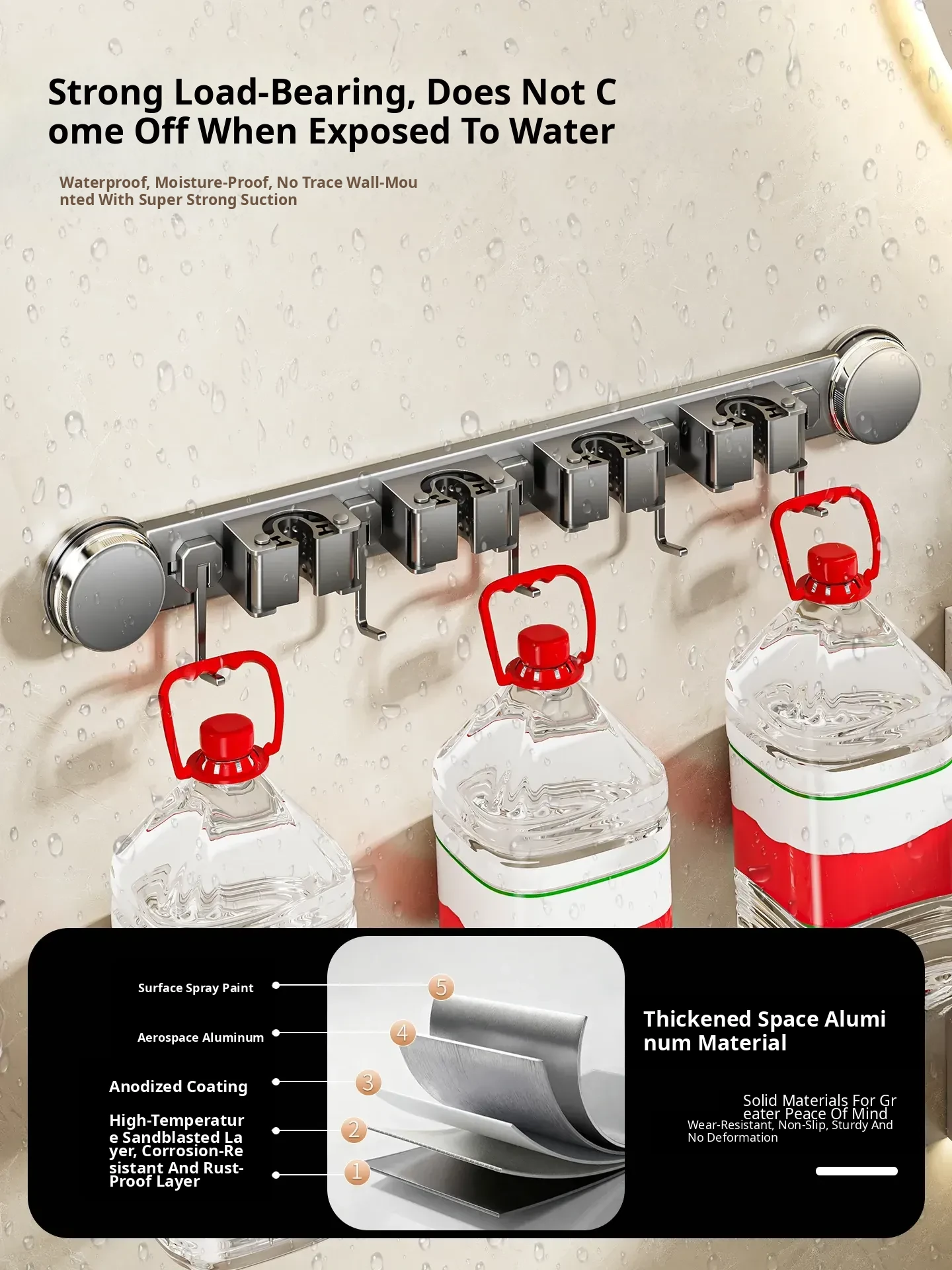 Suction Mop Wall Mount Holder - No Drill Mop and Broom Organizer Hook for Bathroom - Space-Saving Storage Solution for Mops, Brooms, and Cloths