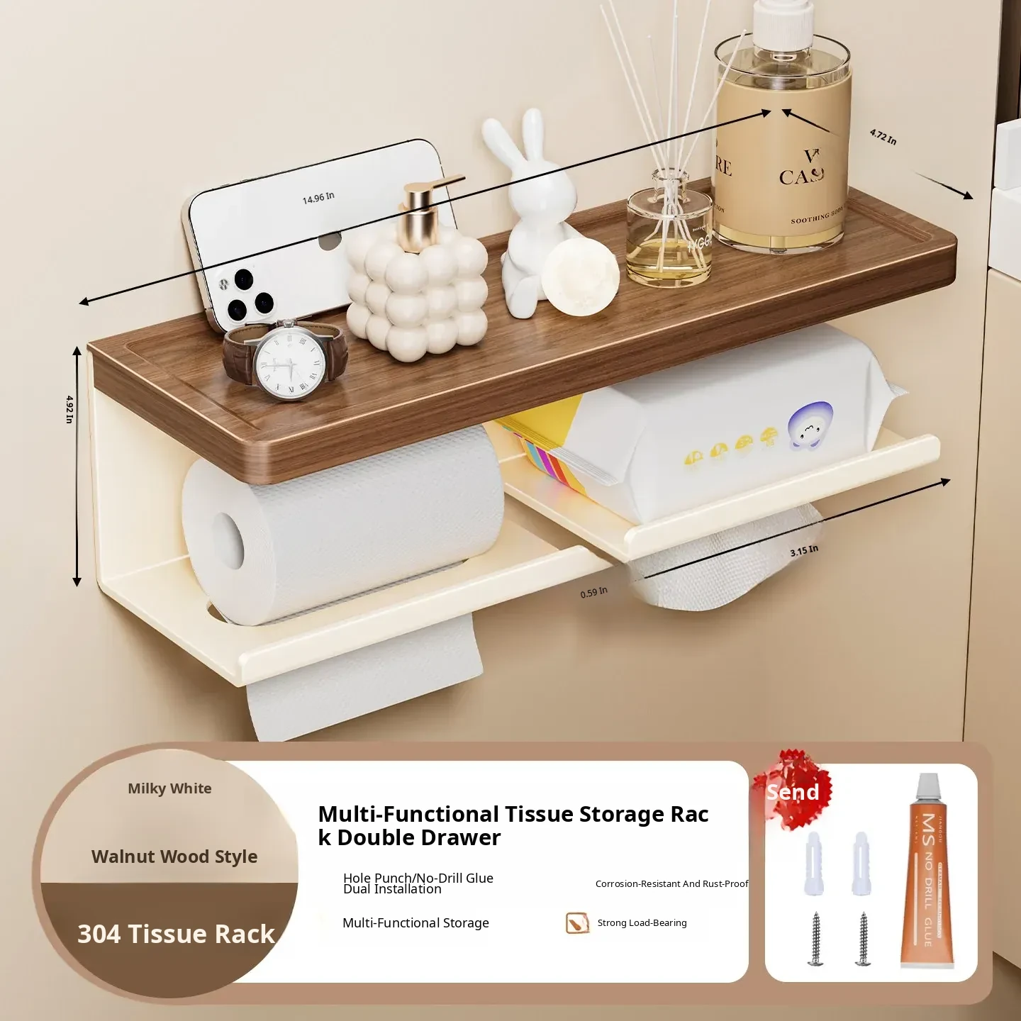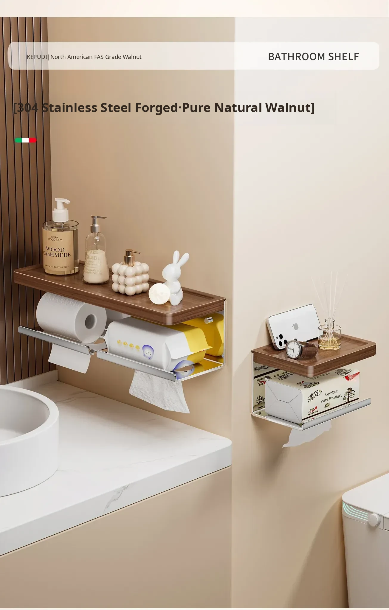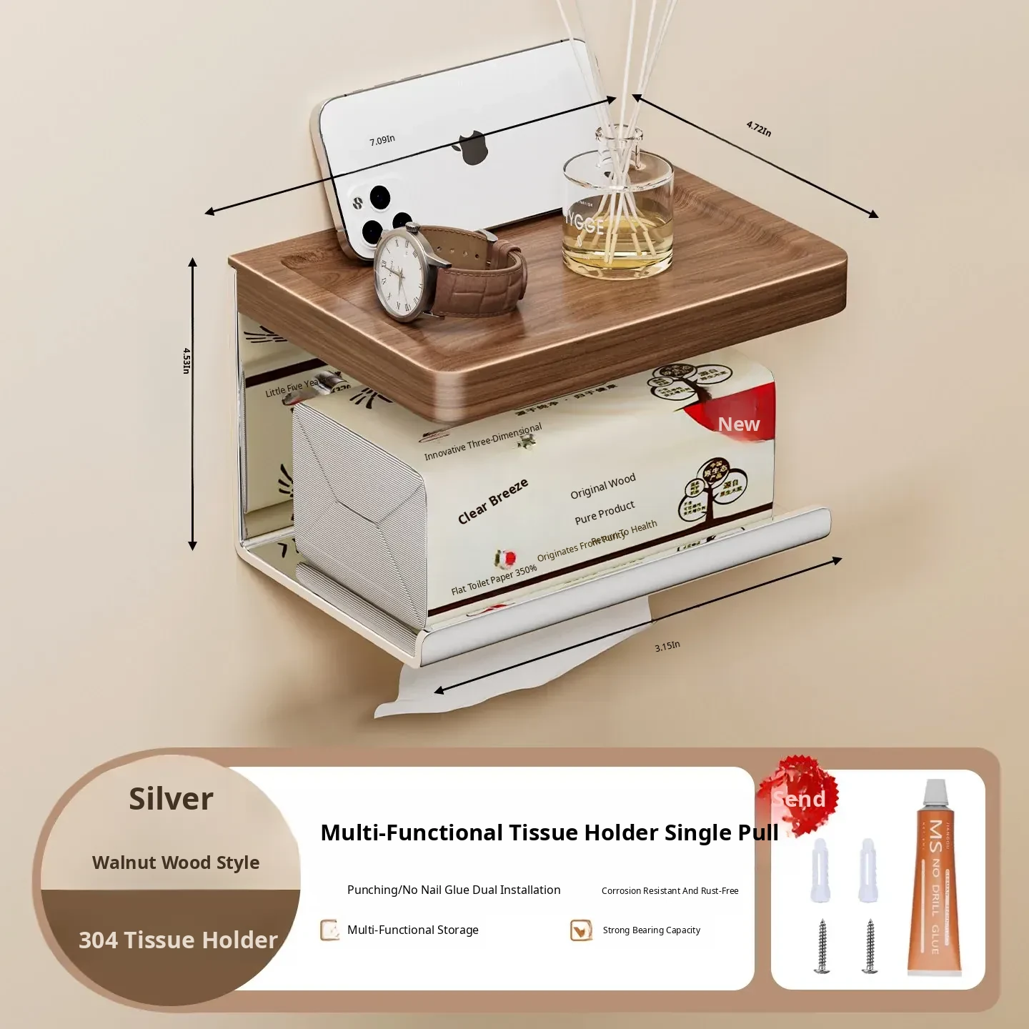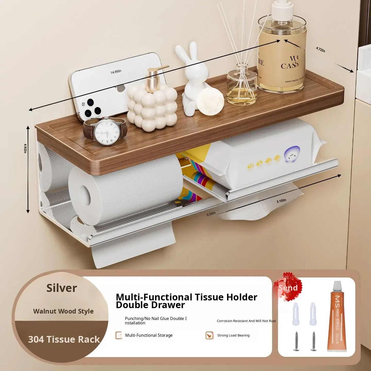 Walnut Wood Toilet Paper Holder - No Drilling Required, 304 Stainless Steel Bathroom Tissue Roll Storage Rack for Your Washroom