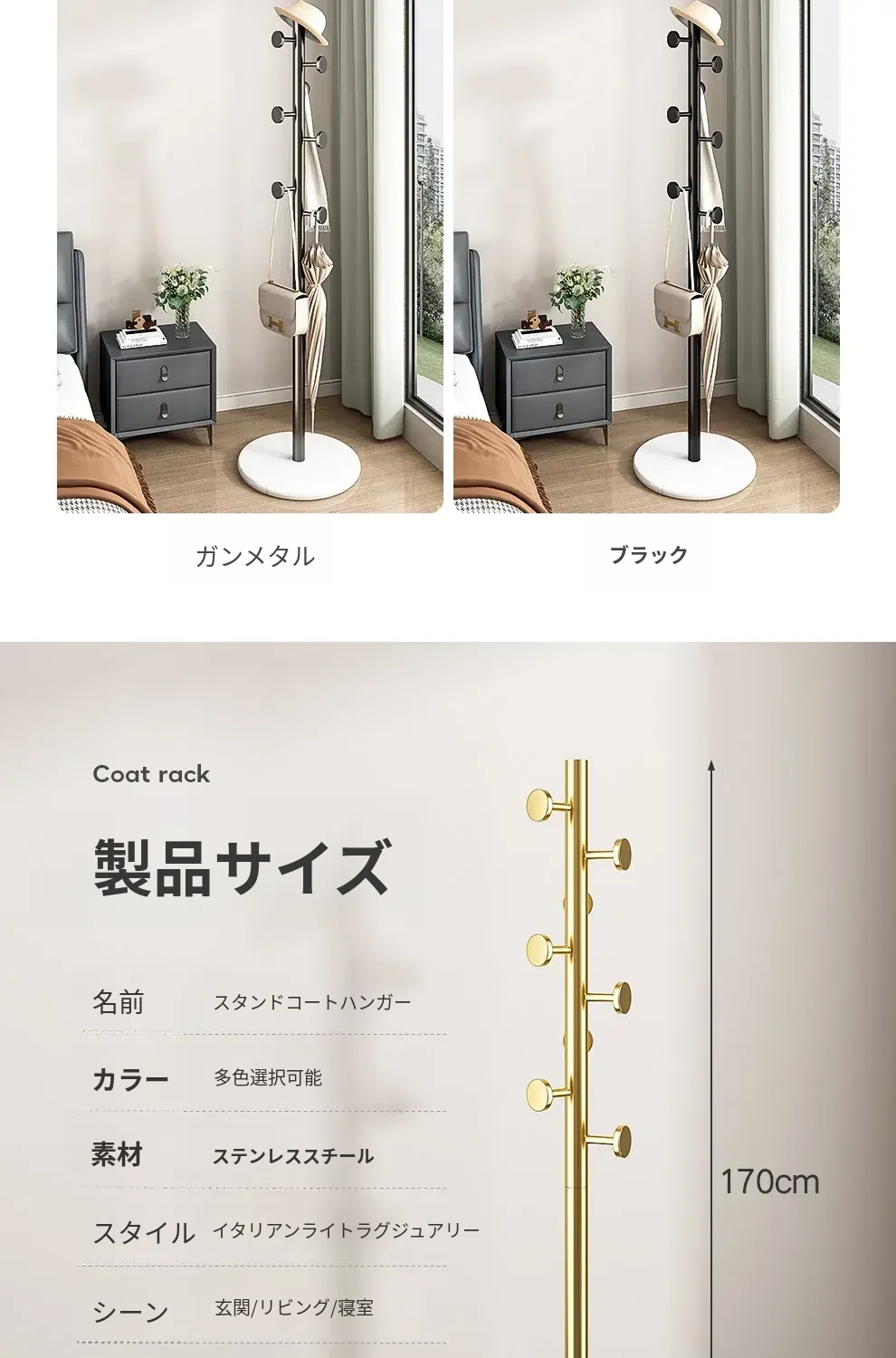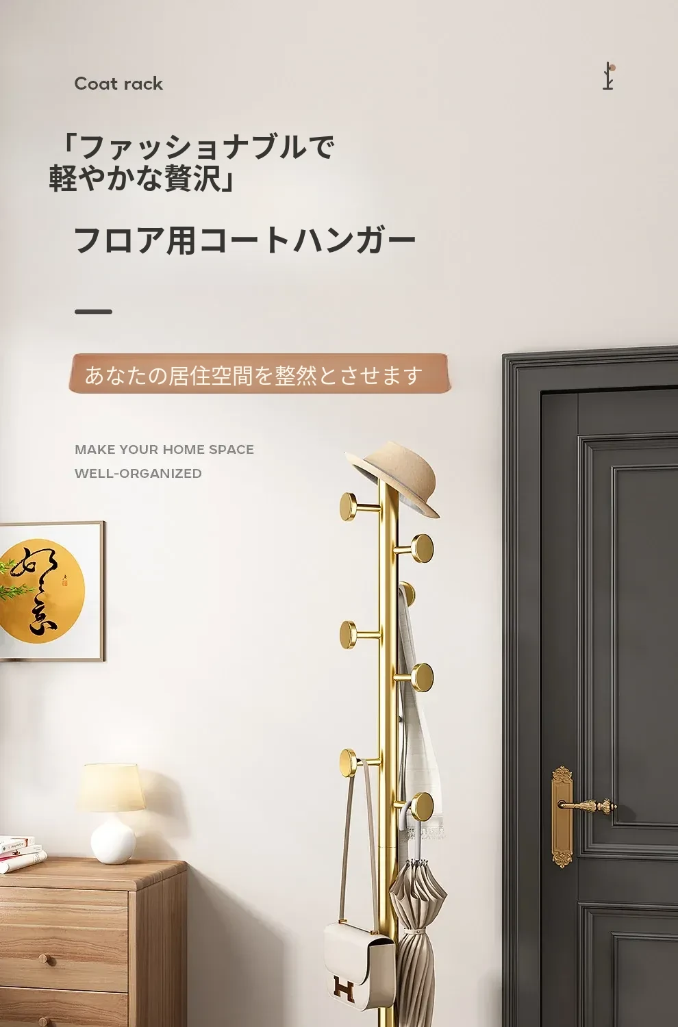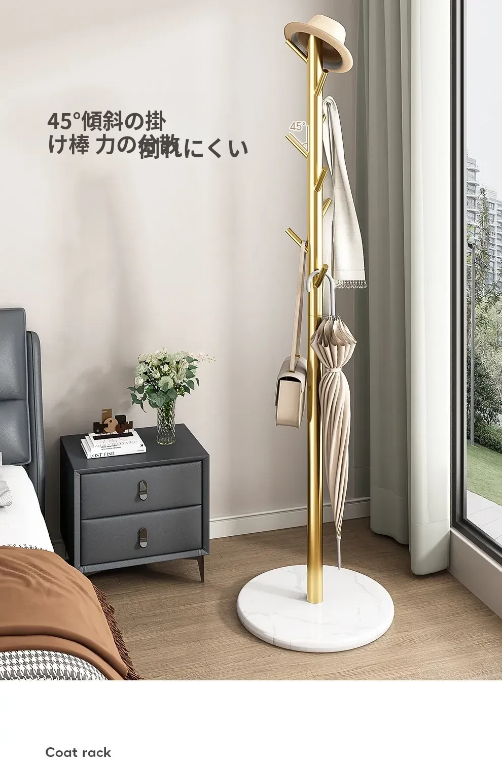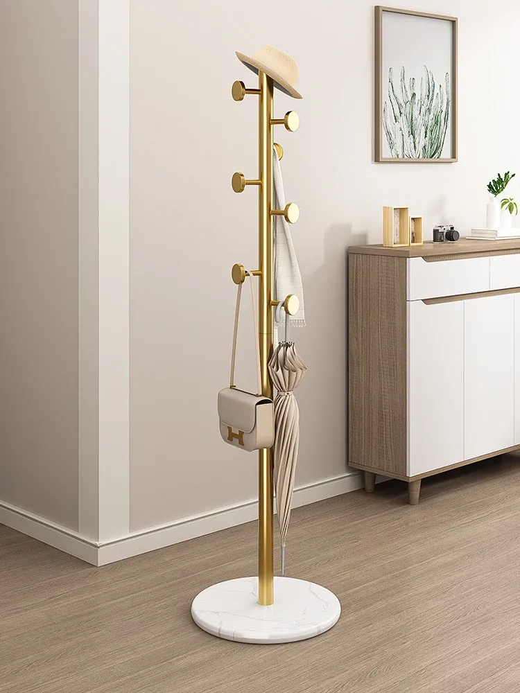 クリーム色のラグジュアリーなコートハンガー - おしゃれなデザインで、室内にぴったり!バッグやコートをスタイリッシュに収納できるステンレス製の落地型衣類ラック。あなたの寝室を洗練された空間に変えます!
