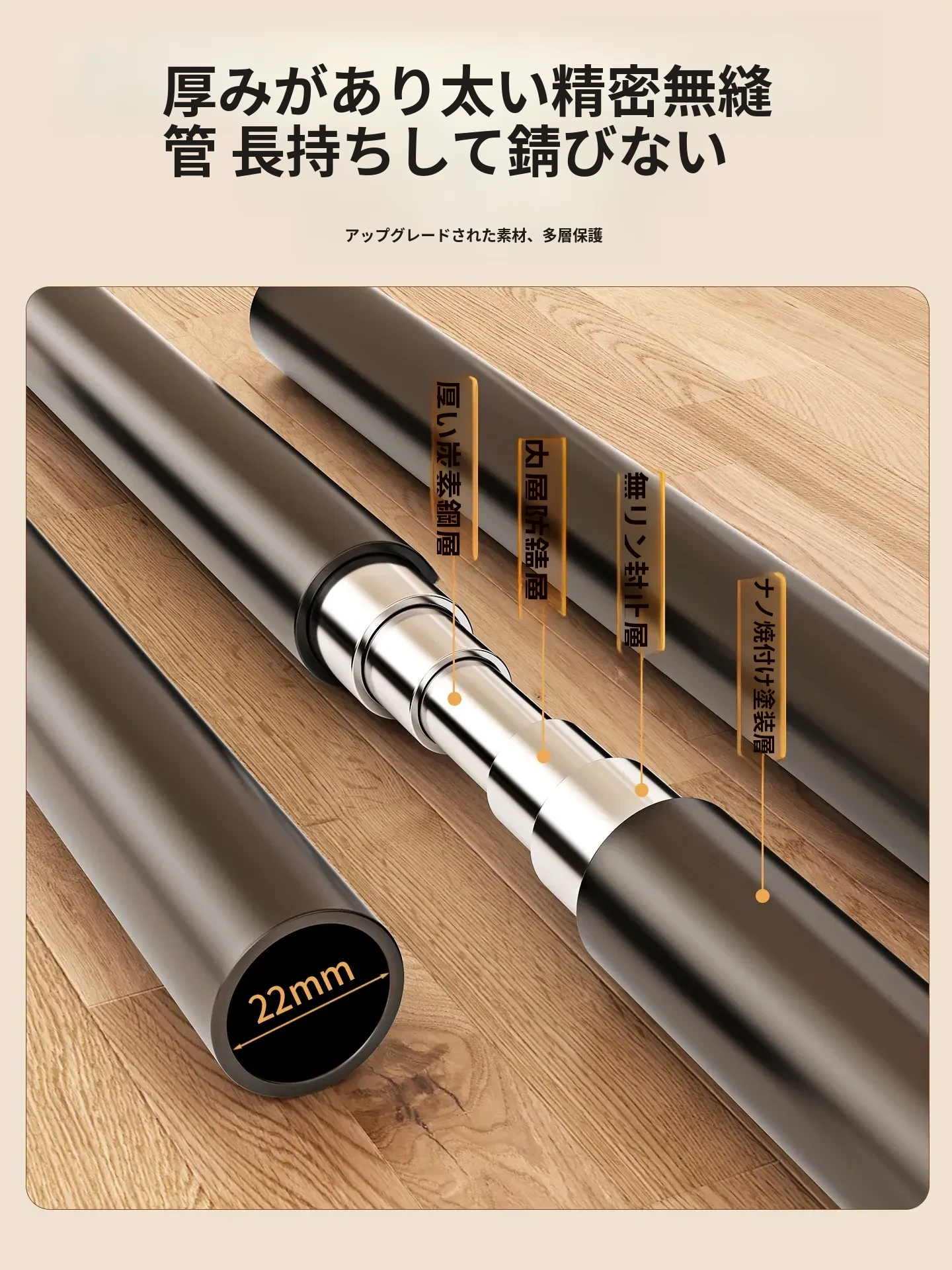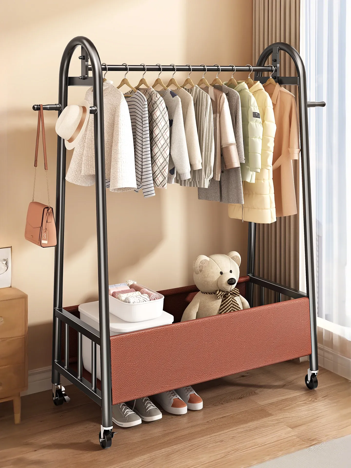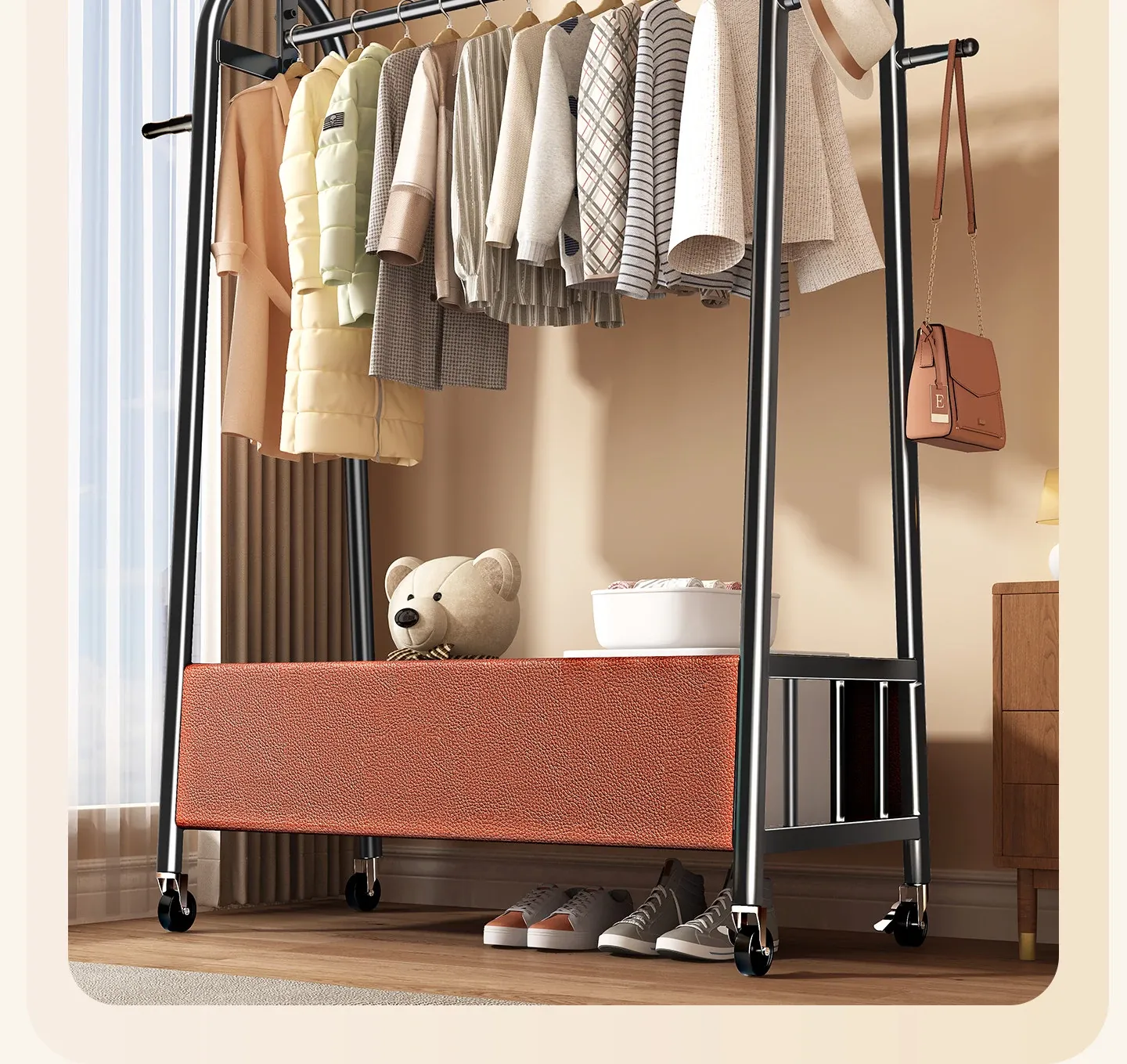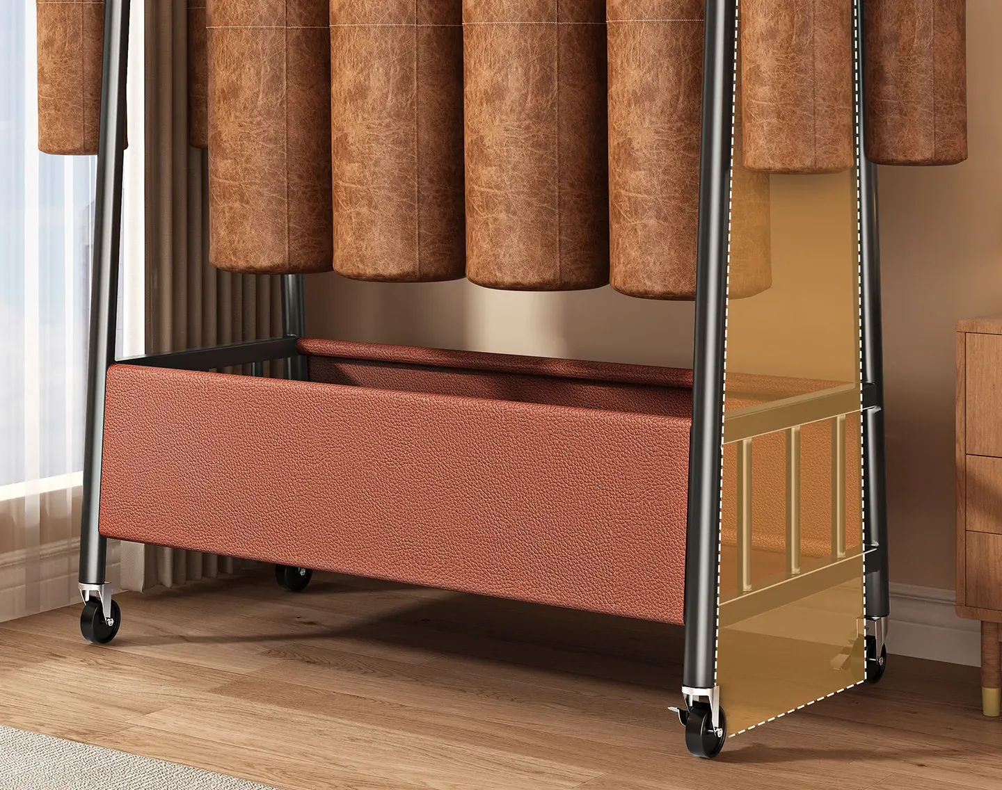 【太い鋼管】黒茶色100cm❤皮ポケット収納+フック付き+キャスター付き『2026年モデルのプレミアム』