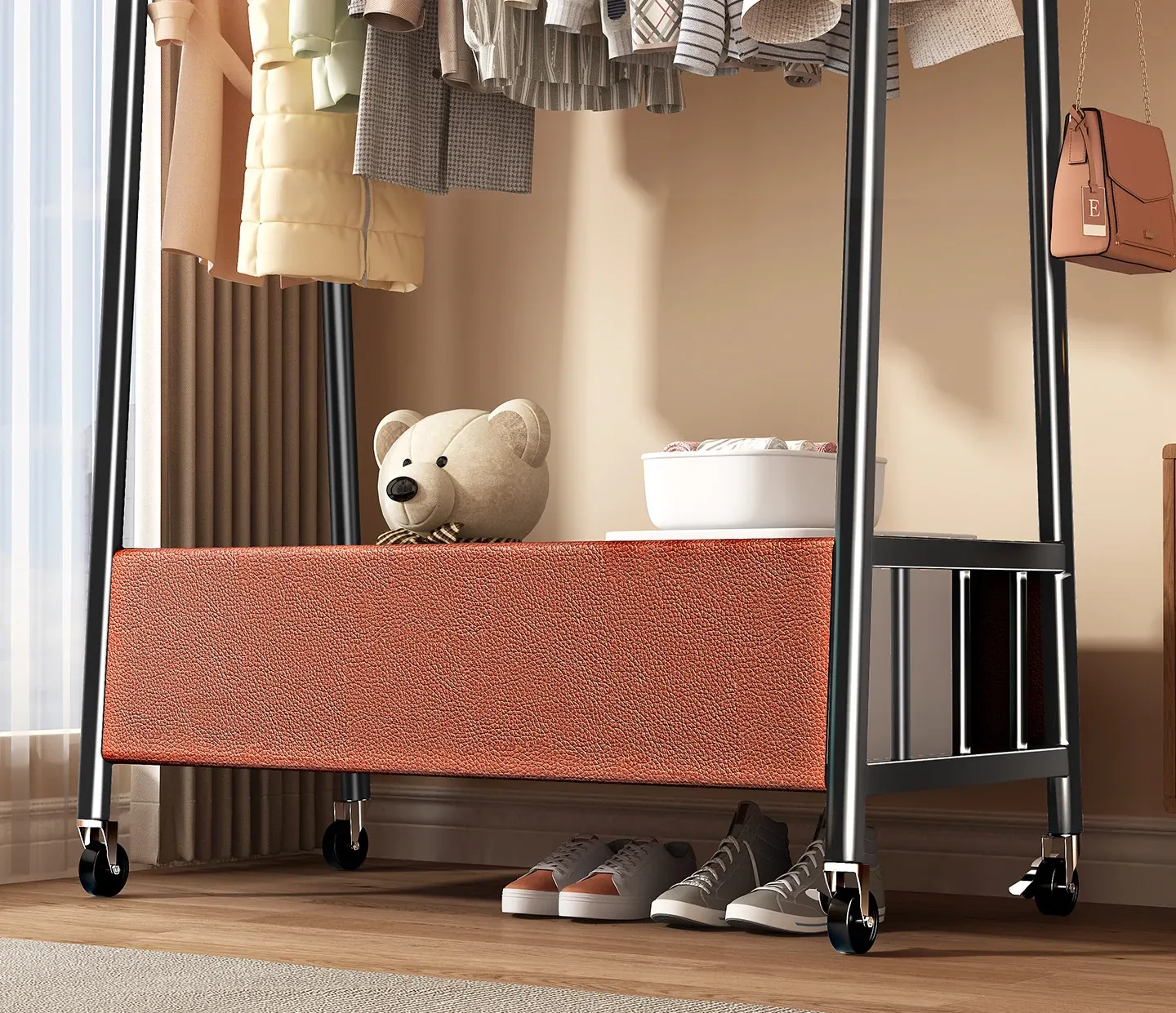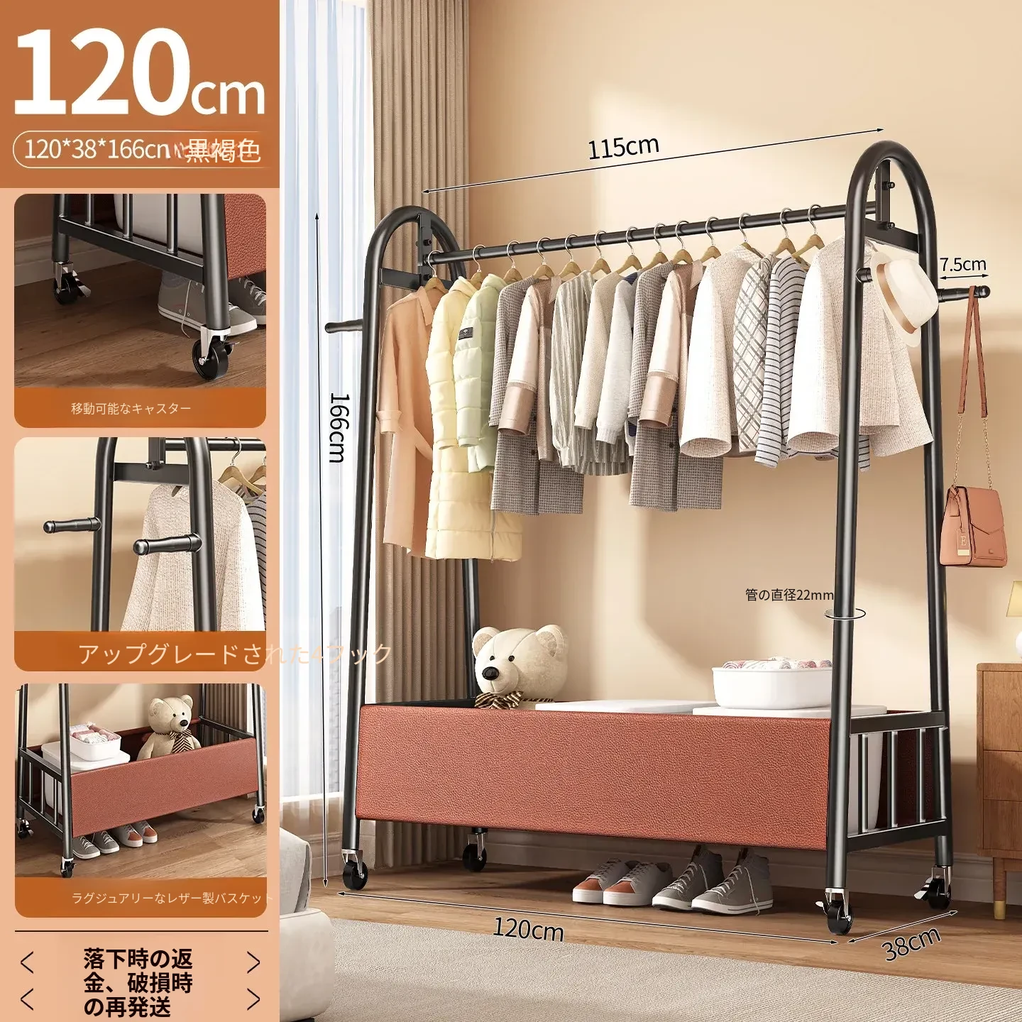 【太い鋼管】黒茶色120cm❤皮ポケット収納+フック付き+キャスター付き『2026年モデルのプレミアム』
