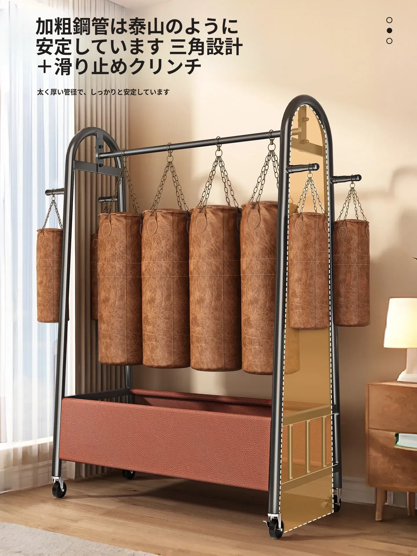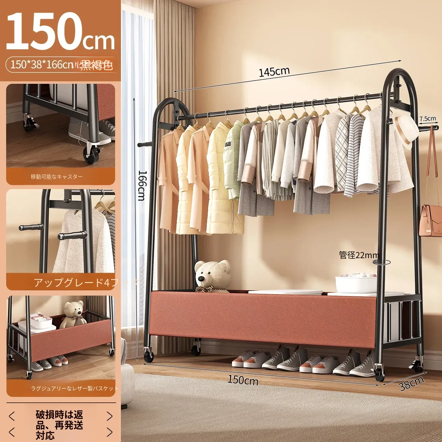 【太い鋼管】黒茶色150cm❤皮ポケット収納+フック付き+キャスター付き『2026年モデルのプレミアム』