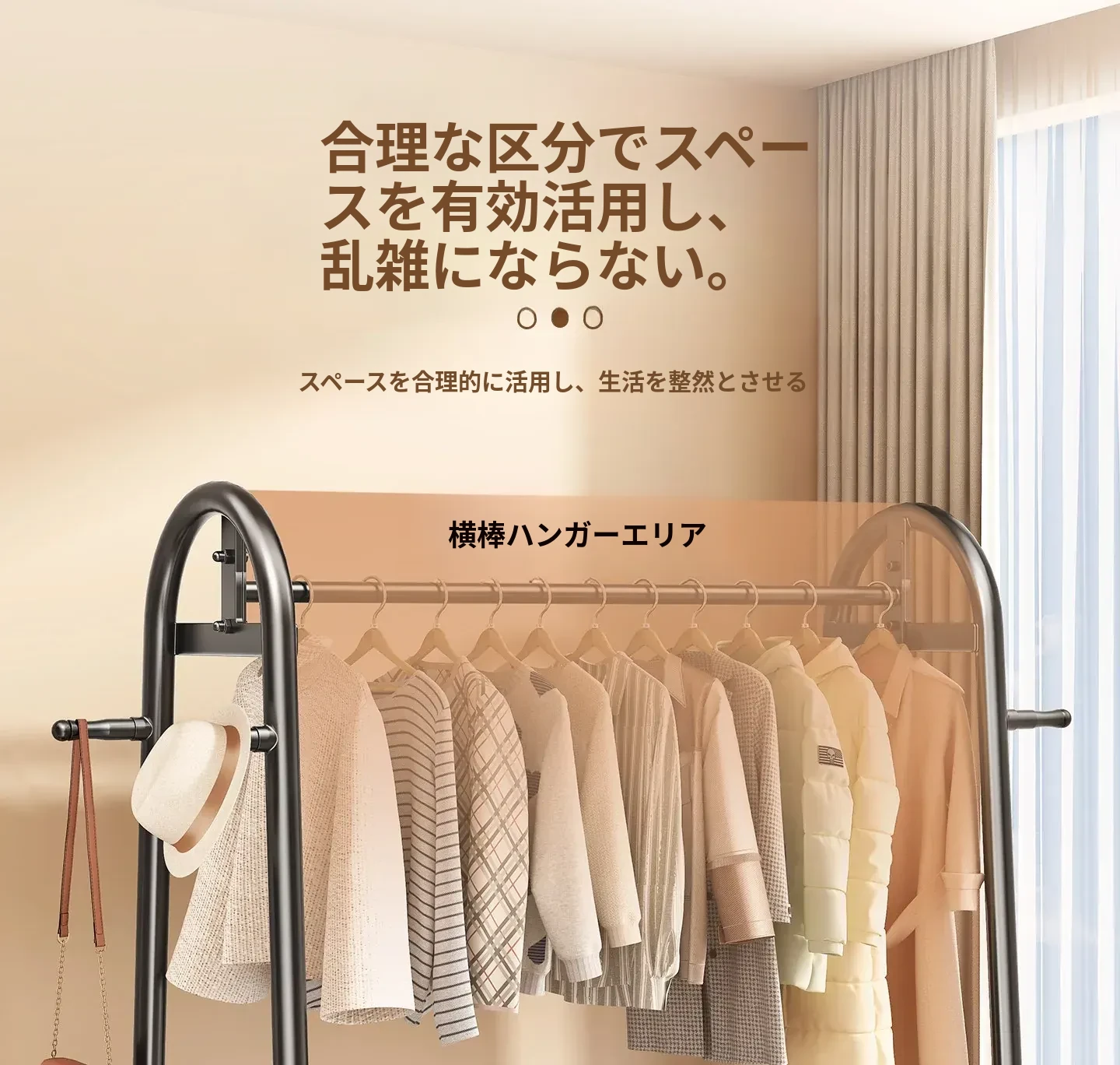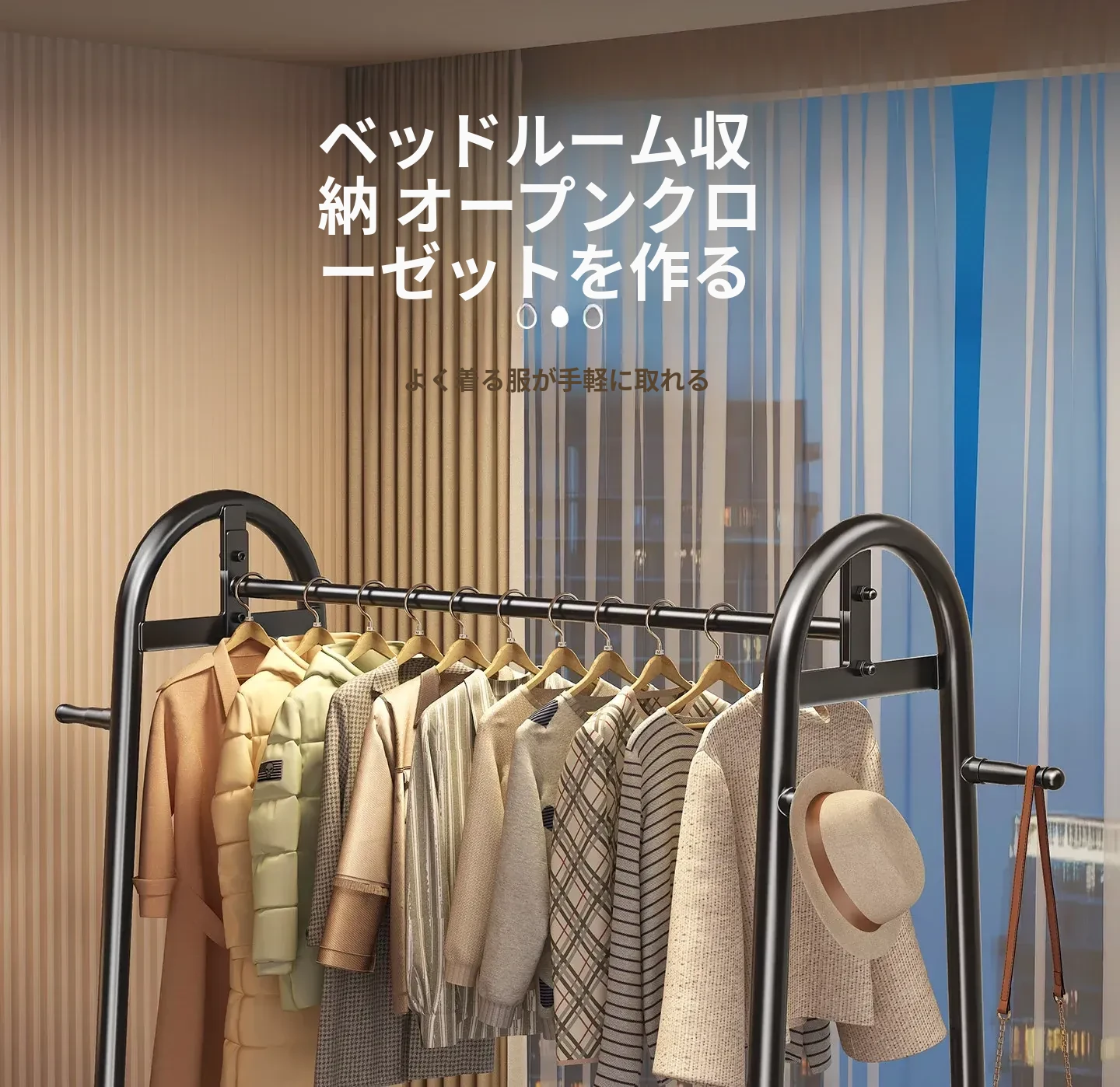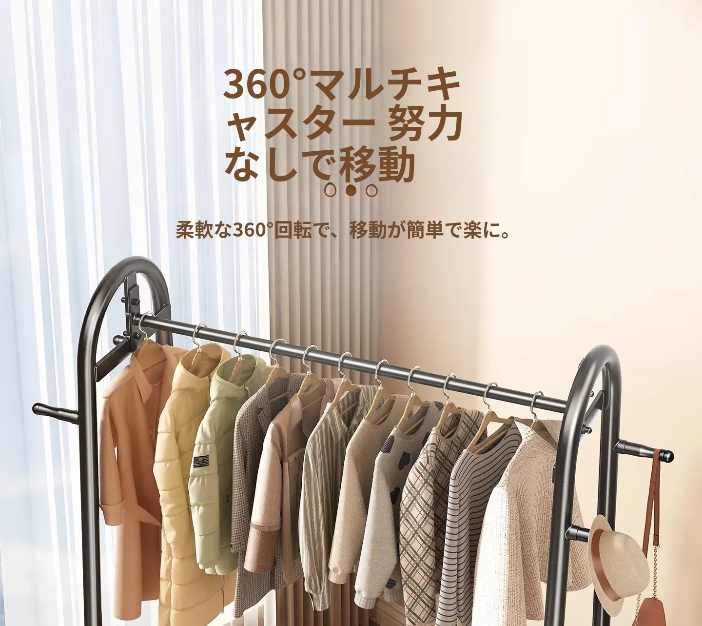 寝室用のスタイリッシュなフロアハンガー - 多機能衣類掛け、軽量で移動もラクラク!おしゃれなインテリアで部屋を華やかにし、収納力も抜群。お家での快適な生活を演出します!