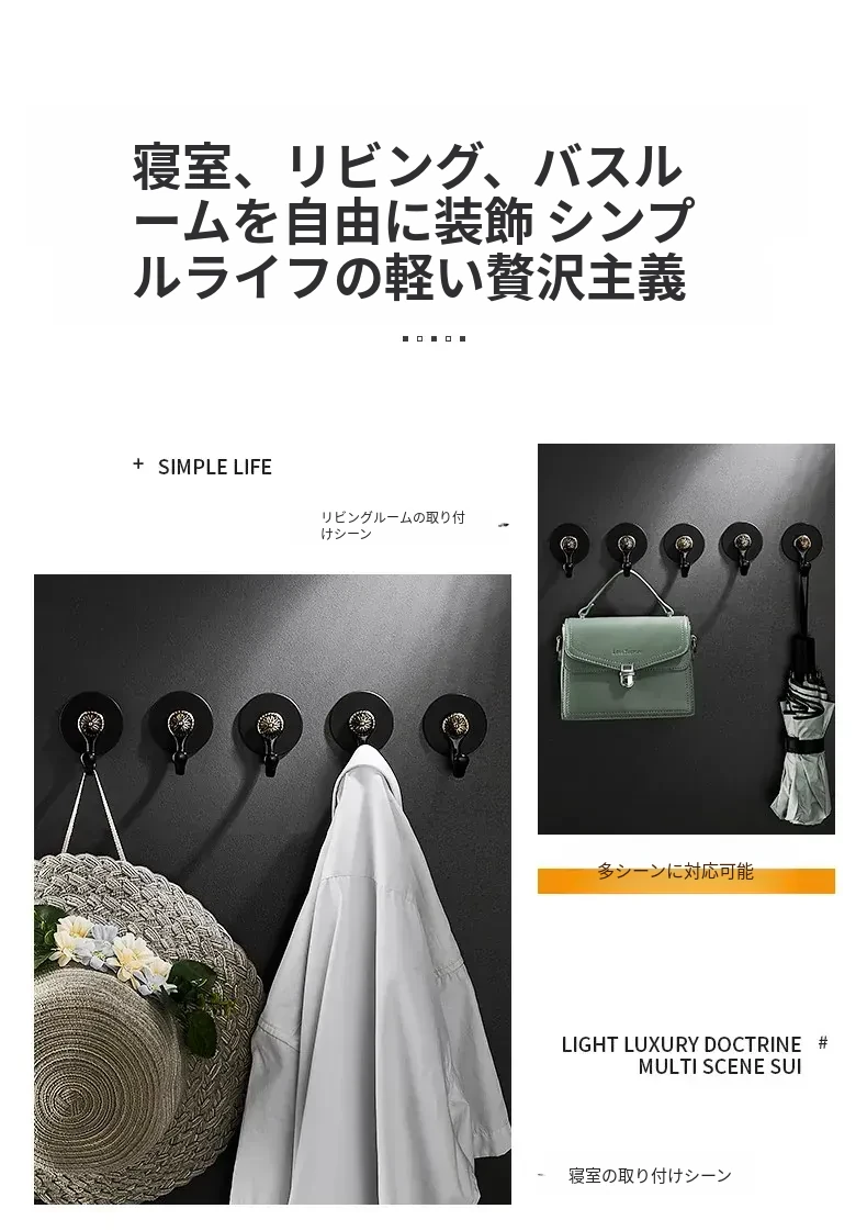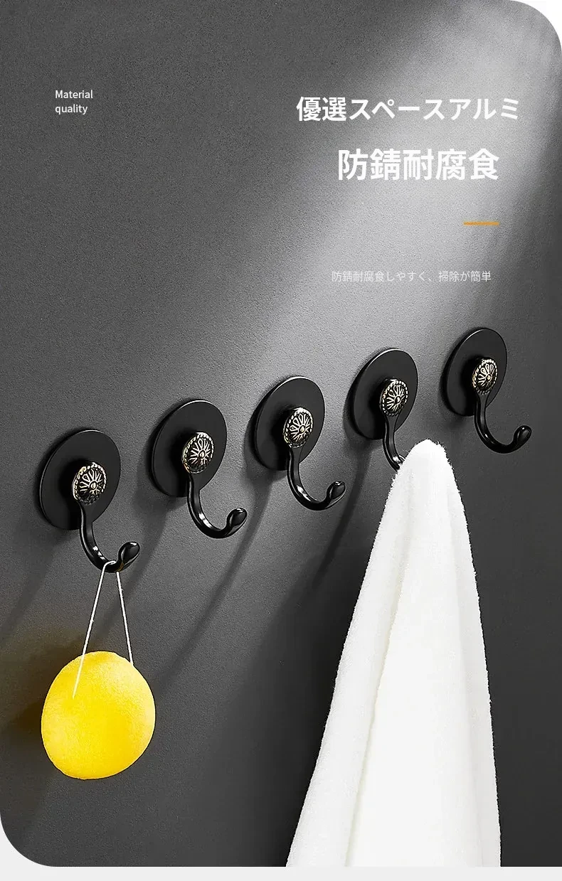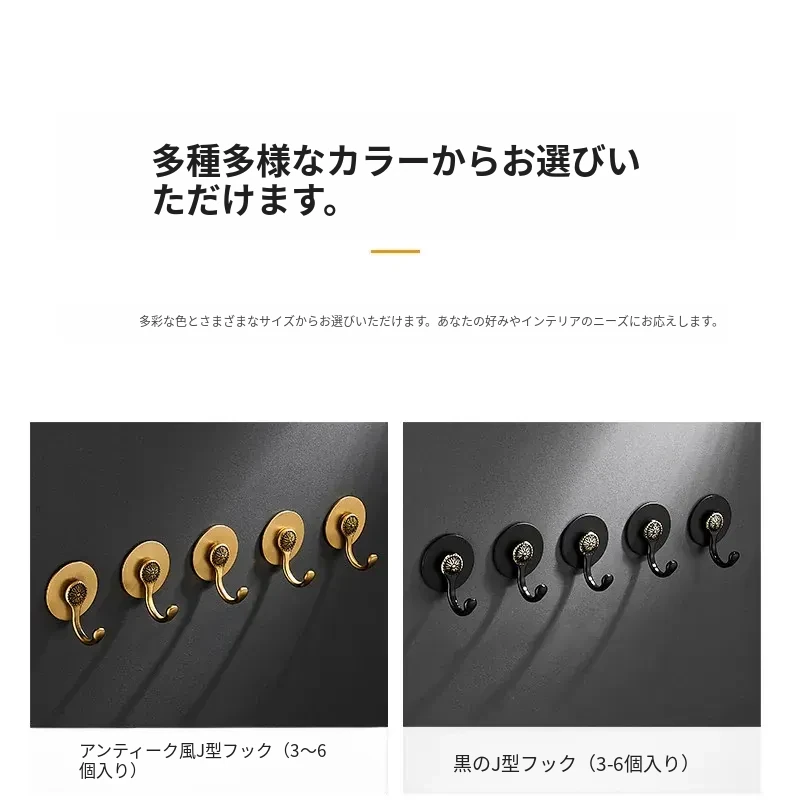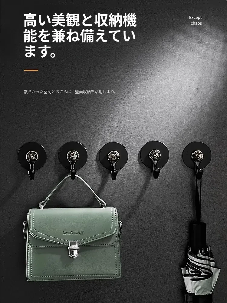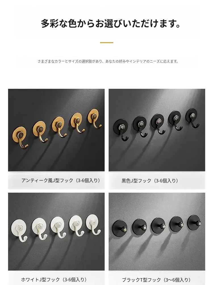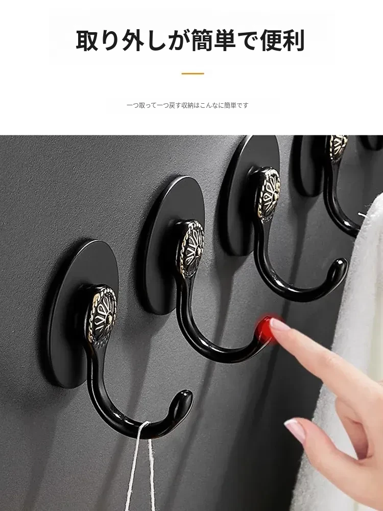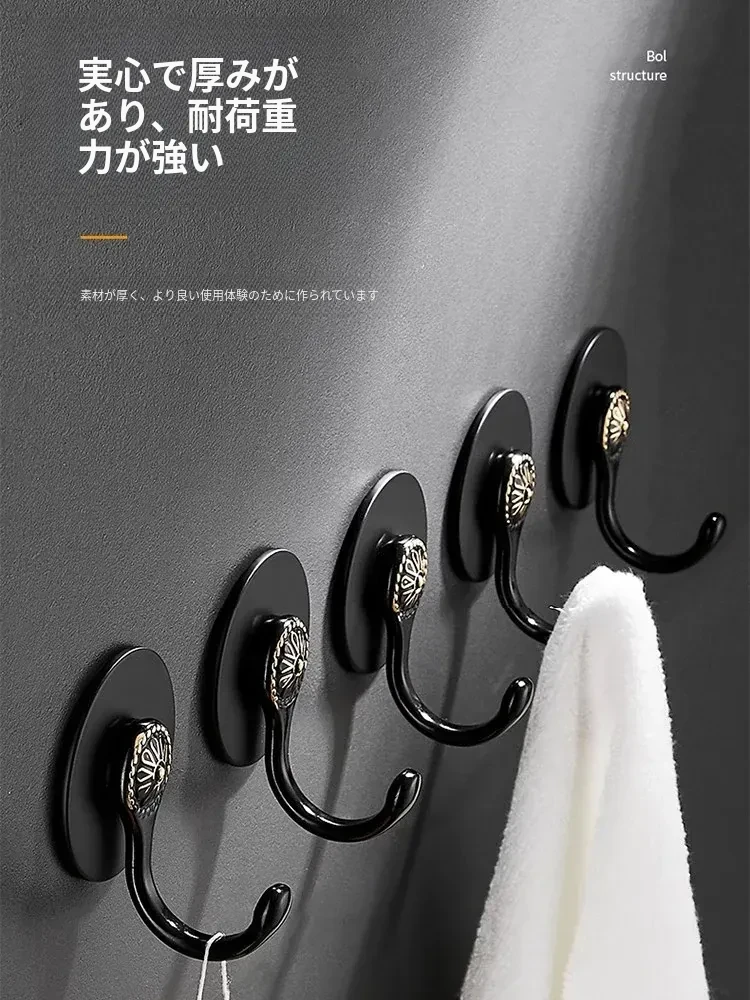 強力粘着フック - 穴を開けずに取り付け可能!ドアの裏やバスルーム、キッチンの壁に最適。重さを支える無痕フックで、衣類や帽子をしっかり収納。お部屋をスッキリ整理整頓!