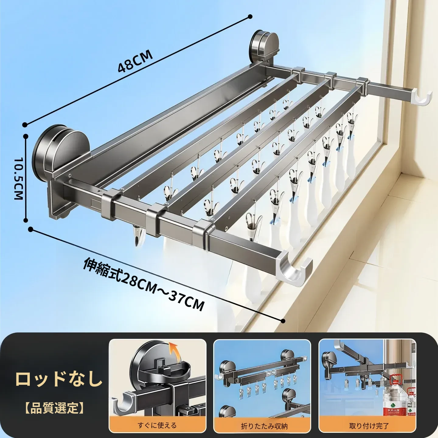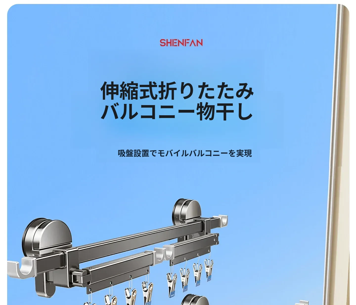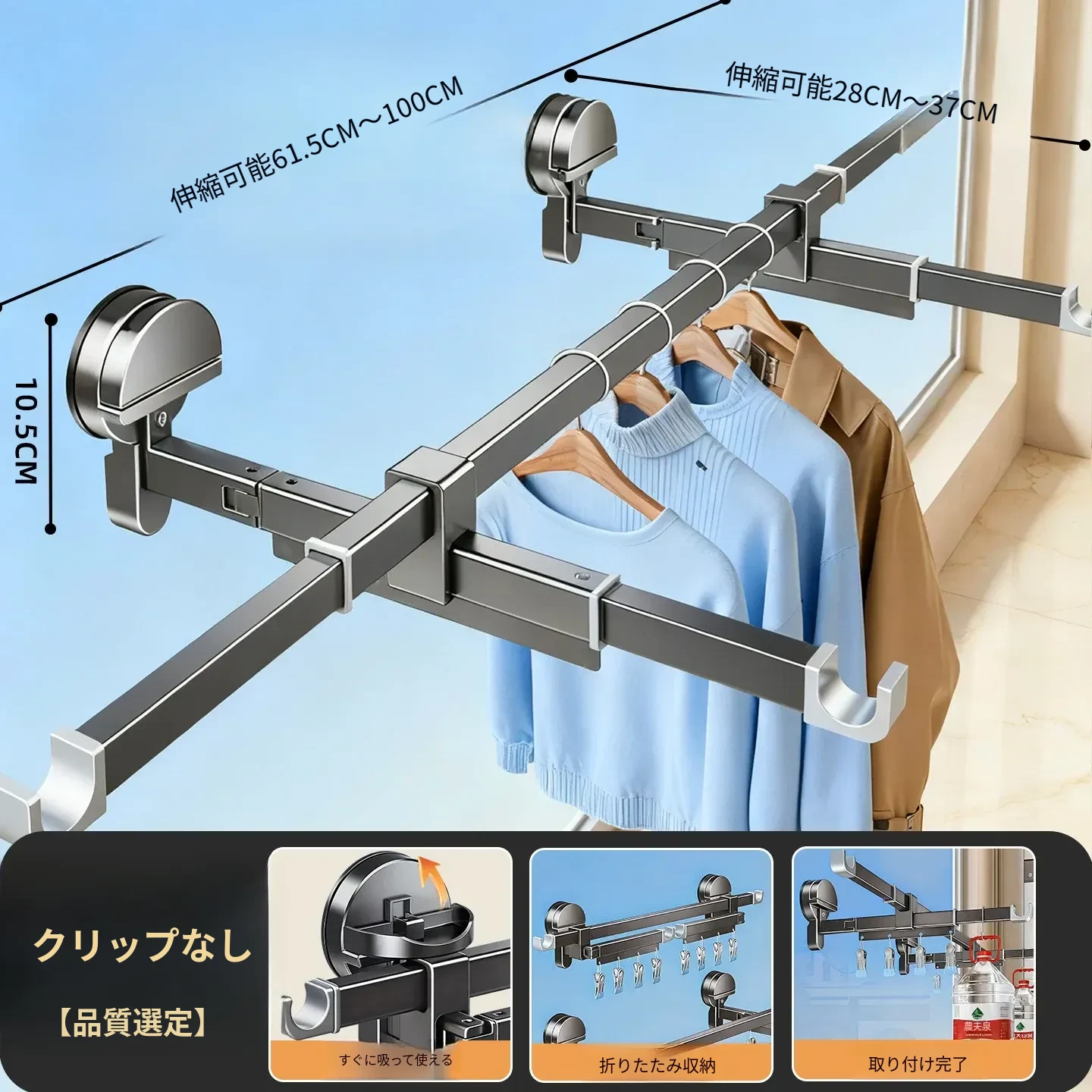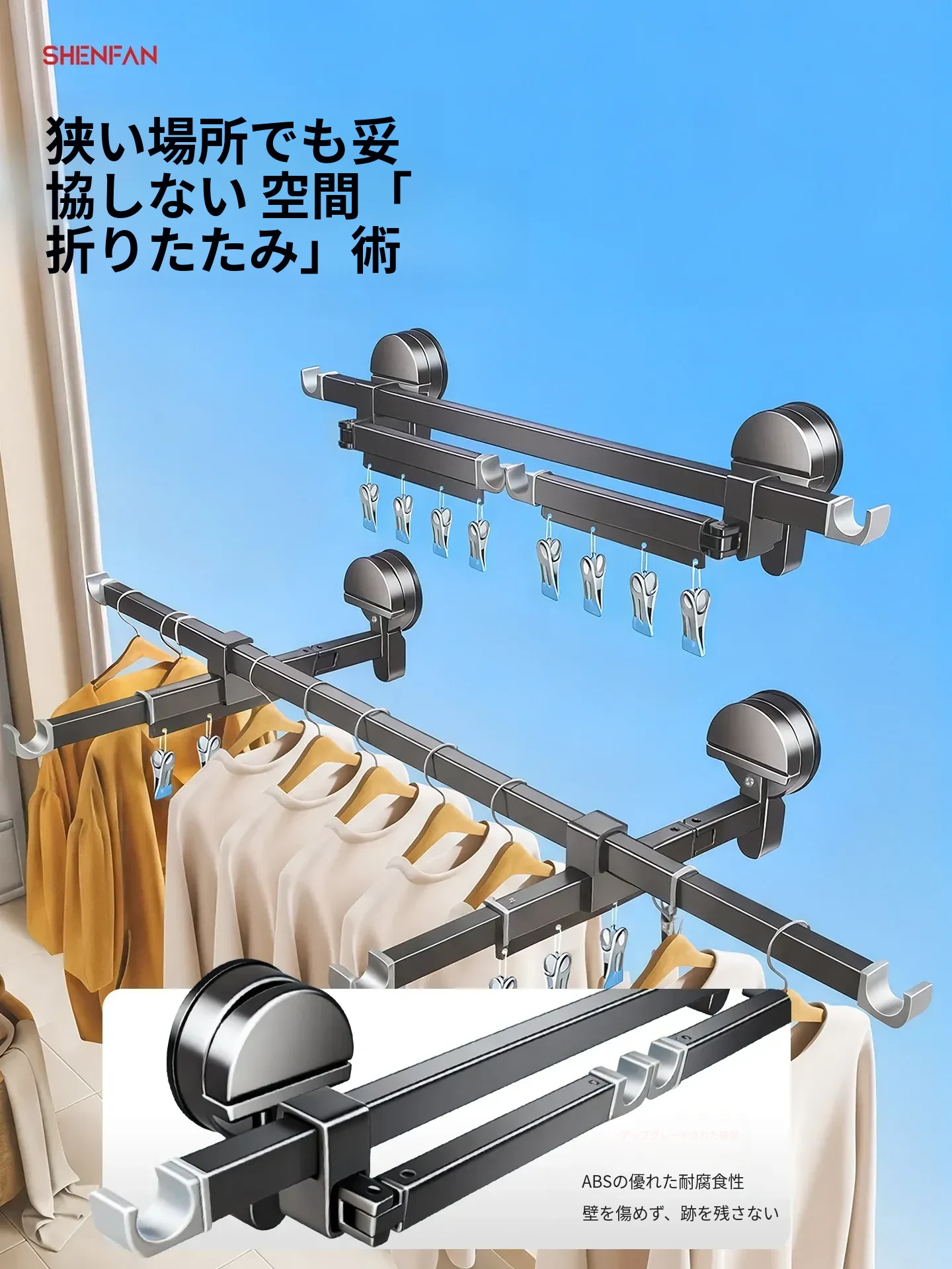 吸盤式折りたたみ物干しハンガー|隠れた伸縮機能で室内でも使える!バルコニーに最適な布団干し&衣類干しの必需品!家族のための便利アイテム!