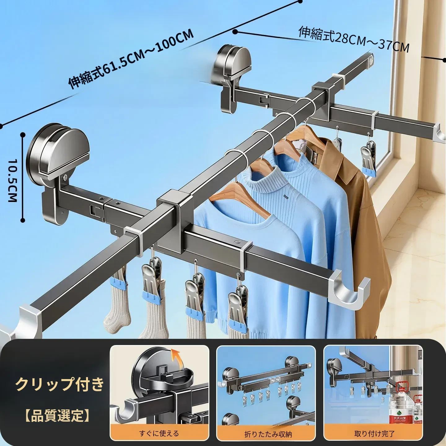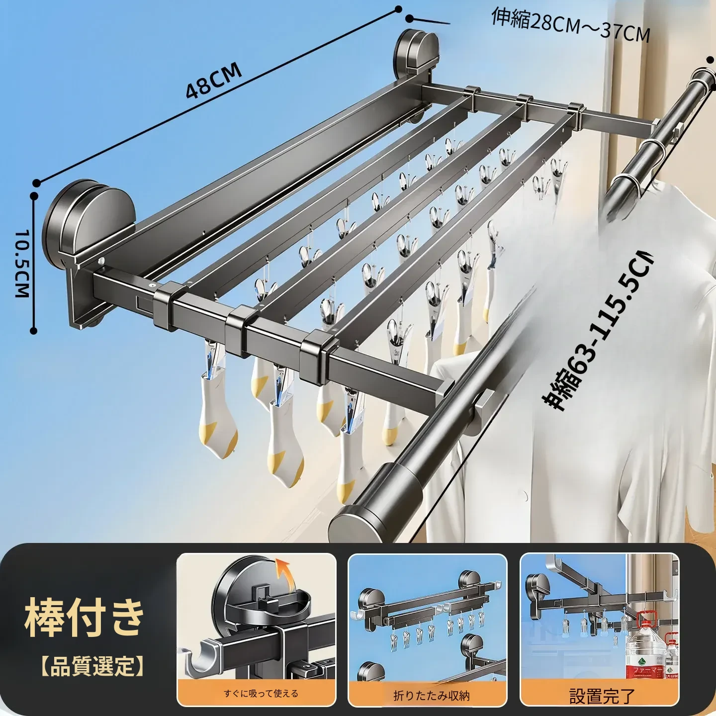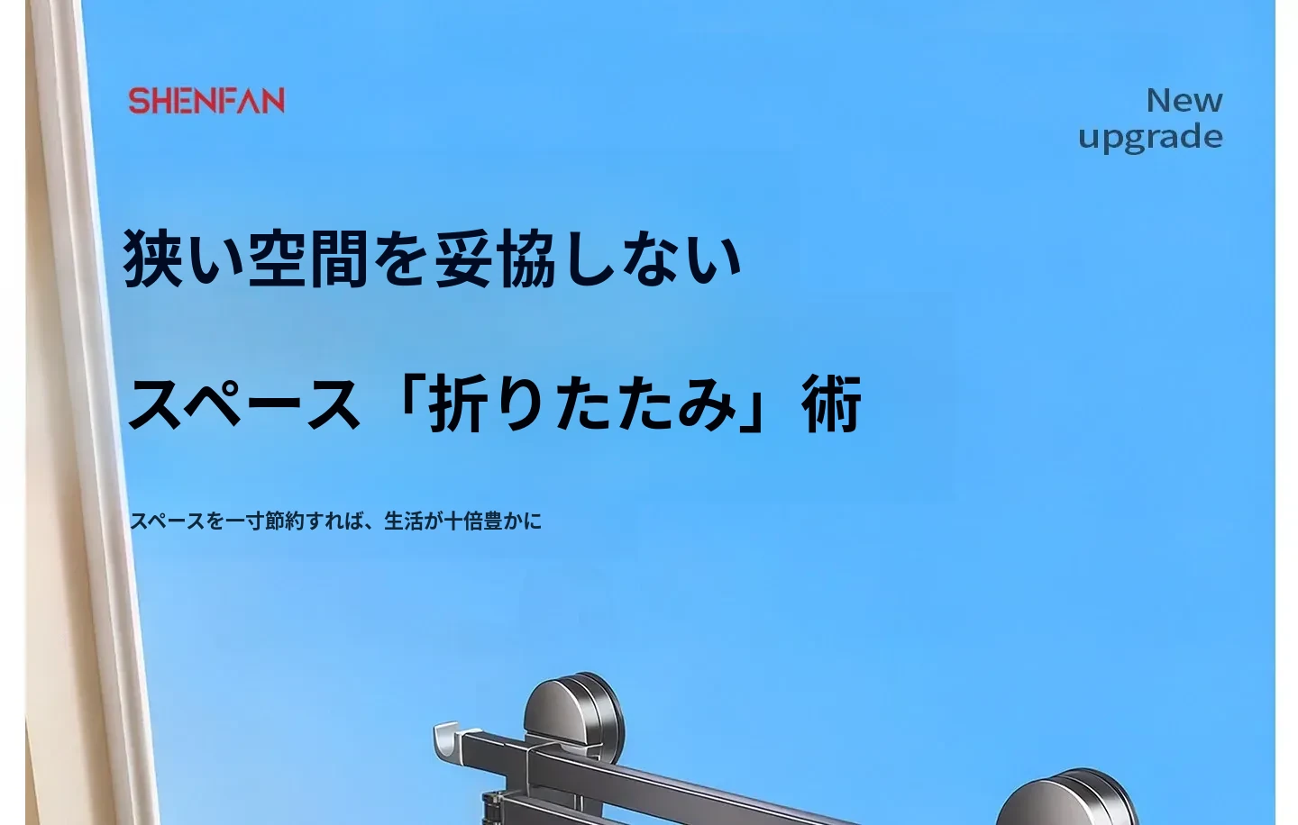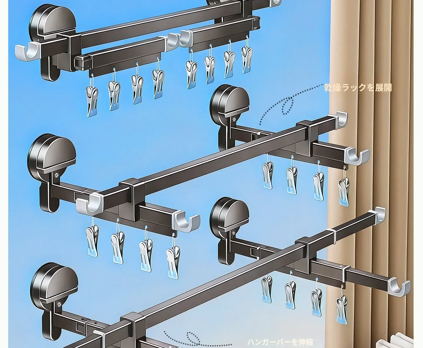 吸盤式折りたたみ物干しハンガー|隠れた伸縮機能で室内でも使える!バルコニーに最適な布団干し&衣類干しの必需品!家族のための便利アイテム!