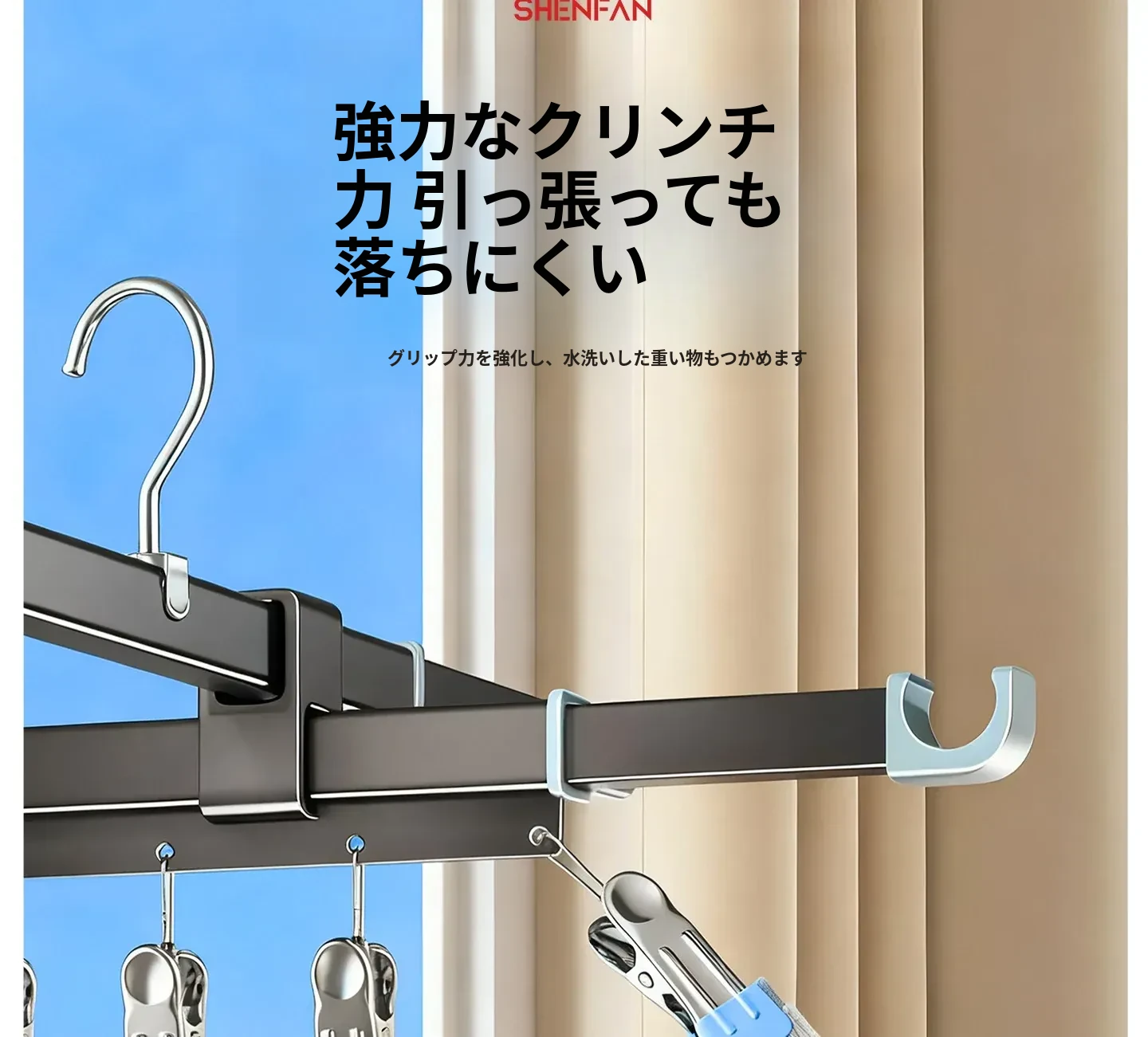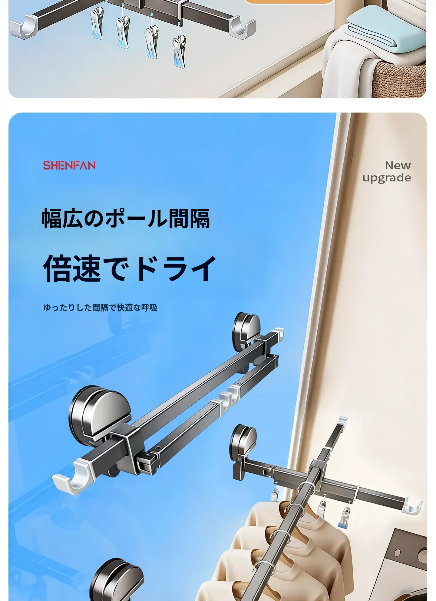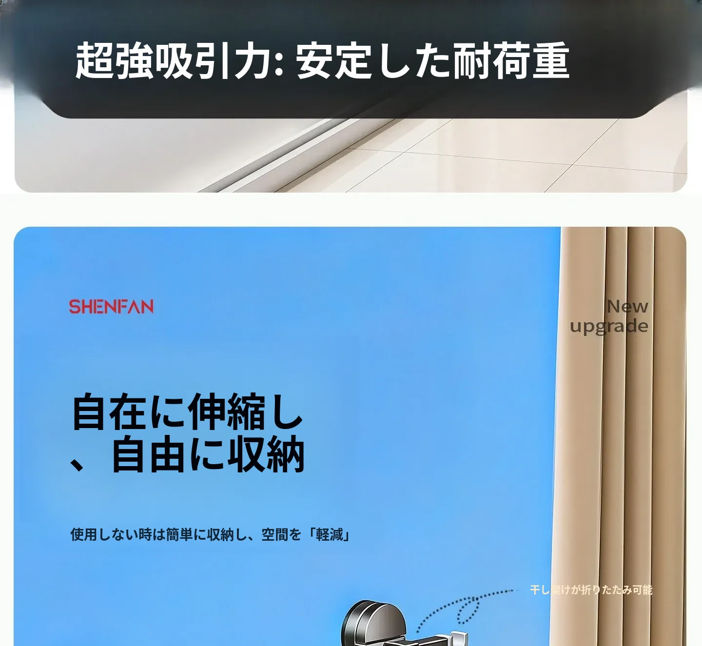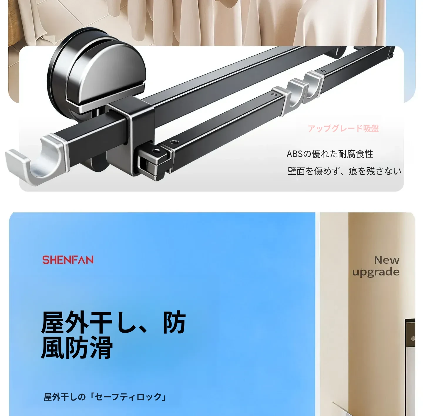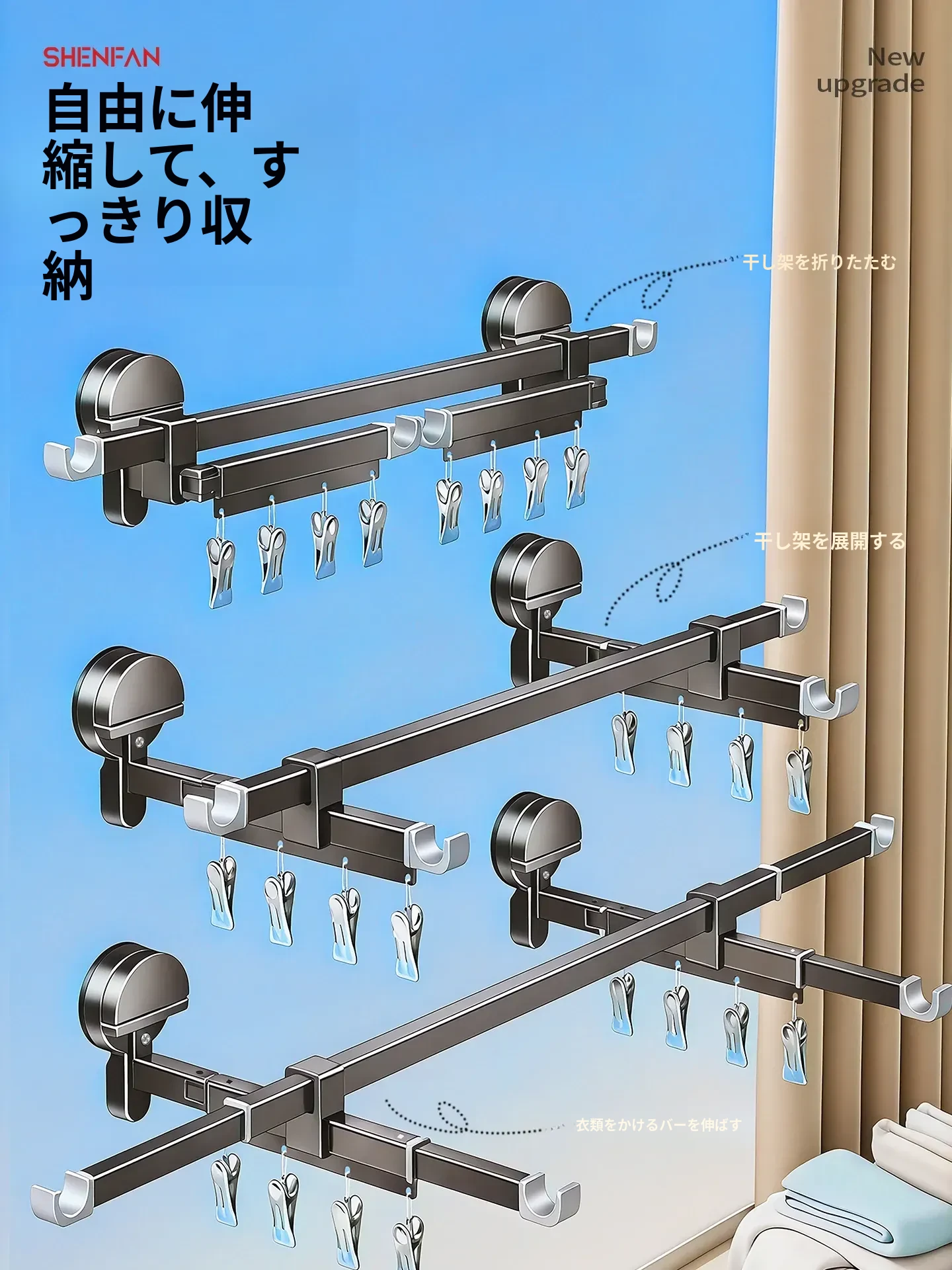 吸盤式折りたたみ物干しハンガー|隠れた伸縮機能で室内でも使える!バルコニーに最適な布団干し&衣類干しの必需品!家族のための便利アイテム!