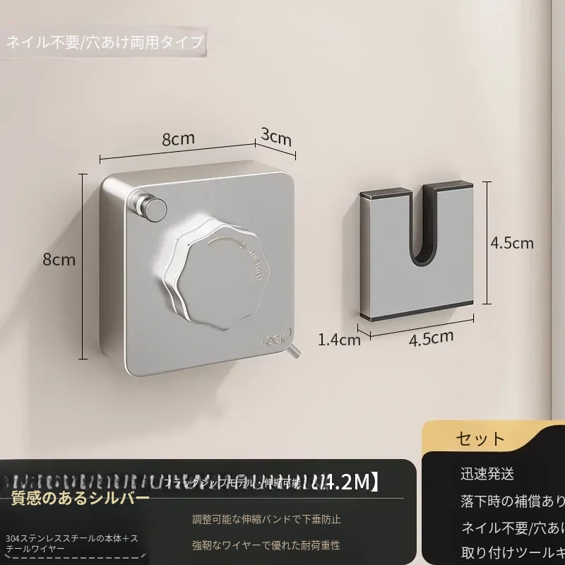 【銀色アップグレード版】屋内外共用穴なし伸縮4.2m鋼ロープ耐荷重40斤