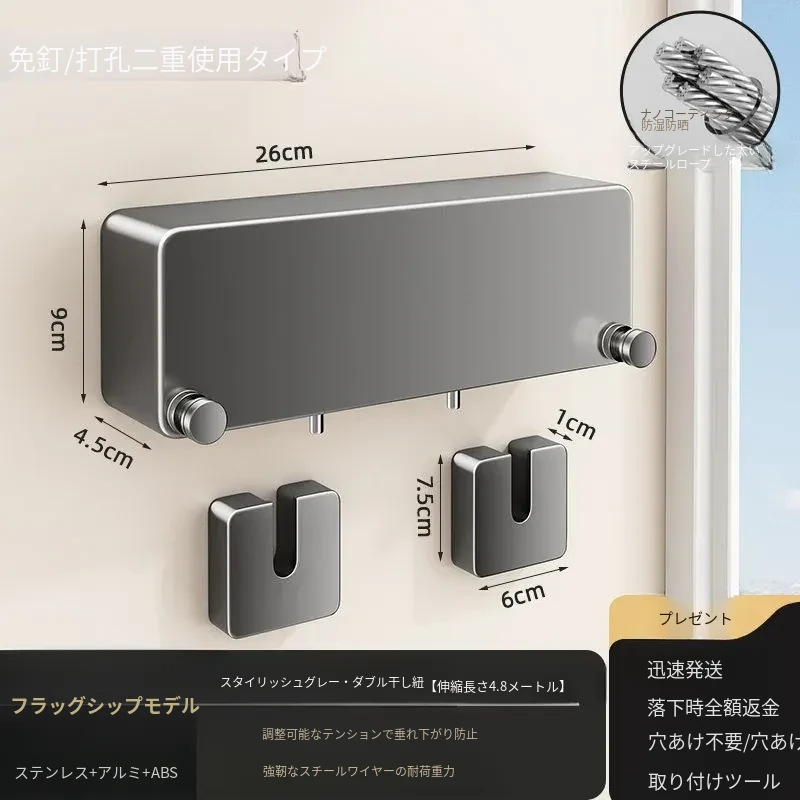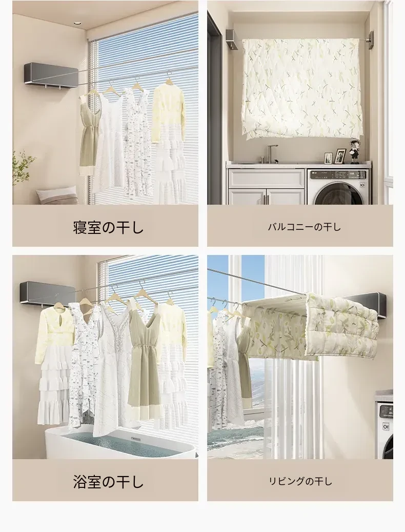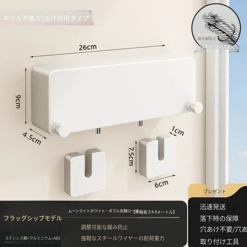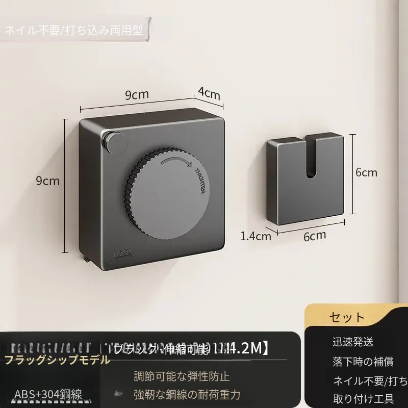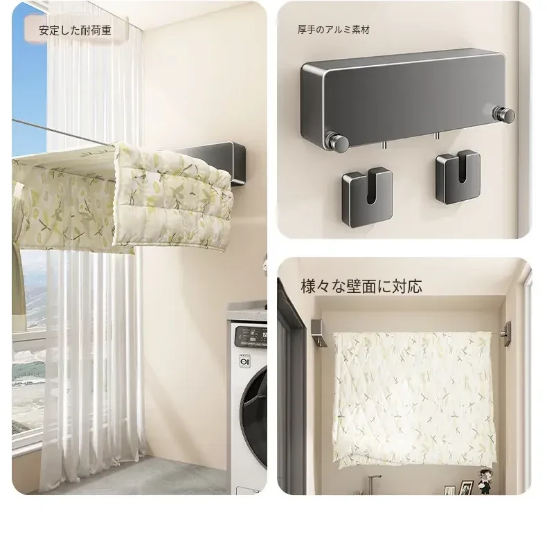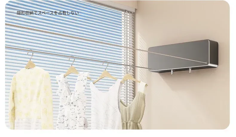 壁掛け式の伸縮性ワイヤー物干しロープ、穴を開けずに取り付け可能!衣類や布団を簡単に干せる便利なアイテム。家庭にぴったりの衣類干し神器!