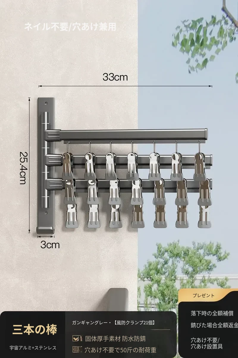 【グレー】3本21防風クリップ【180°左右回転】干し架