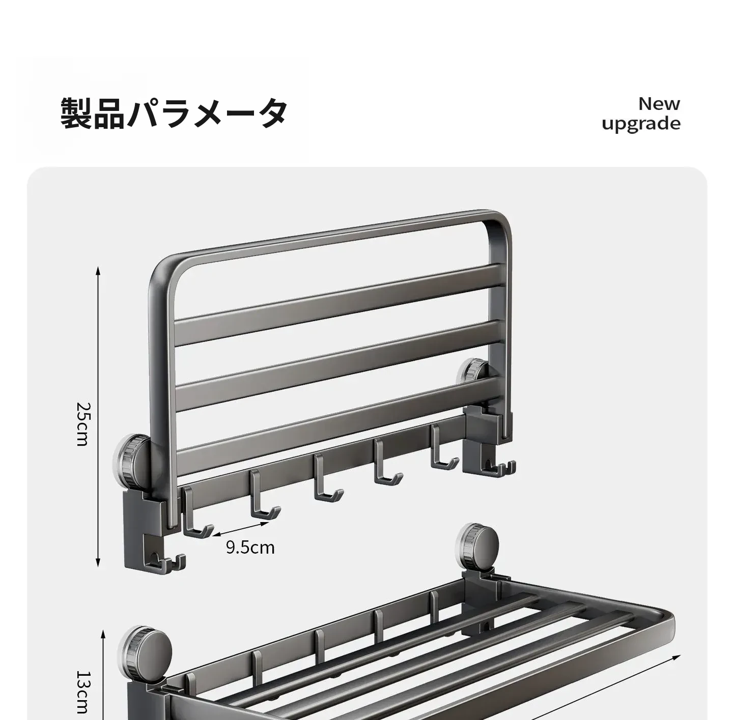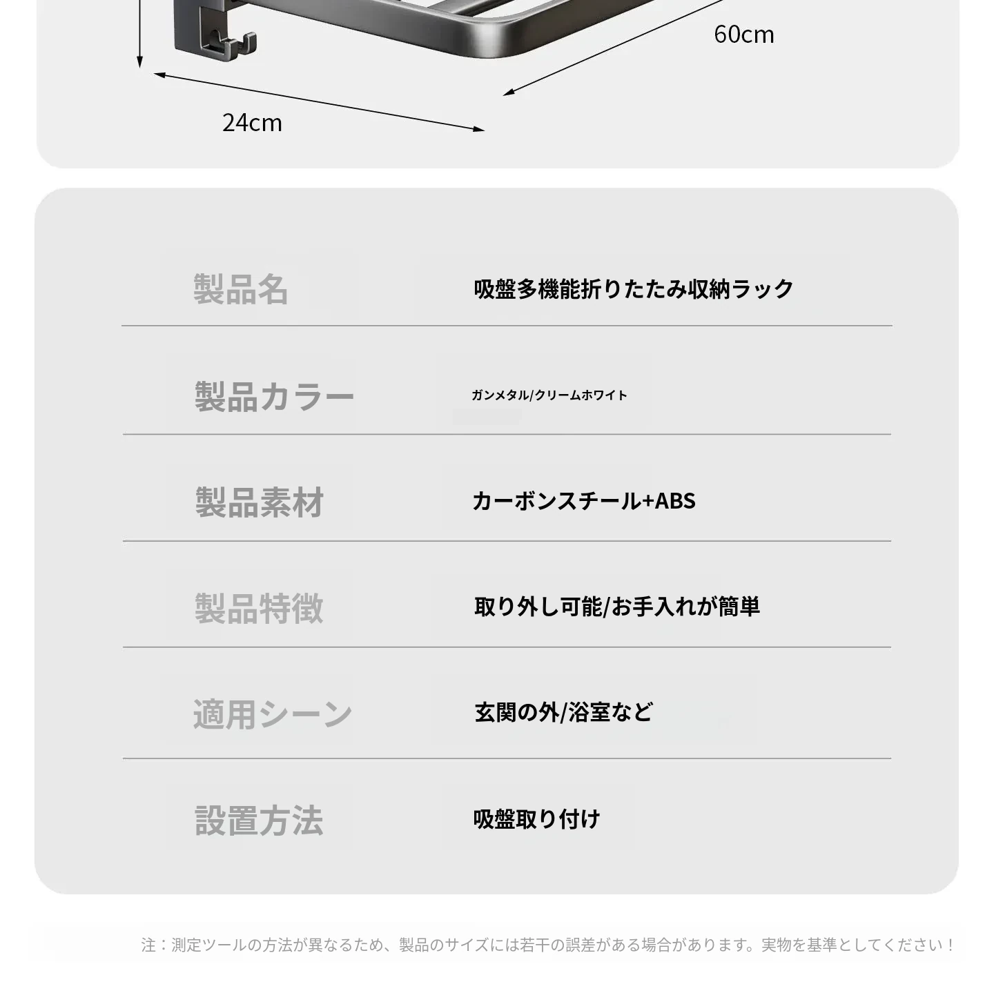 グレー-強力吸盤折りたたみ収納ラック60cm⭐返品対応
