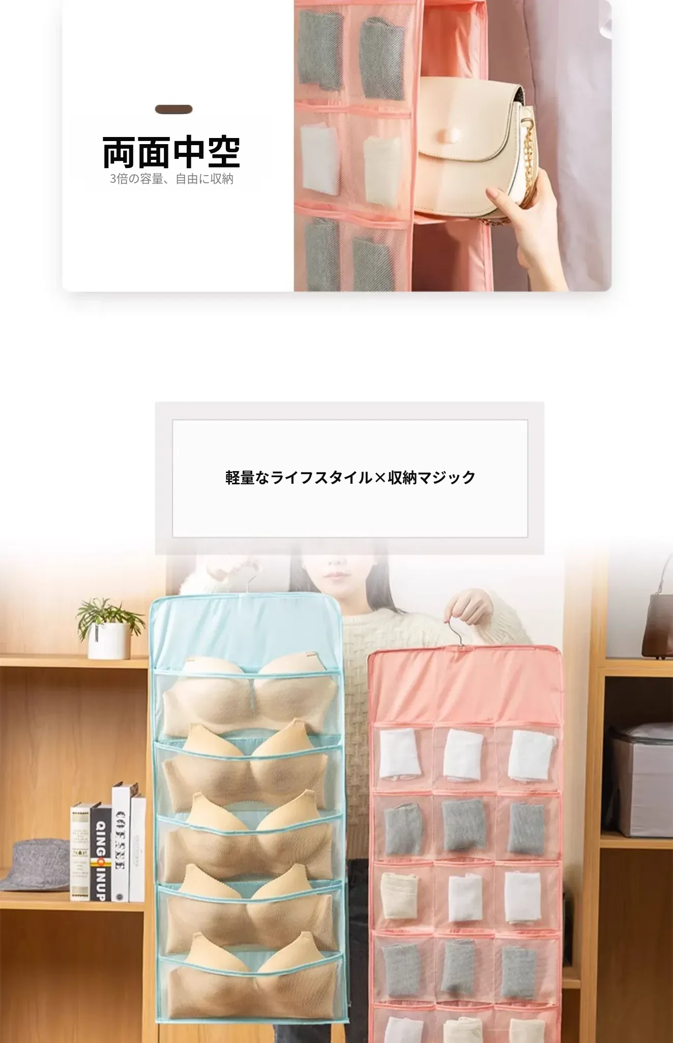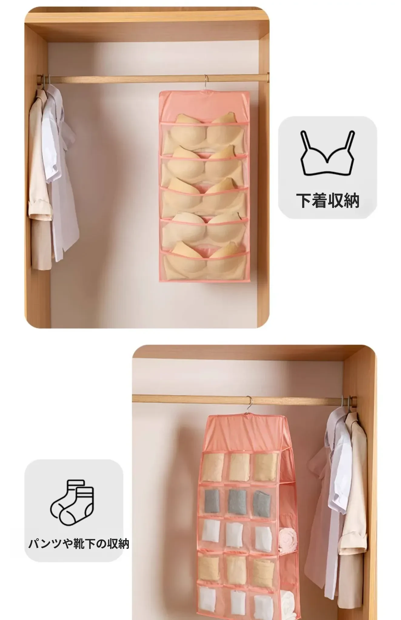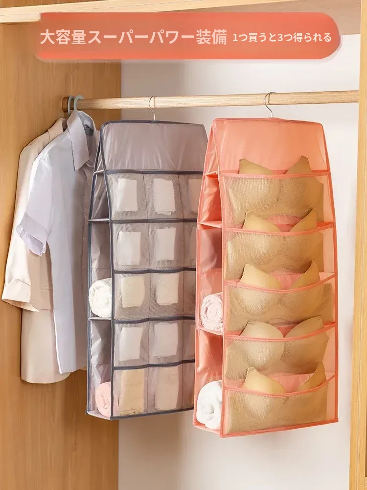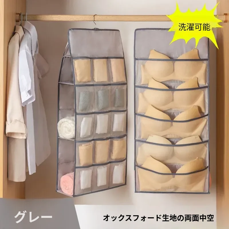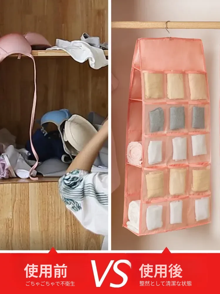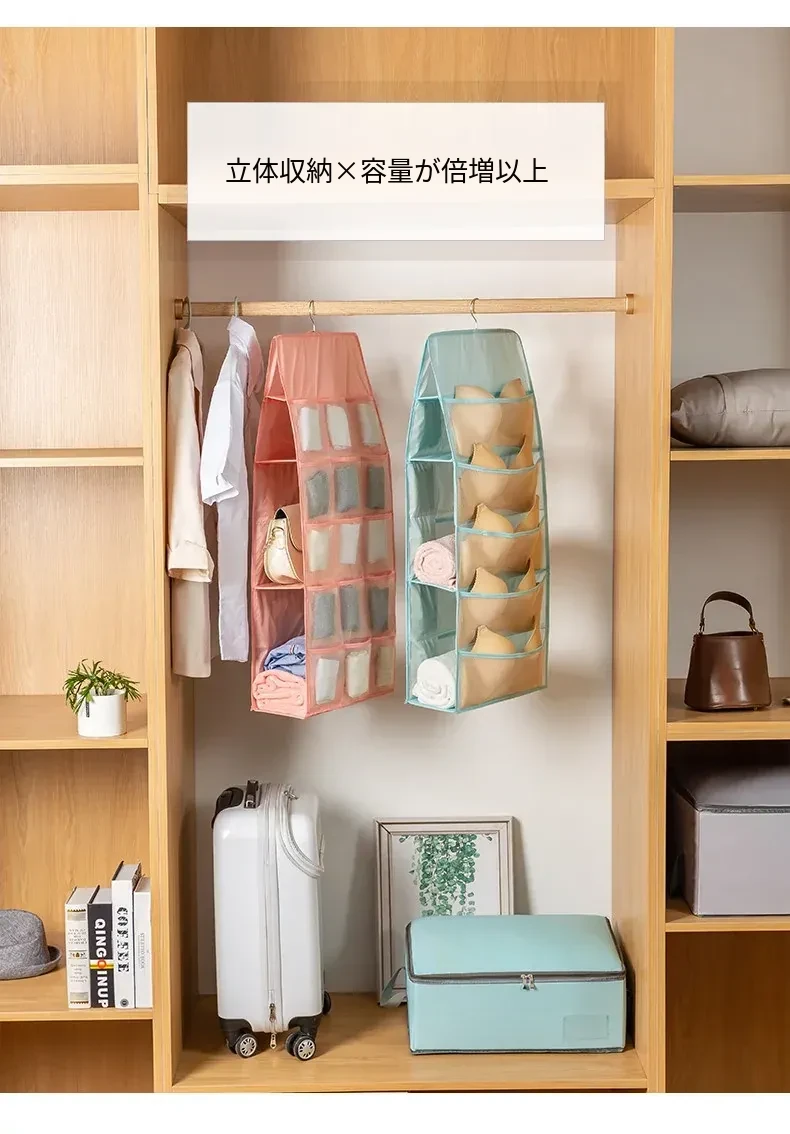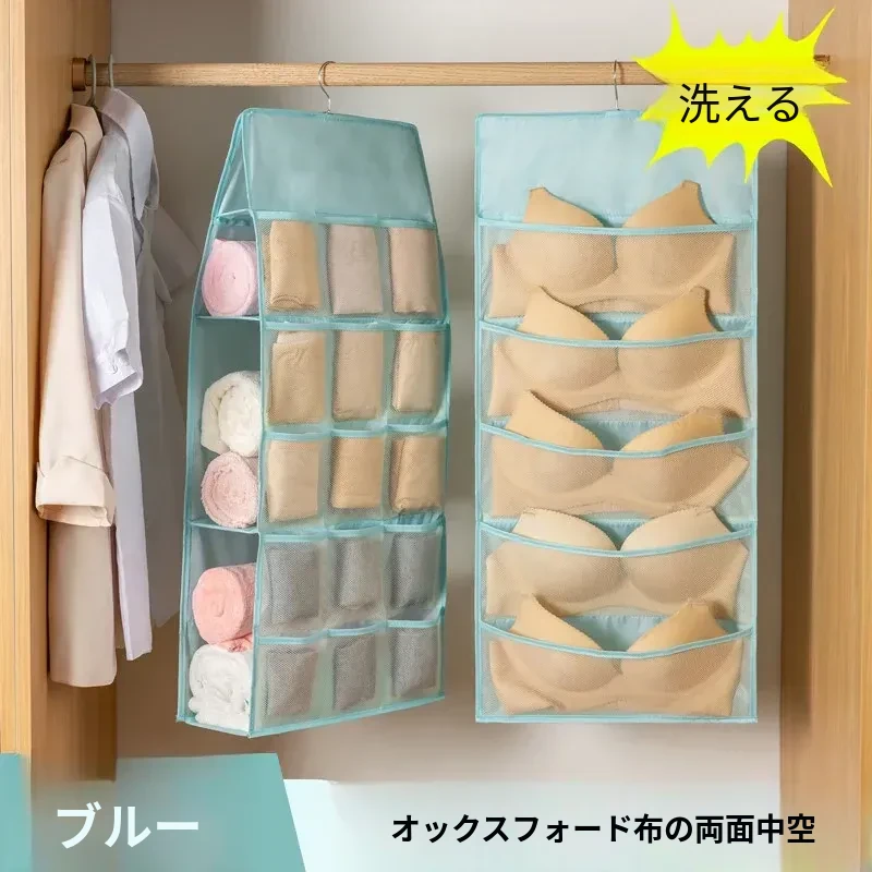 壁掛けインナー収納袋 - ベッドサイドやクローゼットに最適!下着、靴下、バッグをすっきり整理できる便利な収納グッズ。寮生活や狭いスペースにぴったりの整理整頓アイテム!