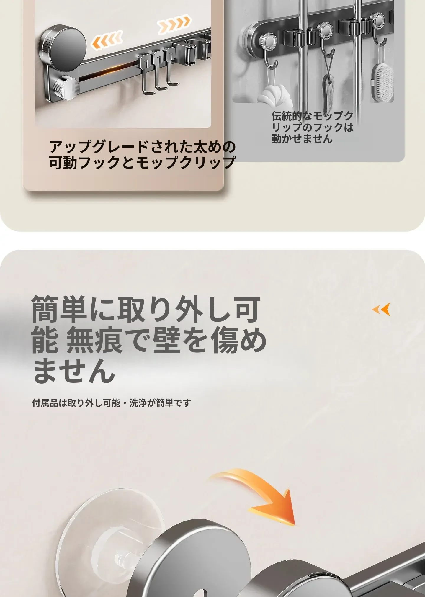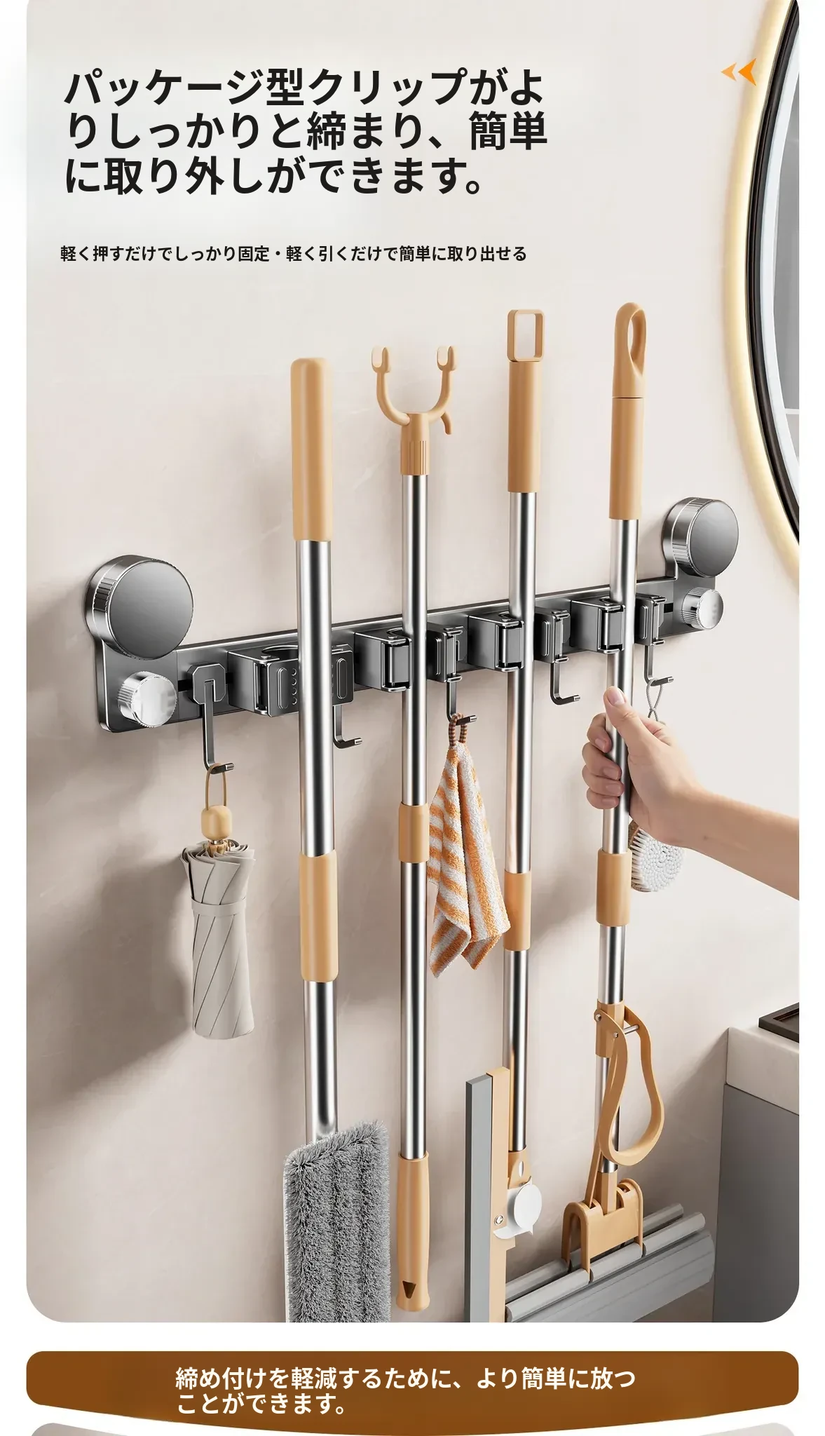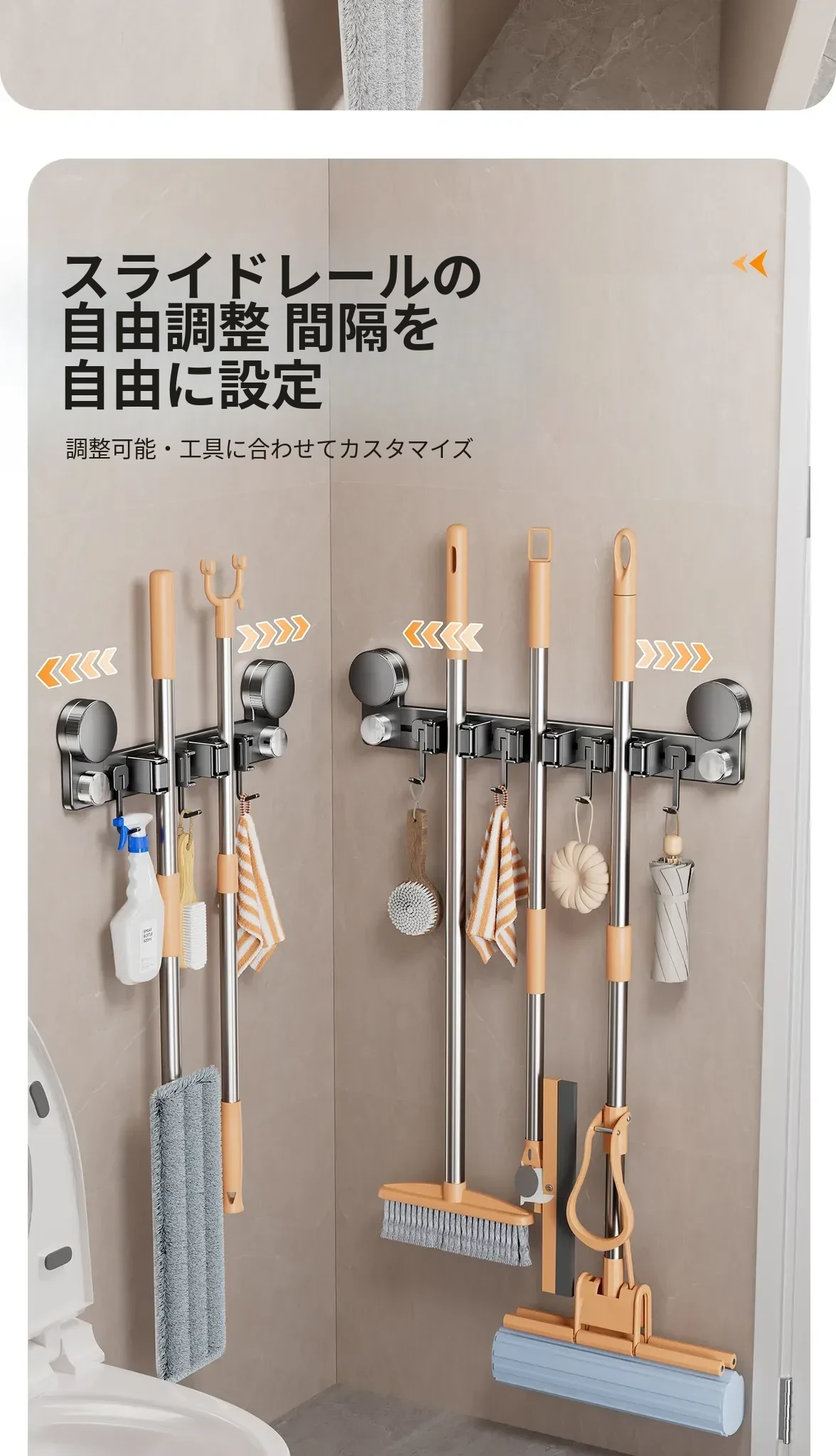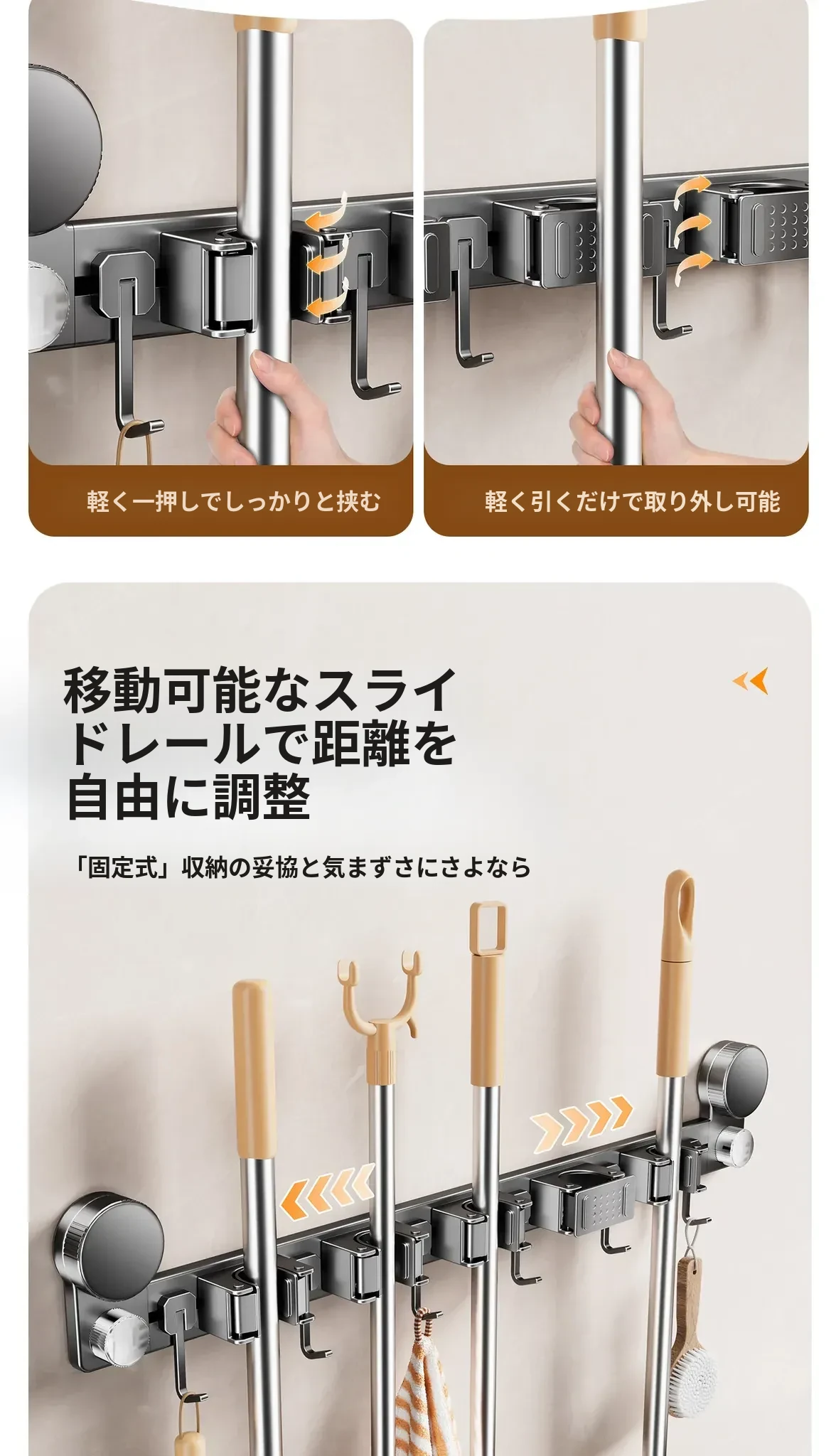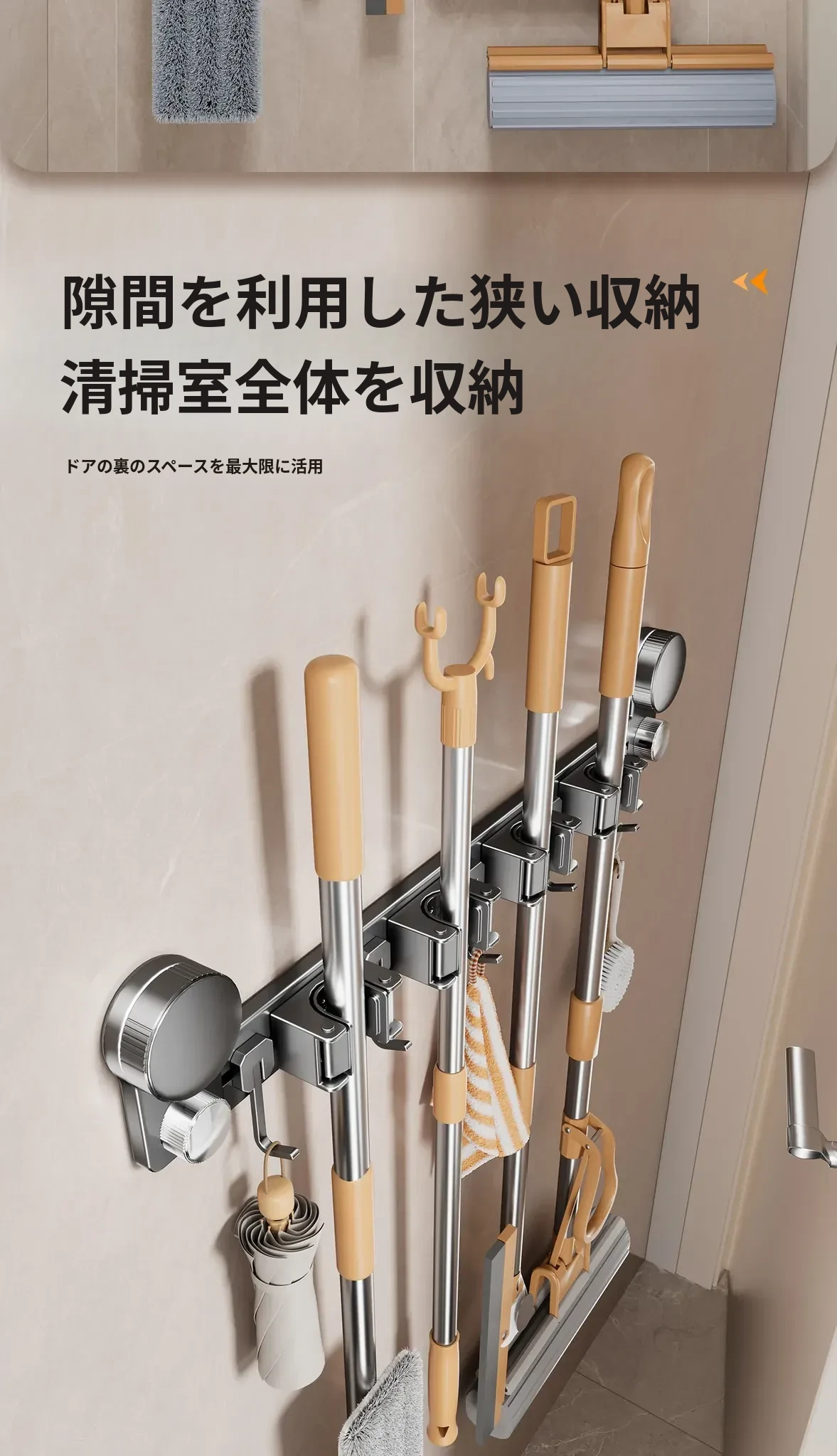 吸盤モップ壁掛けクリーム風 - 穴あけ不要で簡単取り付け!トイレ用モップやほうき、雑巾の収納に最適な便利グッズ!クリーンな空間を演出するスマートな収納ソリューション!