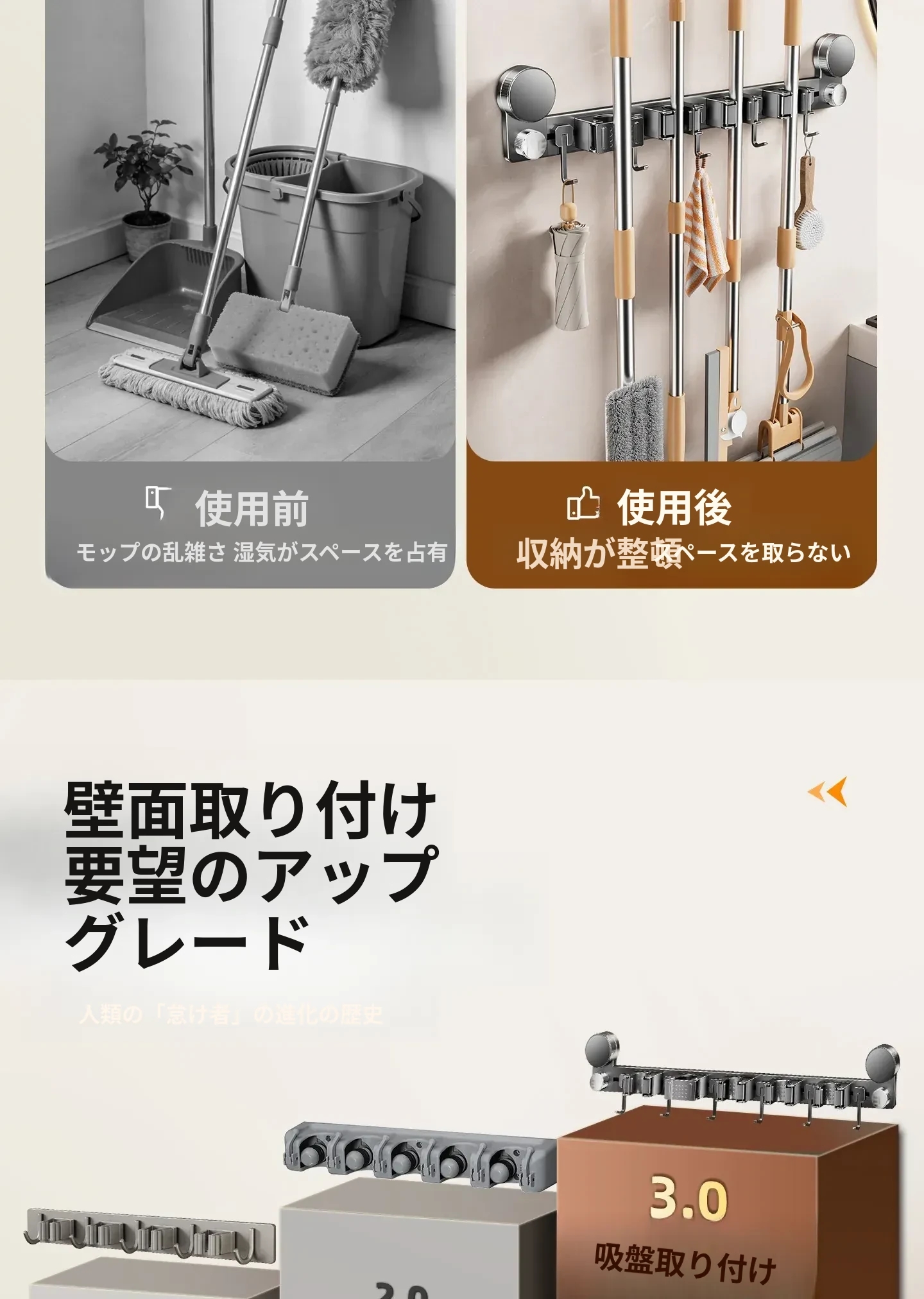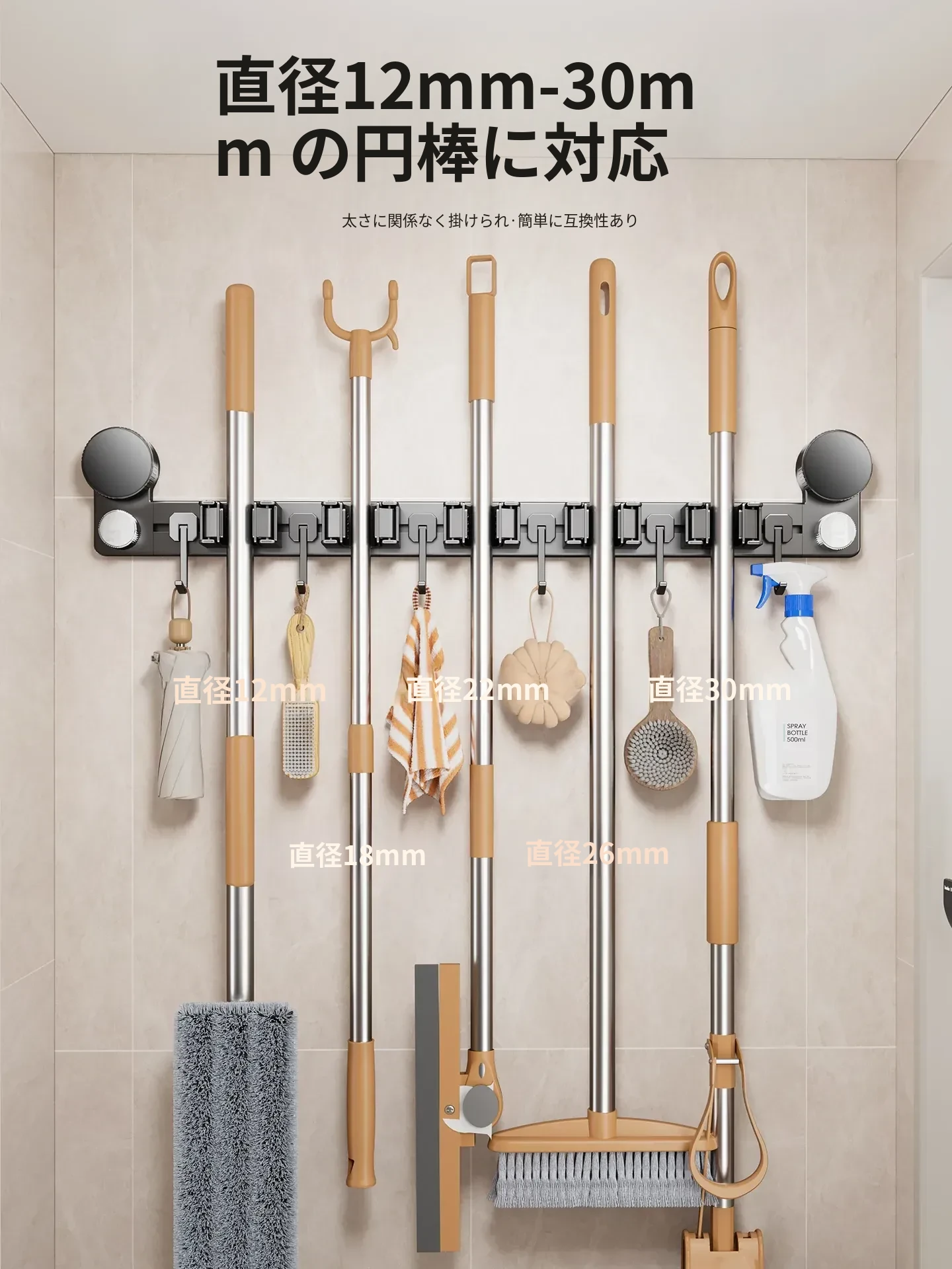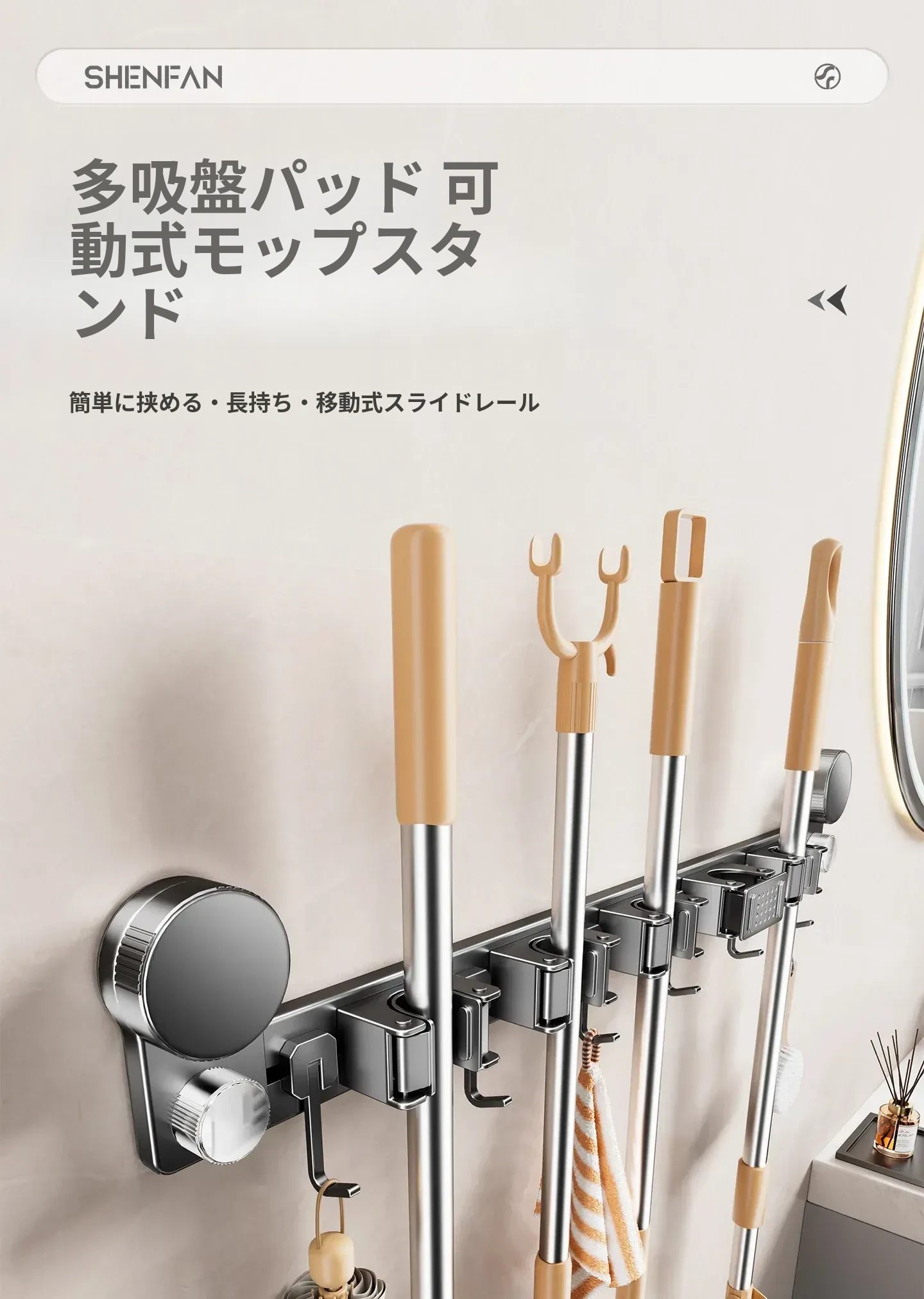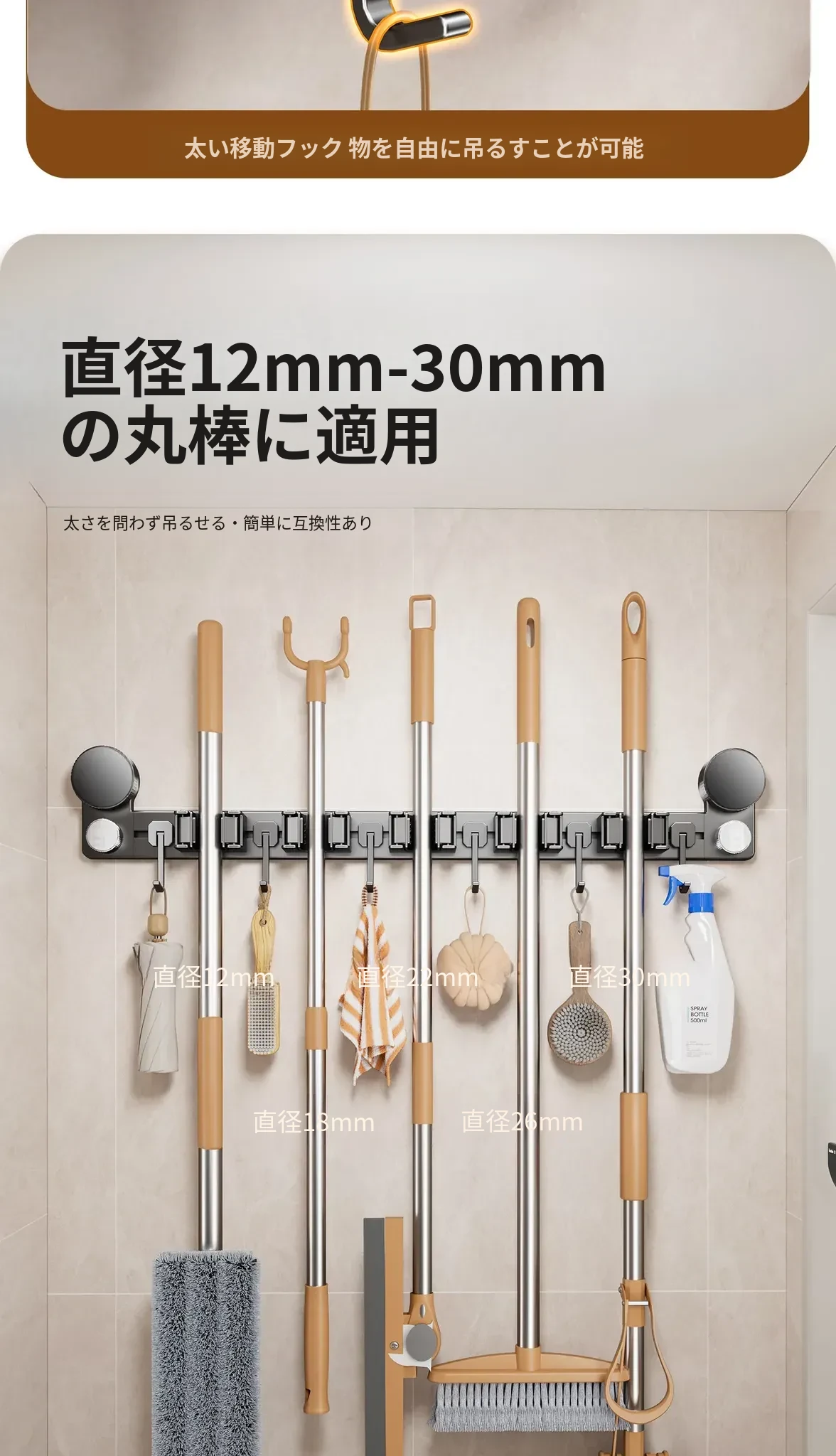 吸盤モップ壁掛けクリーム風 - 穴あけ不要で簡単取り付け!トイレ用モップやほうき、雑巾の収納に最適な便利グッズ!クリーンな空間を演出するスマートな収納ソリューション!