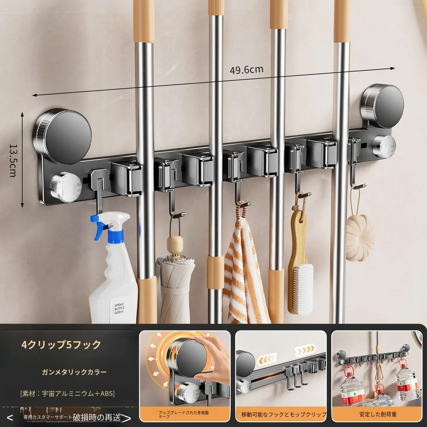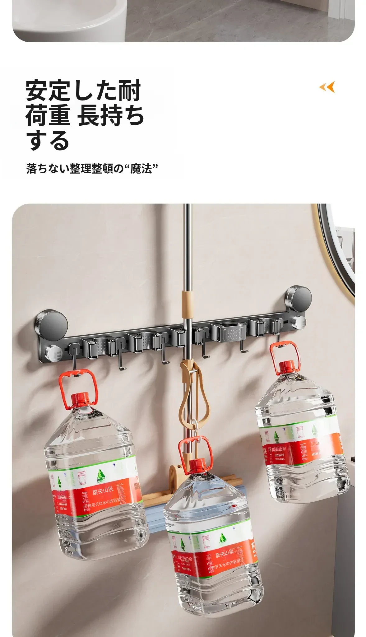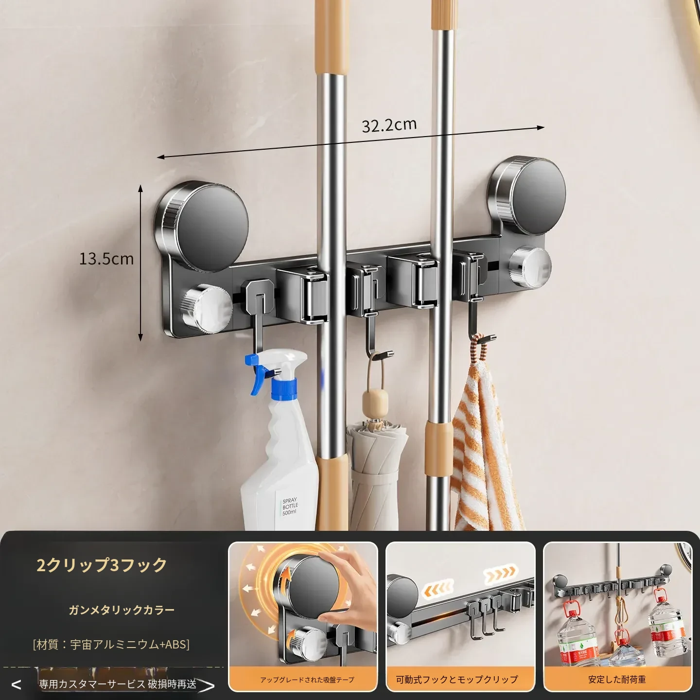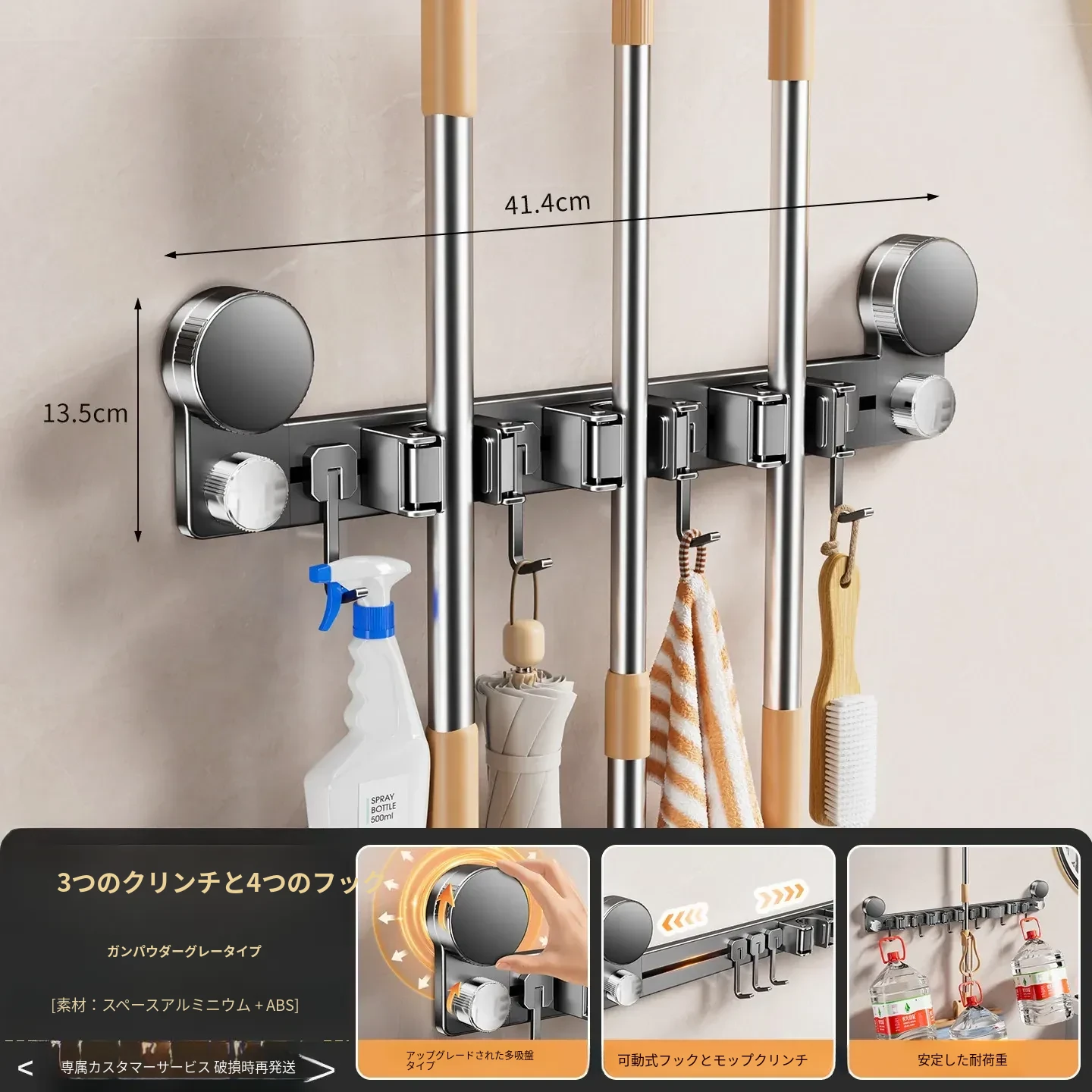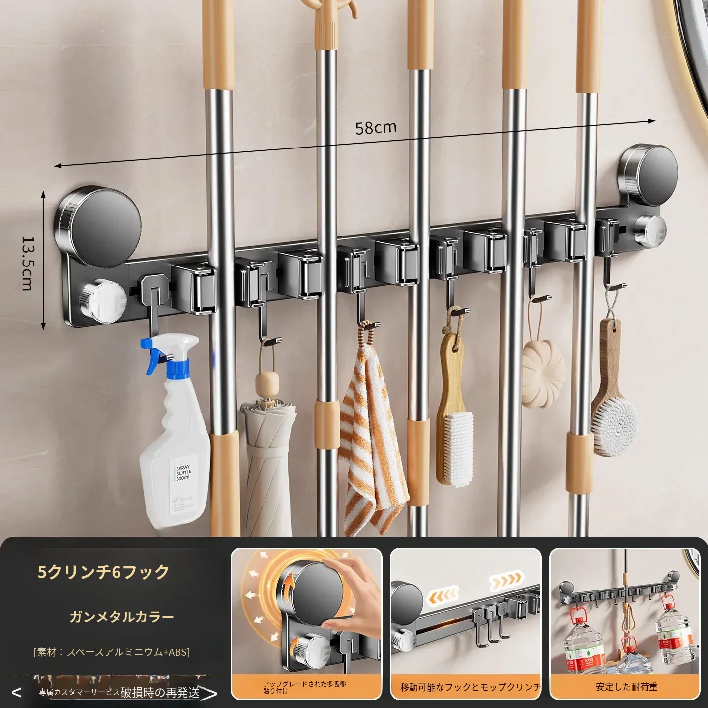 吸盤モップ壁掛けクリーム風 - 穴あけ不要で簡単取り付け!トイレ用モップやほうき、雑巾の収納に最適な便利グッズ!クリーンな空間を演出するスマートな収納ソリューション!