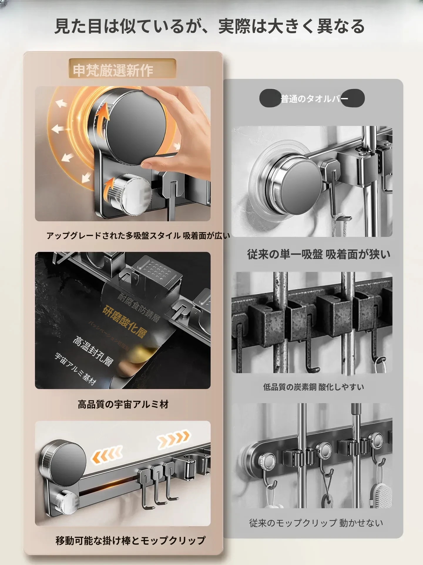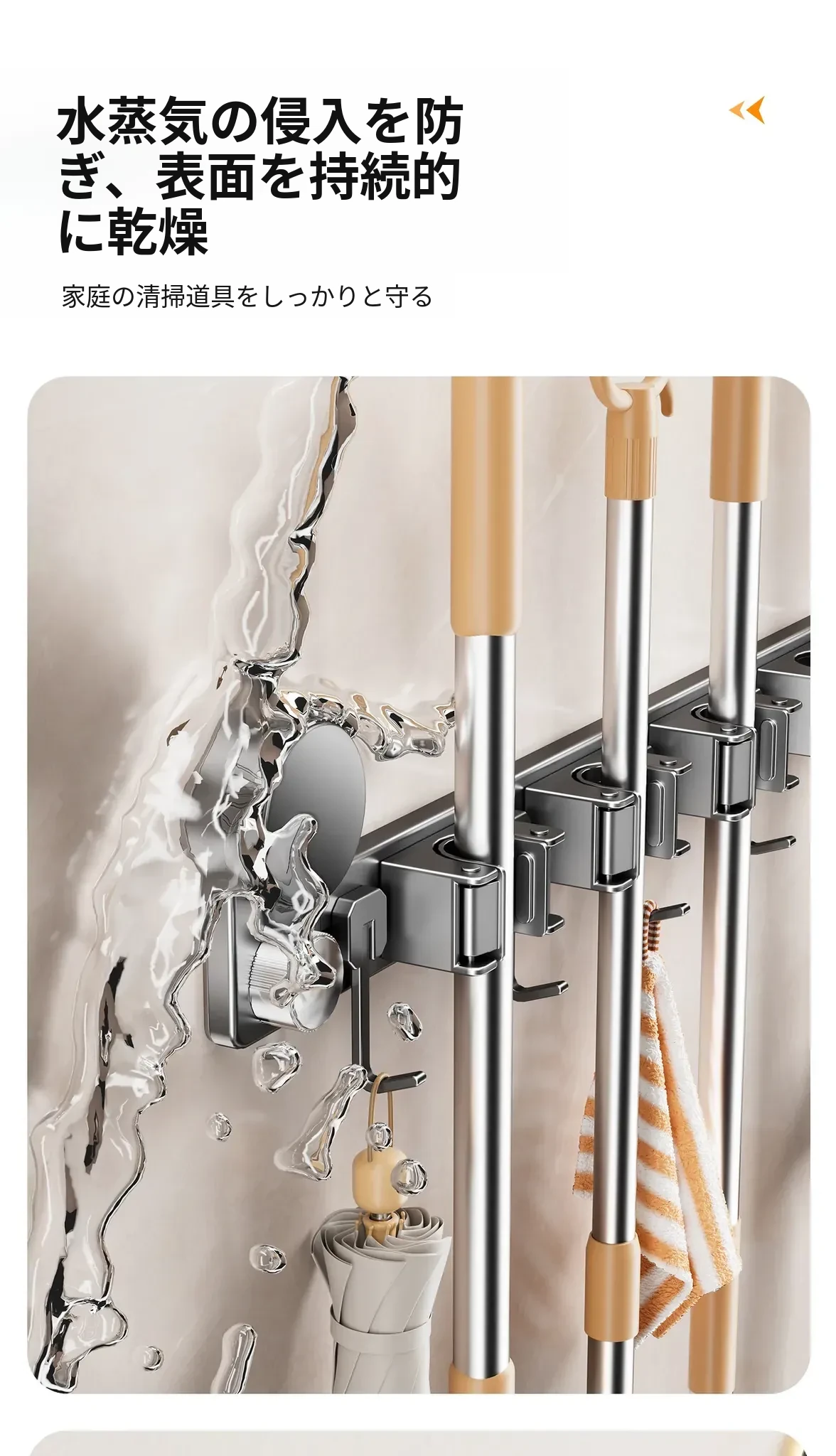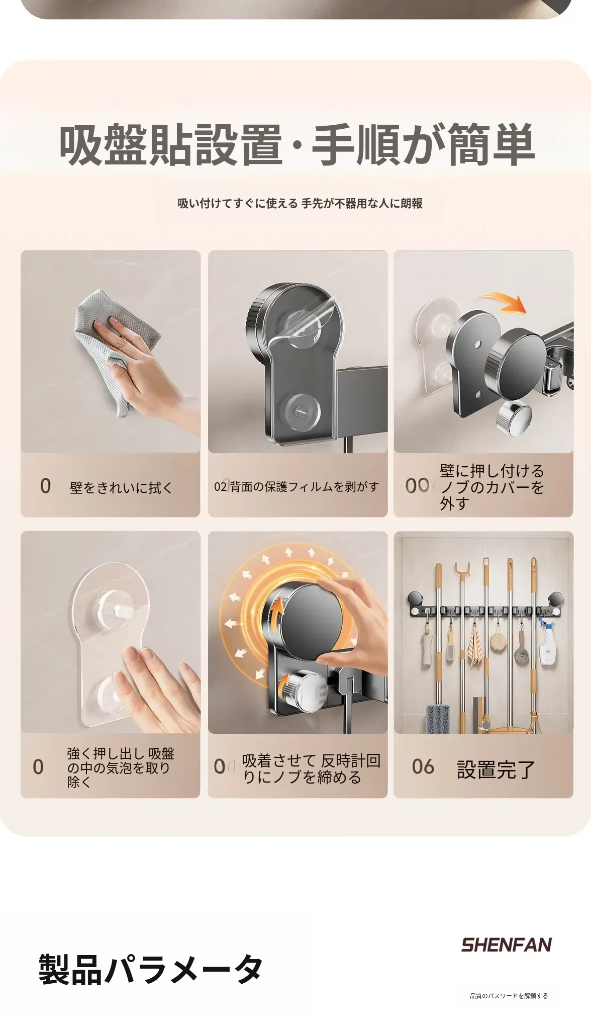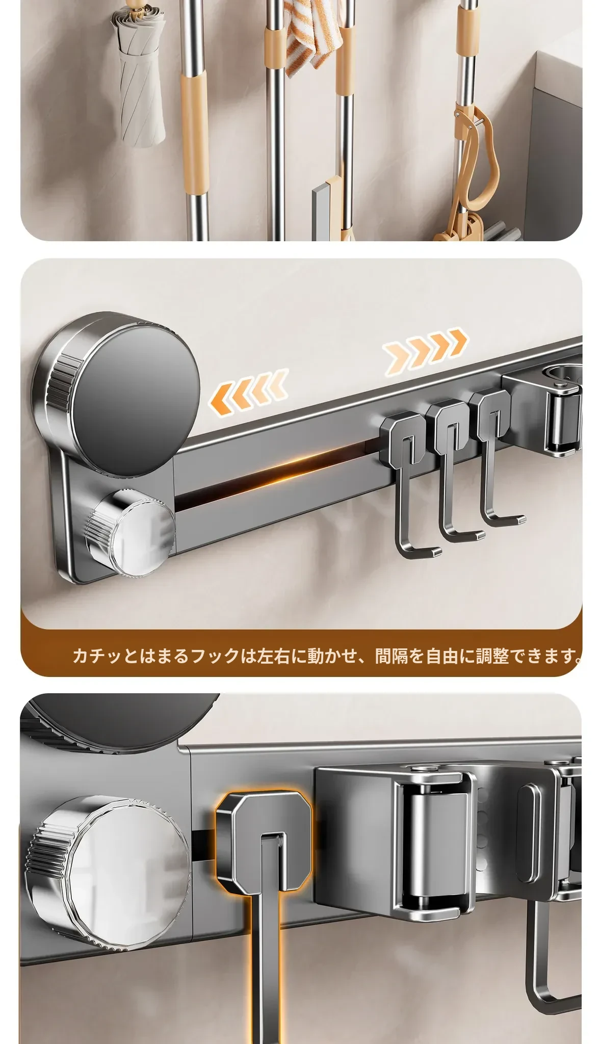 吸盤モップ壁掛けクリーム風 - 穴あけ不要で簡単取り付け!トイレ用モップやほうき、雑巾の収納に最適な便利グッズ!クリーンな空間を演出するスマートな収納ソリューション!