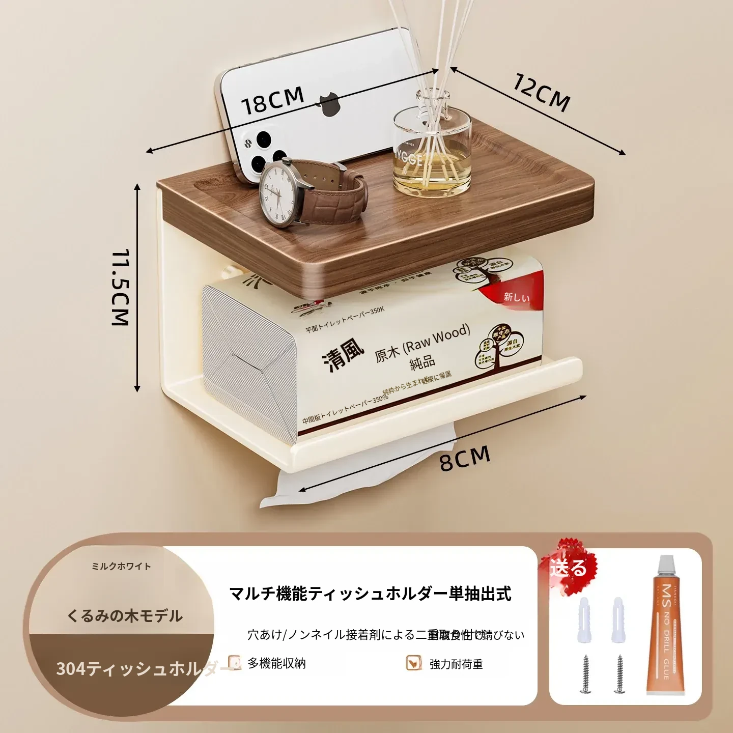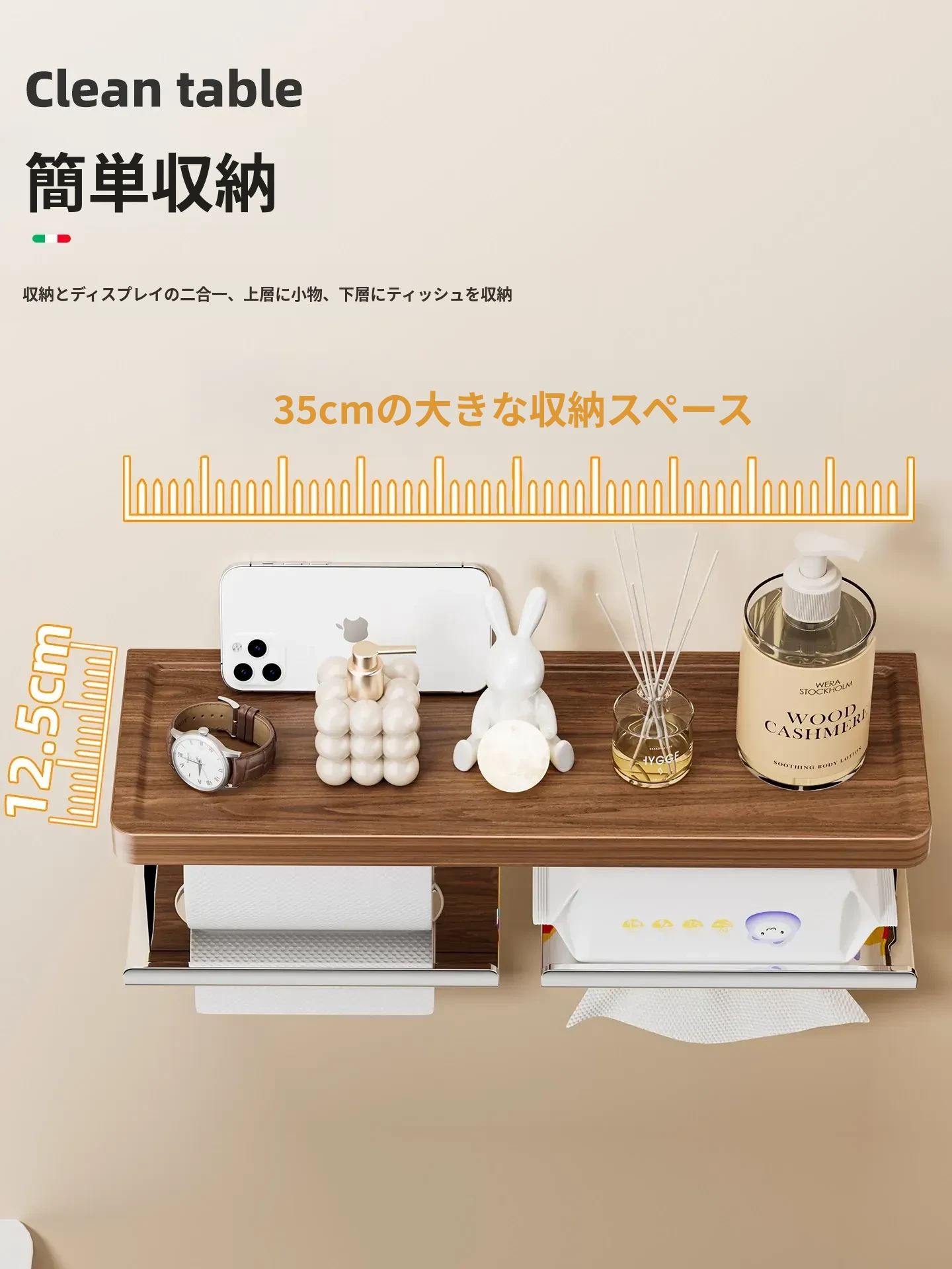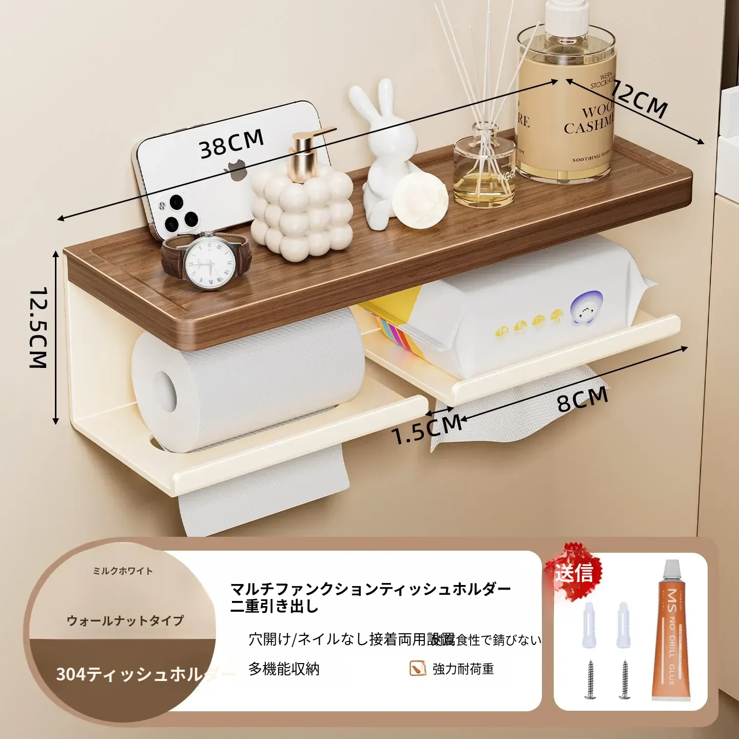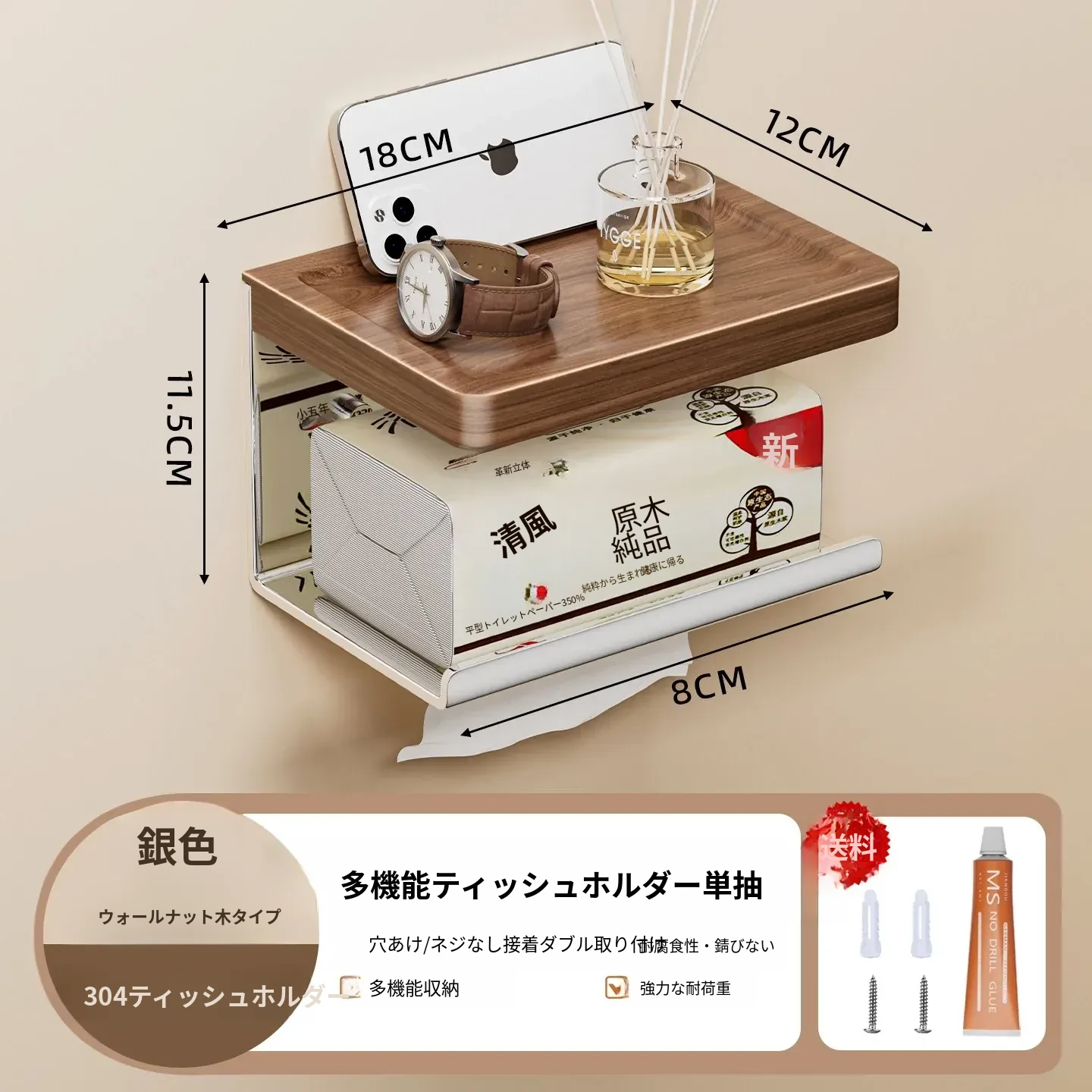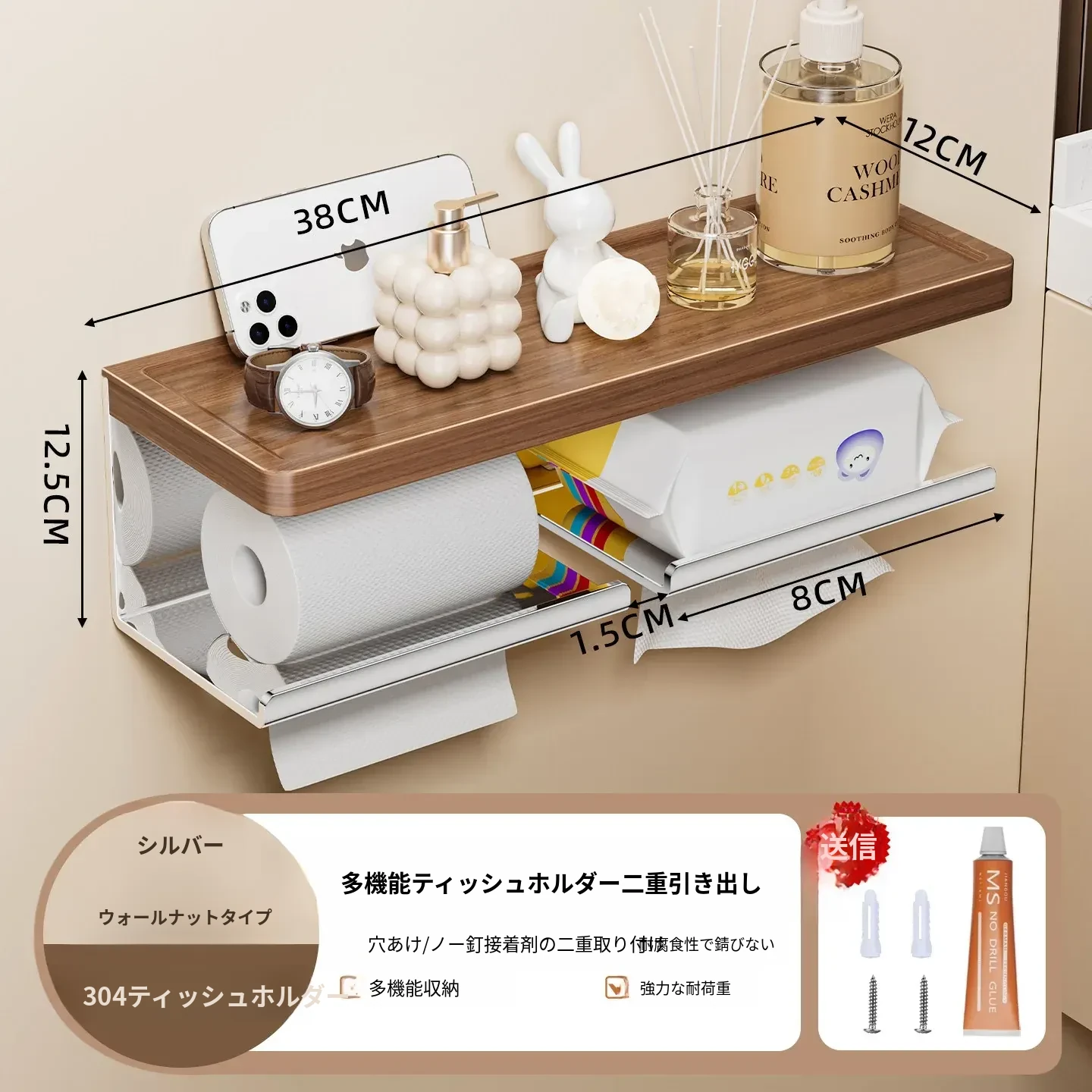 ウォールナット製トイレットペーパーホルダー、穴あけ不要!304ステンレス製のバスルーム&トイレ用ティッシュラック、スタイリッシュな収納で空間を美しく演出します。