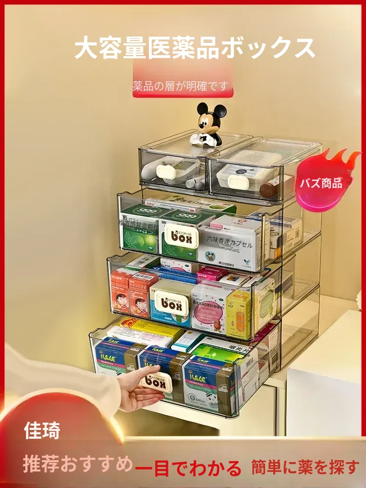 家庭用大容量透明薬箱!多層引き出し式で、毎日の常備薬をすっきり収納。便利さと整理整頓を両立した、あなたの健康管理の強い味方です!