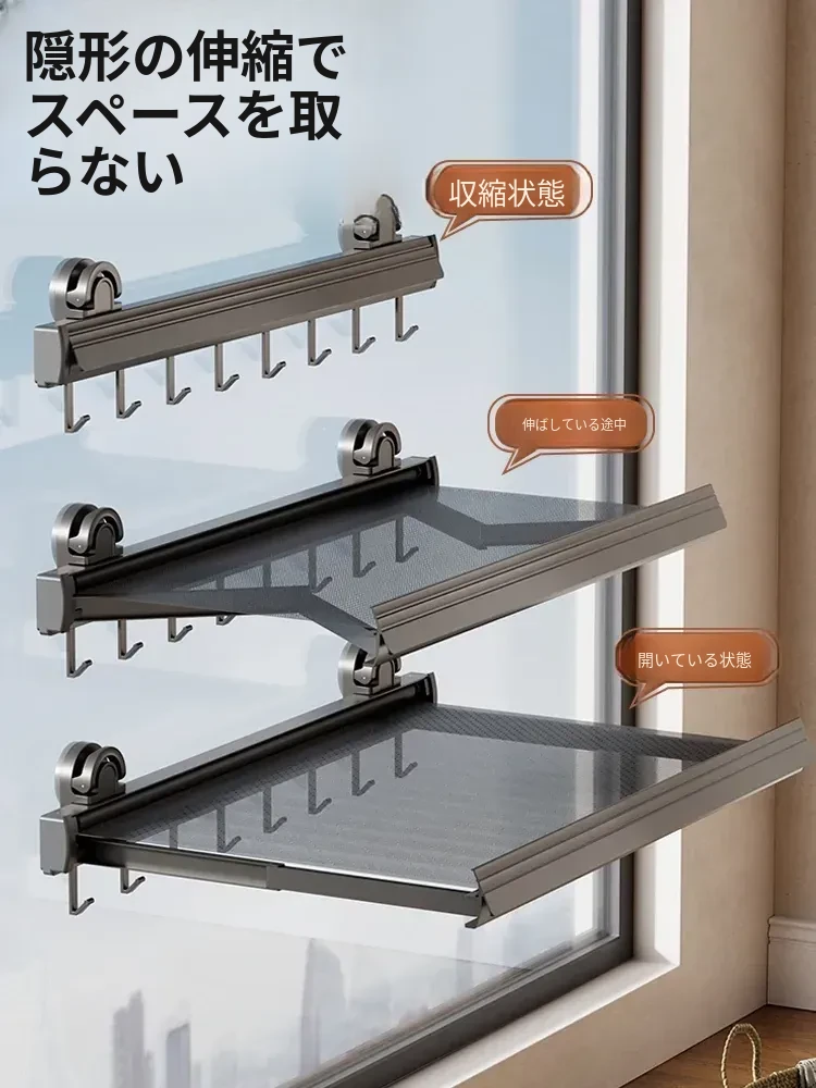 バルコニー用の隠れた吸盤式物干しラック!スペースアルミ製で穴を開けずに取り付け可能。窓際で洗濯物を簡単に干せる伸縮ネット!靴下や靴も楽々乾燥できる便利アイテムです!