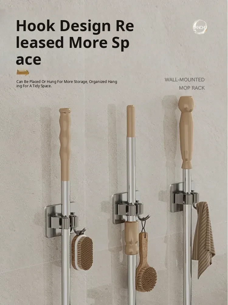 Stainless Steel Mop Wall-Mount Holder - No Drilling Required! Perfect for Bathroom Mop Storage, Durable Hook and Clip for Sweeper Organization - A Must-Have Cleaning Accessory!