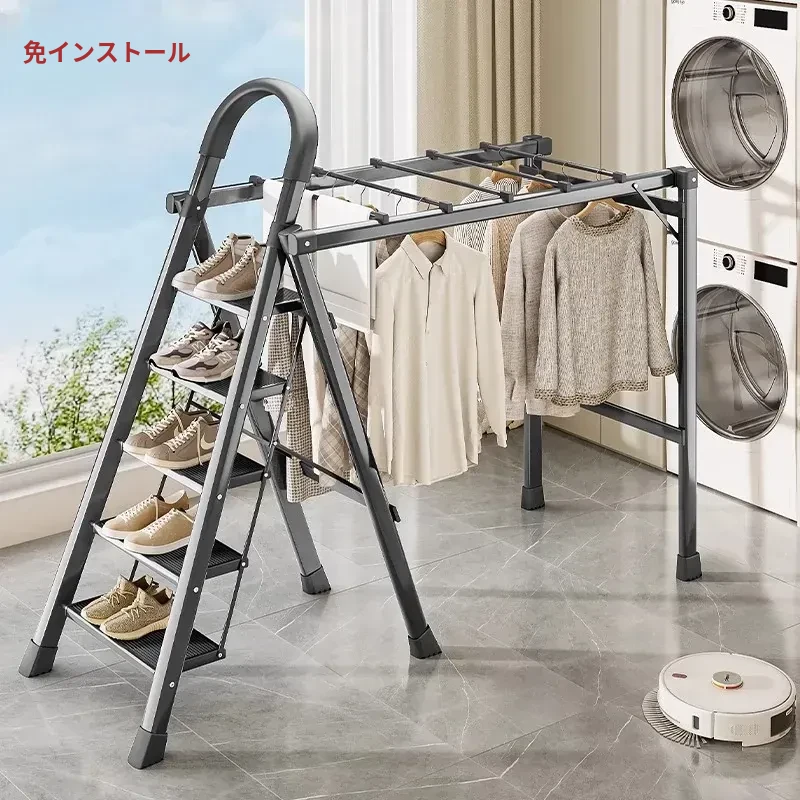 折りたたみ式物干しハンガー兼用はしご - 厚手の屋内用人字梯子!多機能で伸縮自在、家庭用の便利な衣類干し。おしゃれで実用的なデザインで、部屋をスッキリ整理!