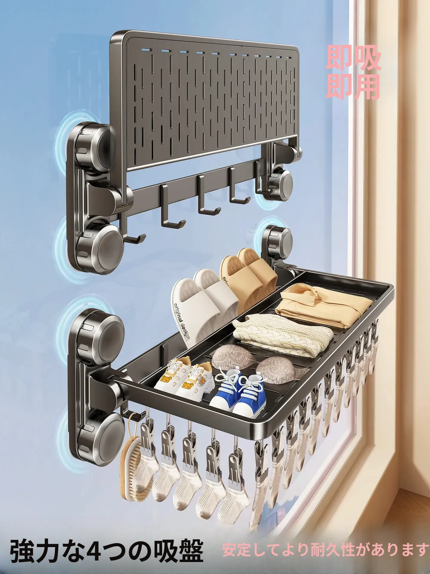 バルコニー用の隠れた吸盤式物干しラック!スペースアルミ製で穴を開けずに取り付け可能。窓際で洗濯物を簡単に干せる伸縮ネット!靴下や靴も楽々乾燥できる便利アイテムです!