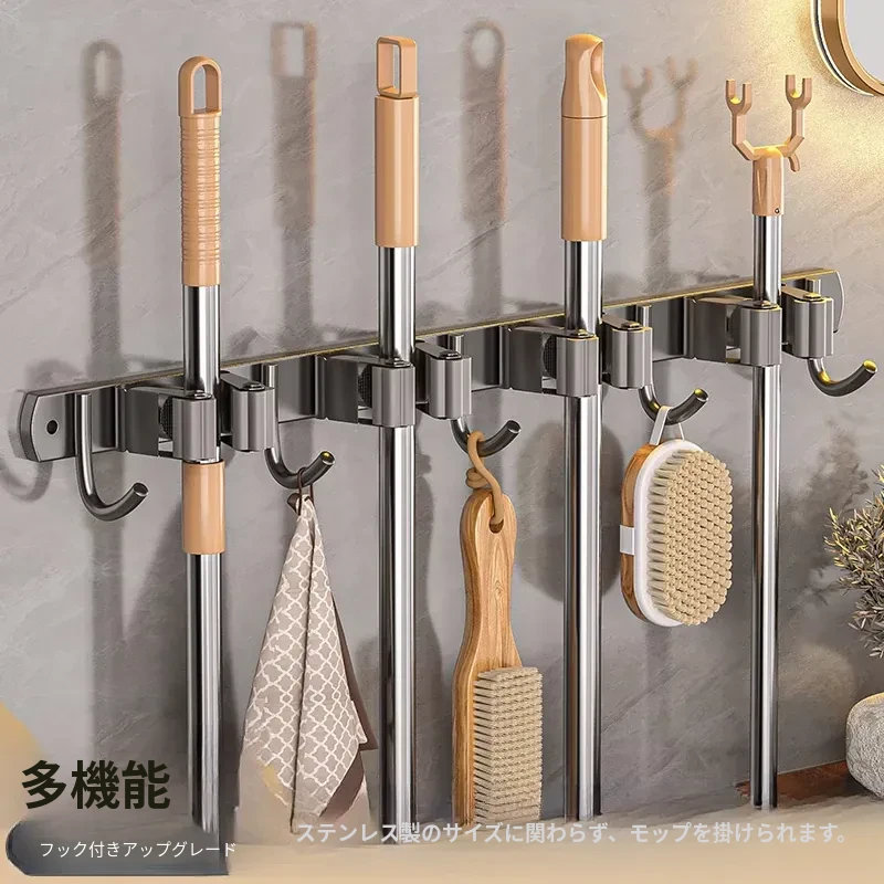 ステンレス製モップ壁掛けクリップ、穴あけ不要でトイレのモップ収納に最適!固定クリップ付きで、掃除道具をスッキリ整理。便利なフックで掃除がもっと快適に!