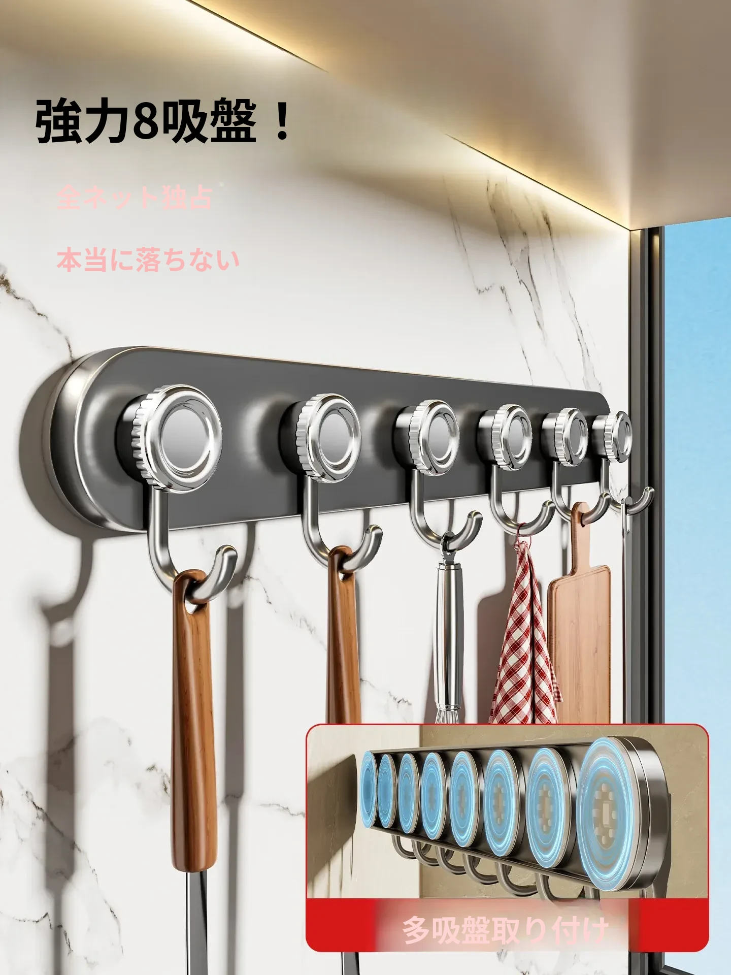 吸盤式キッチンフック&ハンガーバー - 鍋やスプーンもすっきり収納!穴あけ不要の壁掛け収納ラックで、スッキリとしたキッチン空間を実現します。