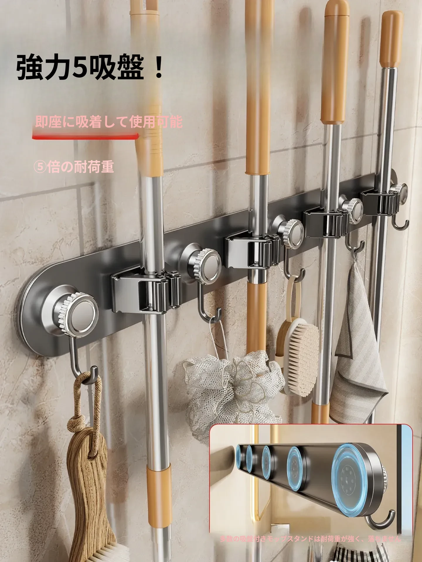 ドーパミン吸盤モップクリップ 壁掛け掃除道具 無打孔で取り付け可能なトイレ・バスルーム収納ラック・便利な魔法のアイテム!整理整頓を簡単に!
