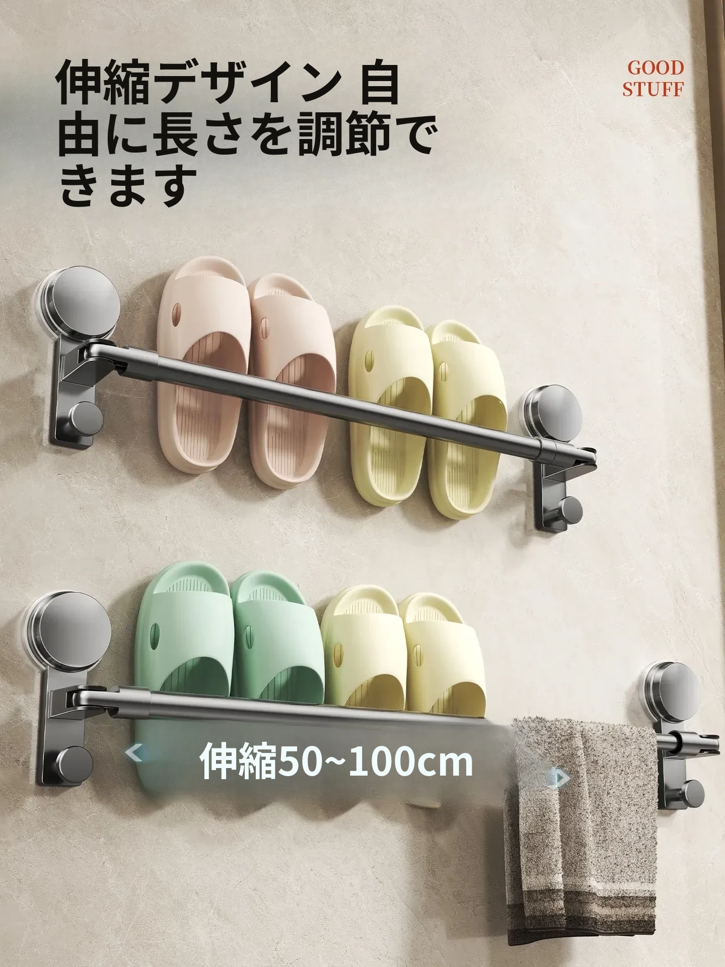 吸盤付き伸縮スリッパラック - バスルームで簡単取り付け!穴あけ不要、トイレや浴室の後ろにぴったり収まるスリッパ収納。水切り機能付きで、清潔さを保ちながらスペースを有効活用!
