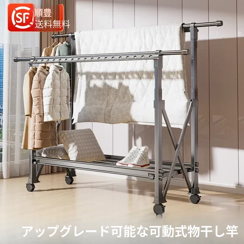 室内用折りたたみ式移動式物干しスタンド - バルコニーでも活躍!布団や衣類が簡単に干せる便利な伸縮式ハンガーです。スペースを有効活用し、毎日の洗濯をもっと快適に!