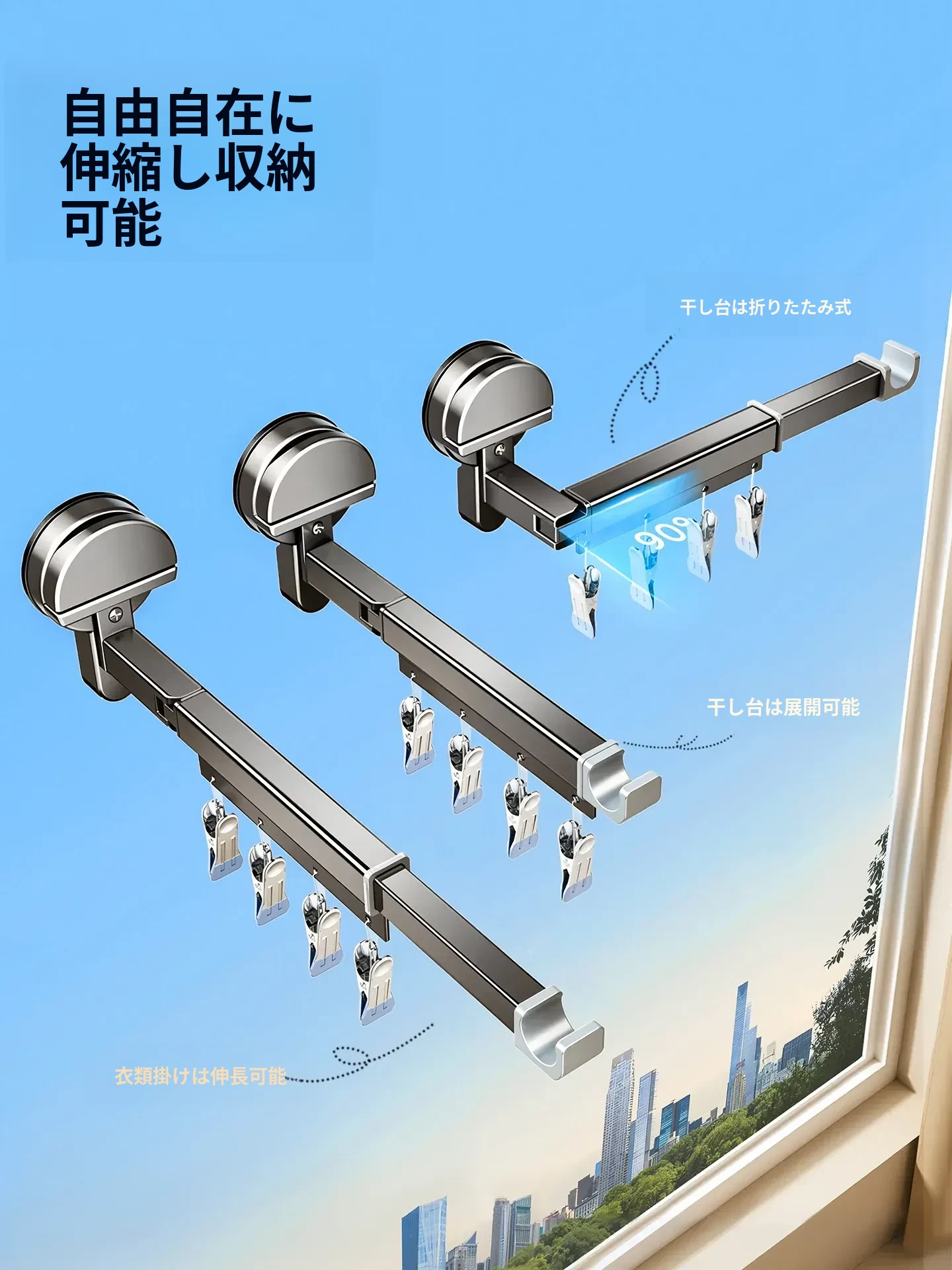 吸盤式折りたたみ物干しハンガー|隠れた伸縮機能で室内でも使える!バルコニーに最適な布団干し&衣類干しの必需品!家族のための便利アイテム!