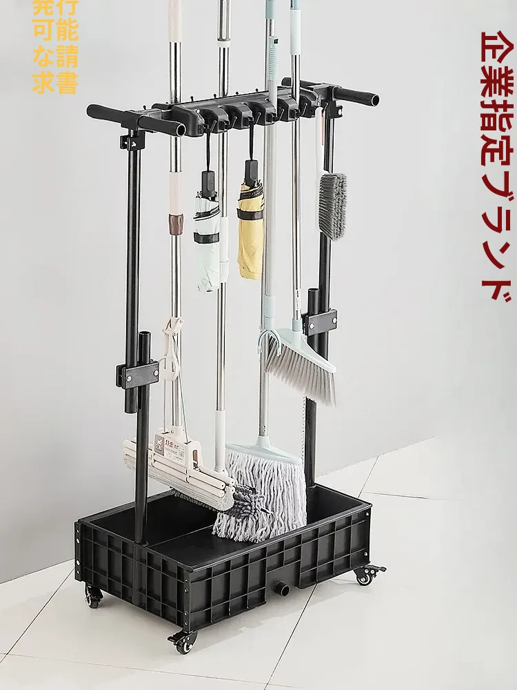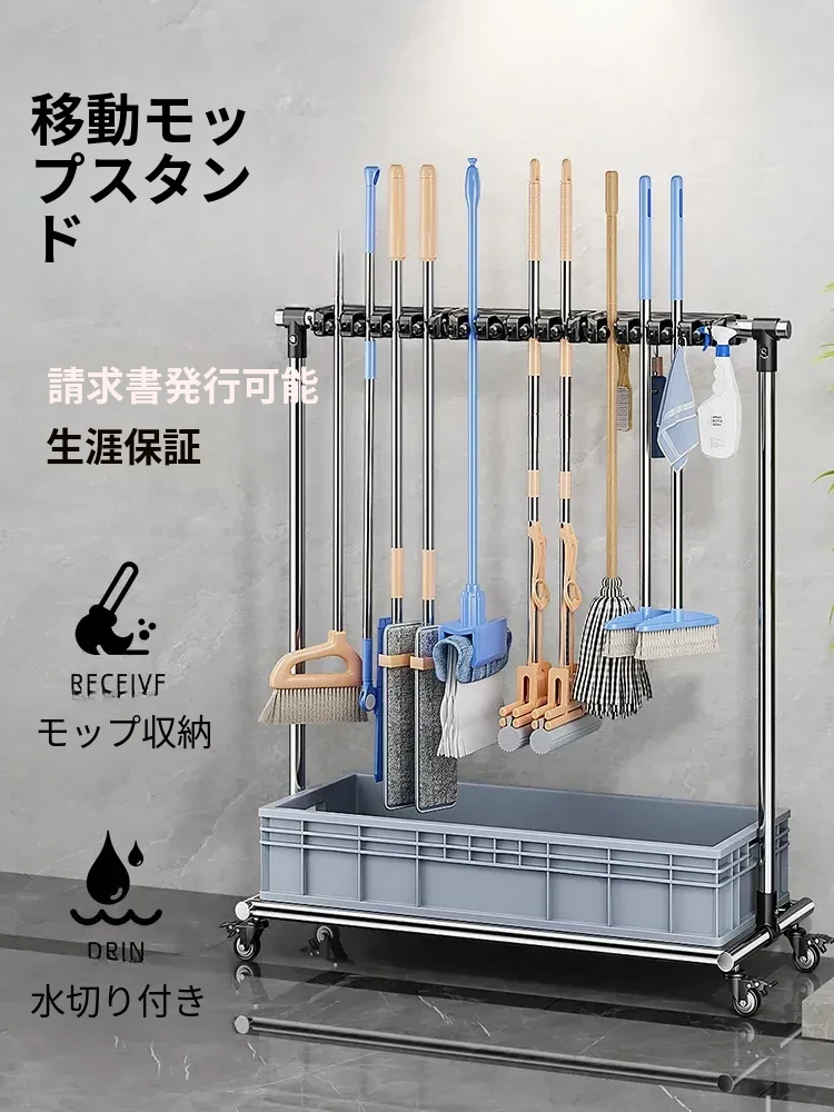 スタイリッシュな移動式モップスタンド!掃除道具をすっきり整理できる便利な収納ラック。学校や家庭で大活躍!水切り機能付きのステンレス製ハンガーで、清潔感を保ちながら、効率的にお掃除をサポートします。
